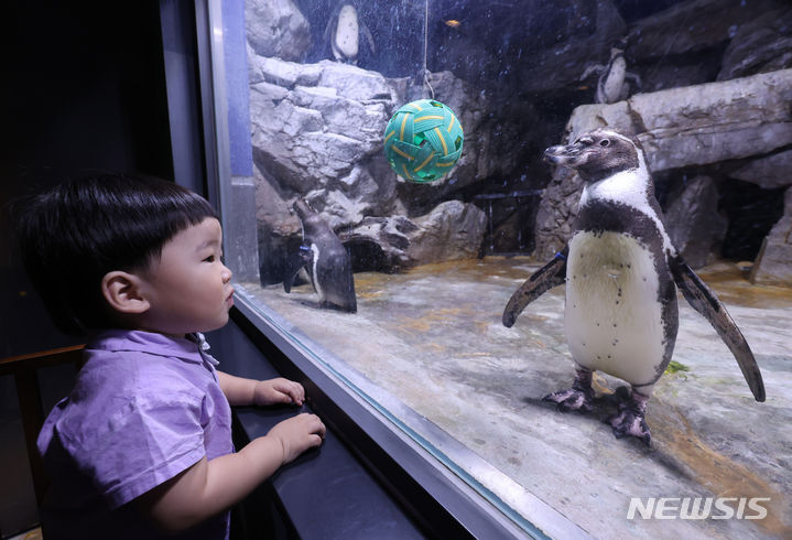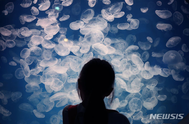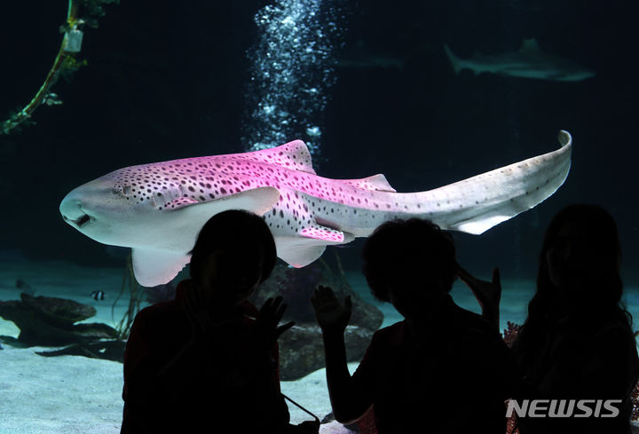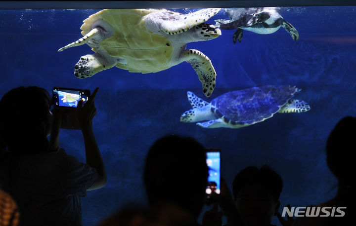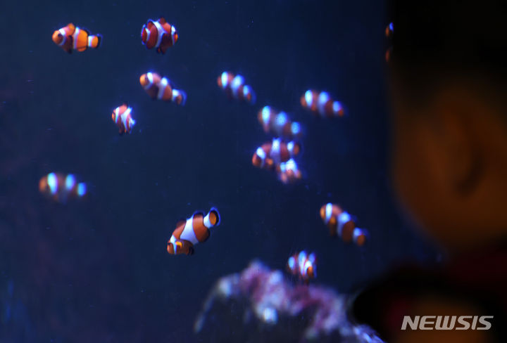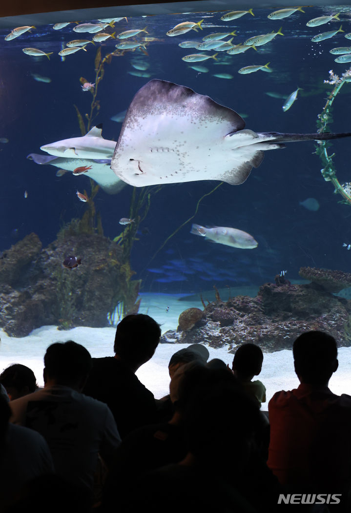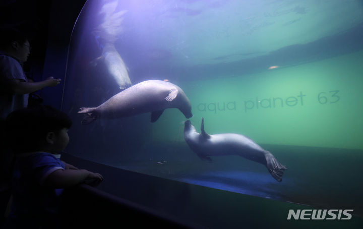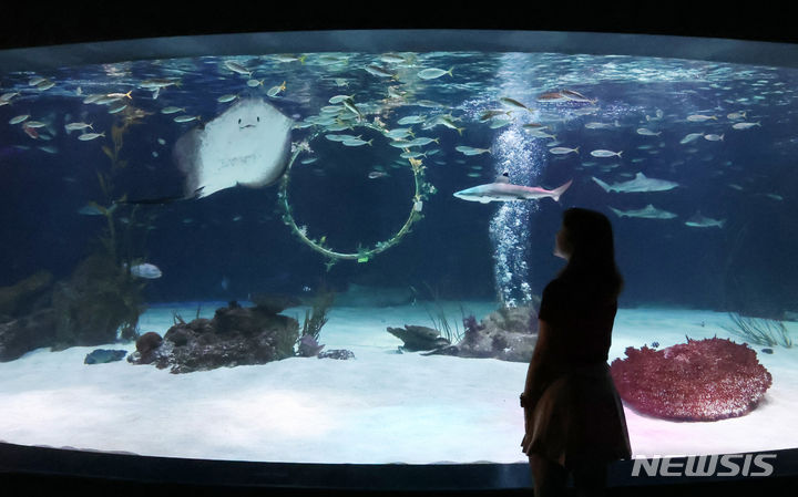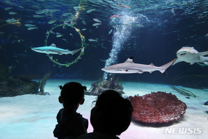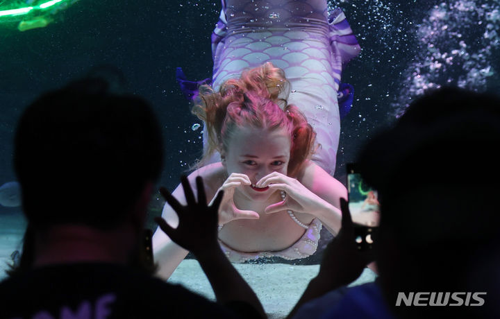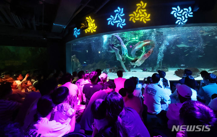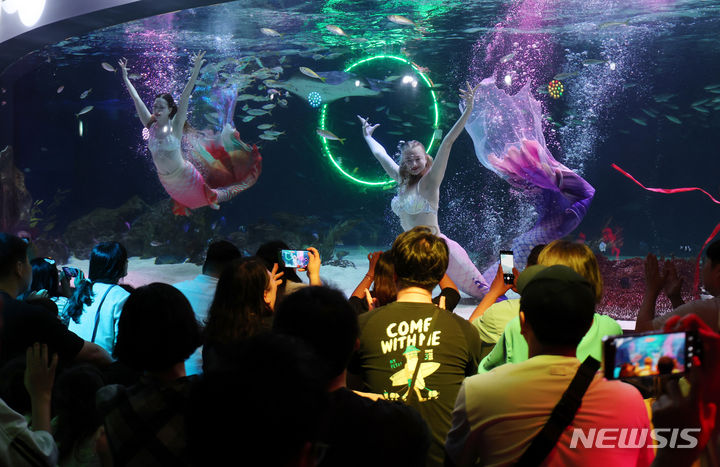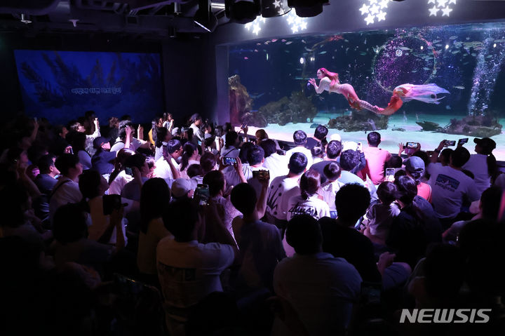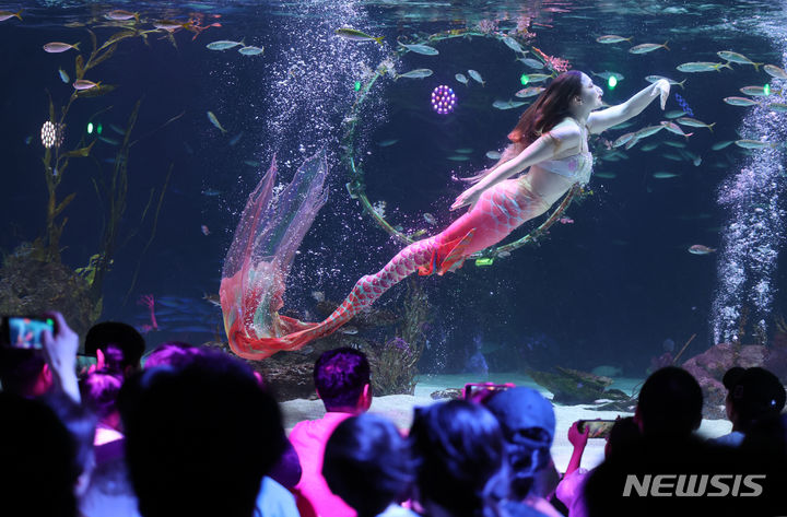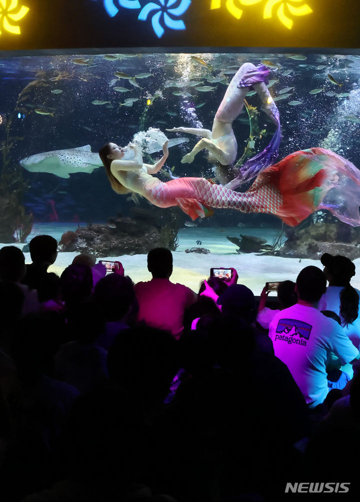 【NEWSIS】地上60階建てのビル「63ビル」(ソウル市永登浦区)にある水族館「アクアプラネット63」と展望台「63アート」の閉館日である30日、アクアプラネット63を訪れた人々。「人魚姫公演」を鑑賞して楽しんだ。