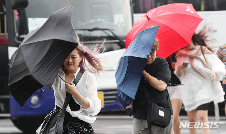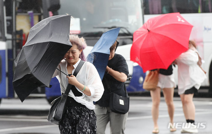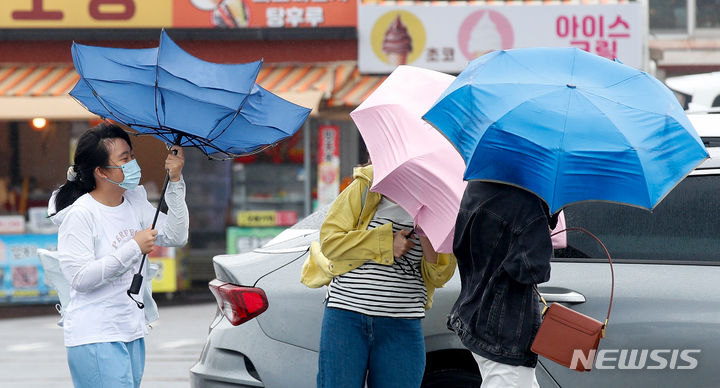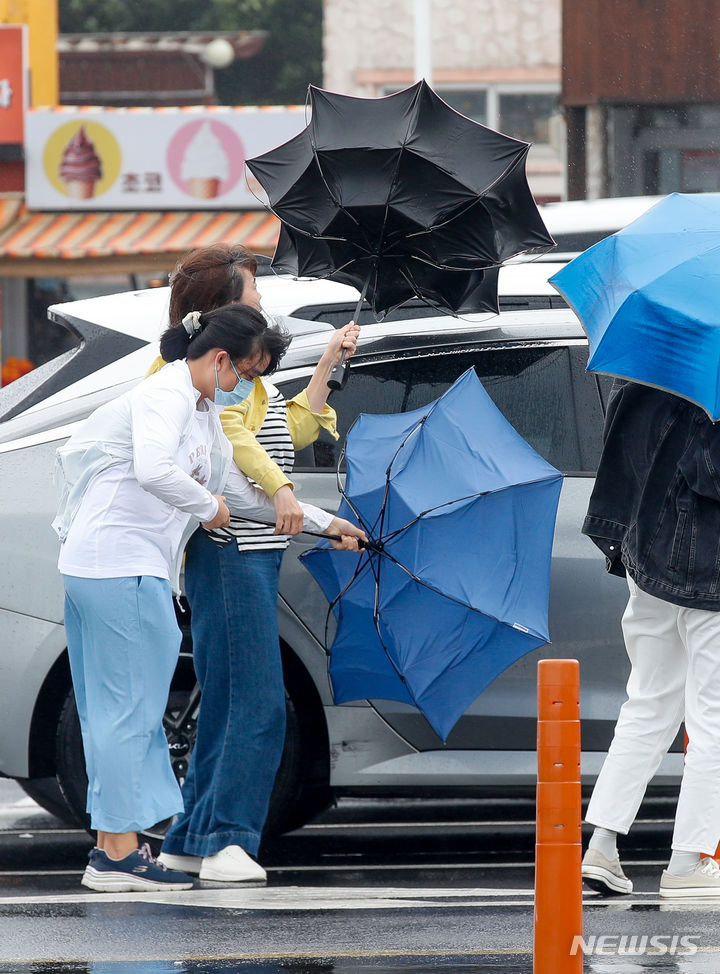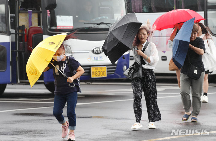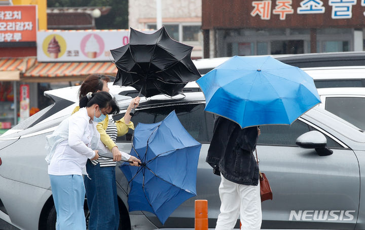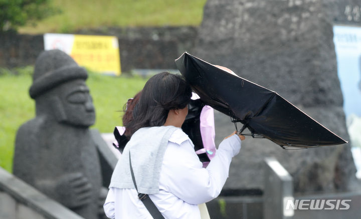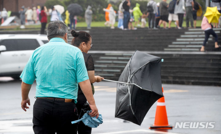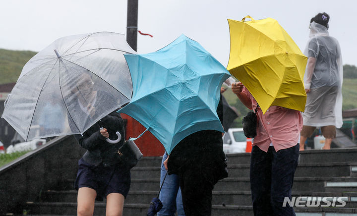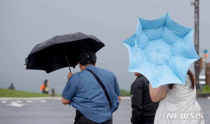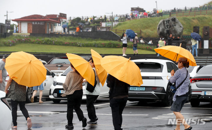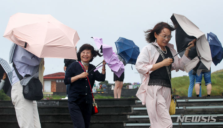 【NEWSIS】梅雨前線の影響で雨が降った30日午後、済州道西帰浦市の観光スポット「城山日出峰」を訪れた外国人観光客たち。強い風雨の中、傘をさして歩いていた。