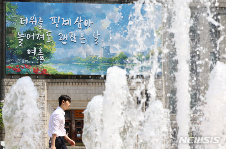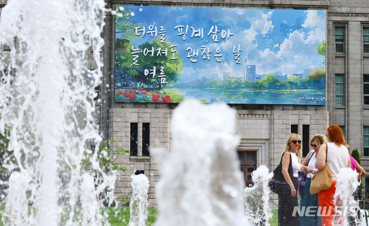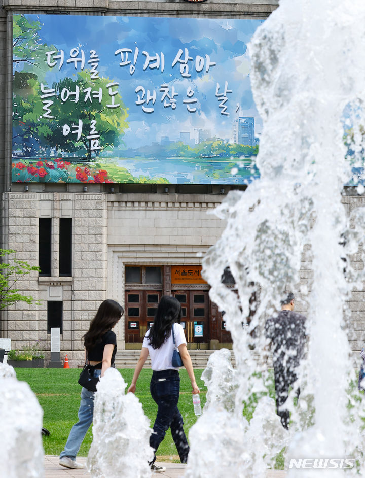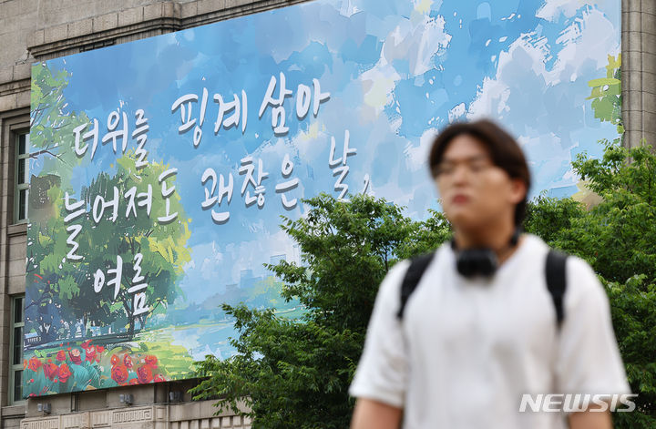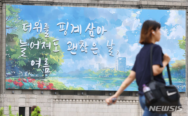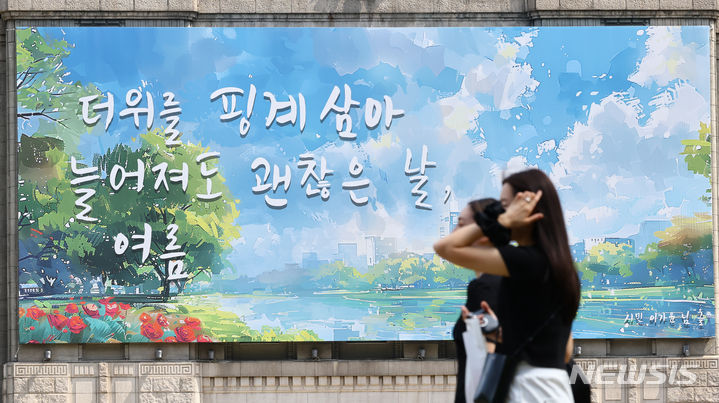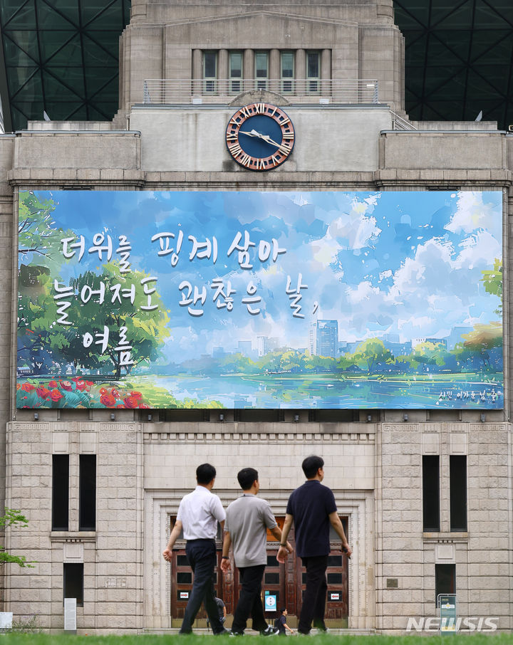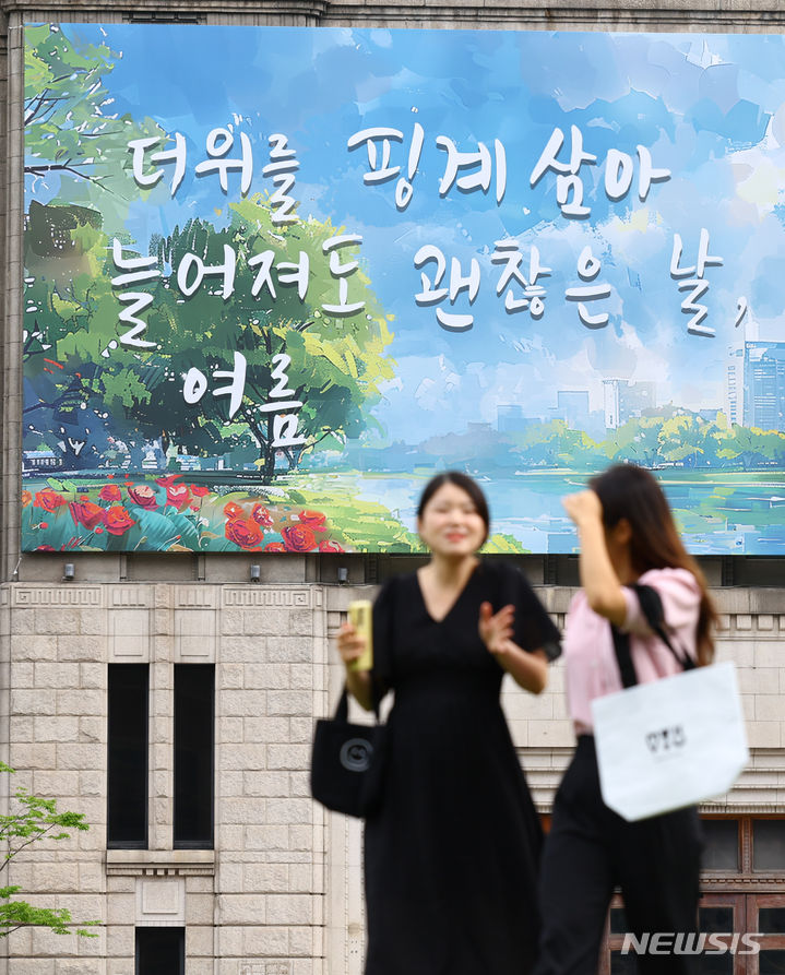 1日、夏を迎えて装い新たな、ソウル図書館外壁「ソウル・夢を刻むパネル」(ソウル市中区)前を行き交う市民の様子。ソウル市は、春・夏編「夢を刻むパネル」文案公募選定作品の中から、イ・ガユンさんの「暑さを口実にしてぐったりしても大丈夫な日、夏」を、パネルに合わせたイメージ作業を経て夏編として掲示した。