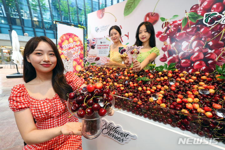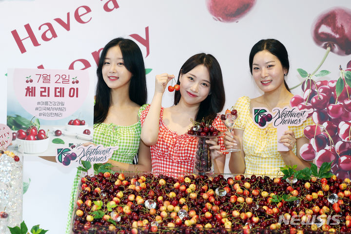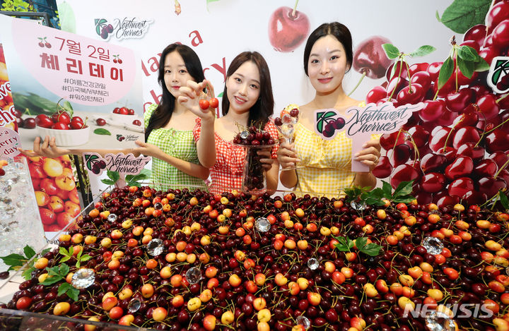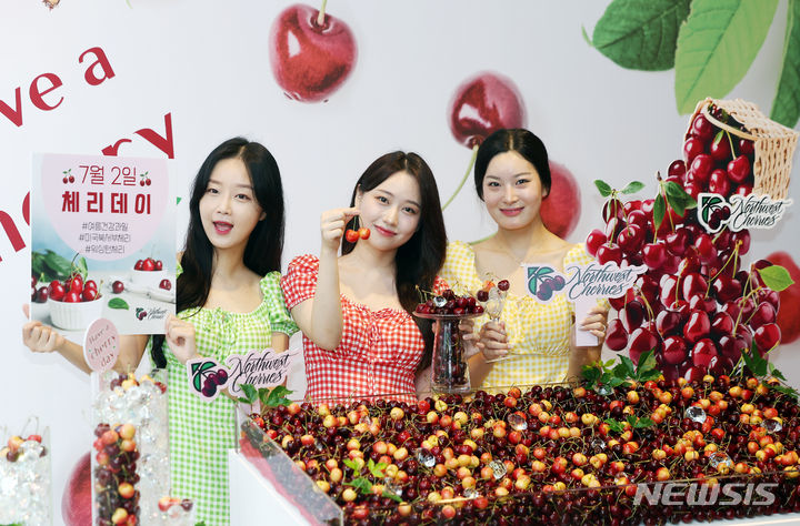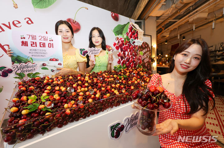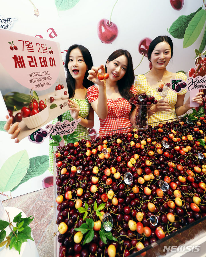 2日午前、ソウル市瑞草区のGTタワーで行われた米国北西部チェリー協会主催の「チェリーデイ」イベントで、コンパニオンらがチェリーをPRした。チェリーデイは、韓国語で7月2日を「チリ」と呼び、チェリーと発音が似ていることから付いた名前で、米国北西部チェリー協会は毎年、ワシントン産チェリーのおいしさをPRするためにこのイベントを開催してきた。