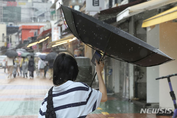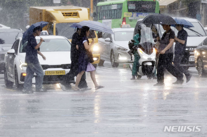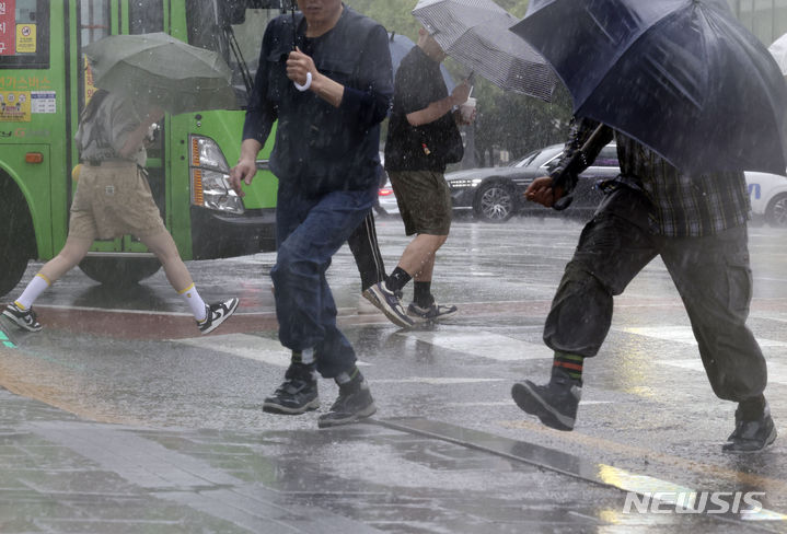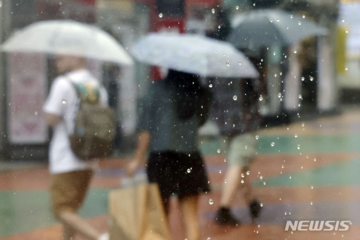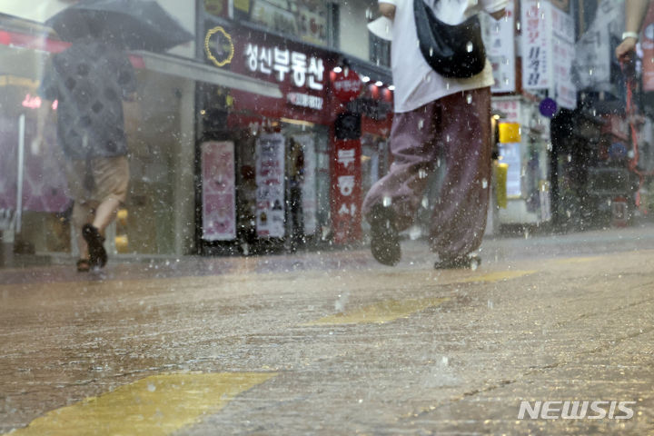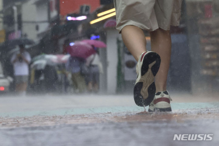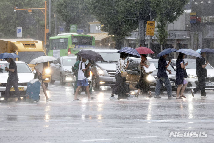 活発な梅雨前線の影響で大雨が降った2日、ソウル市内の地下鉄弘大入口駅付近では、市民らが降りしきる雨の中を足早に歩いていた。