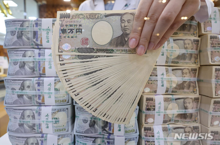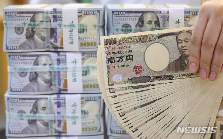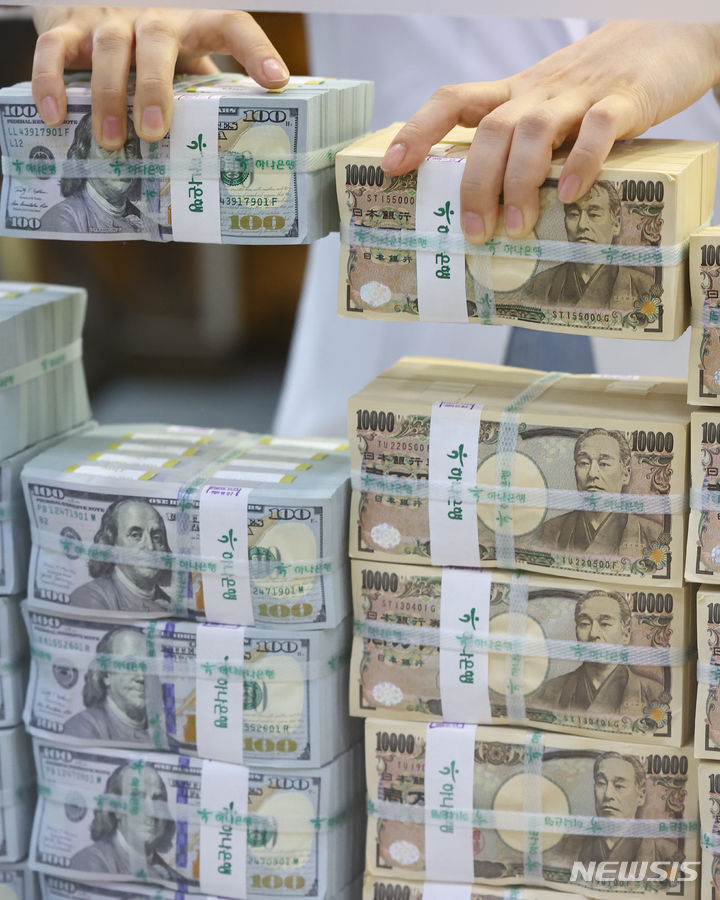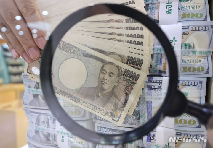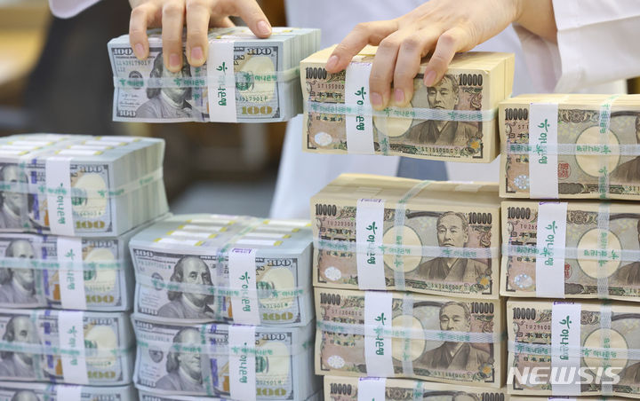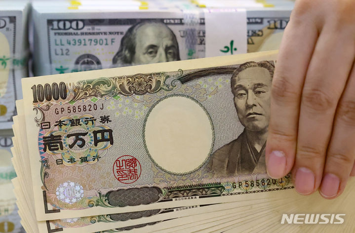 【NEWSIS】ソウル市中区のハナ銀行偽変造対応センターで、行員が日本円と米ドルを整理している様子。前日、ニューヨーク外国為替市場では一時1ドル161.72円まで円が値下がりし、1986年12月以来37年6カ月ぶりの円安水準を記録した。