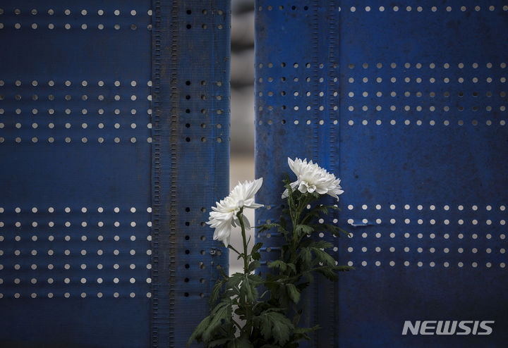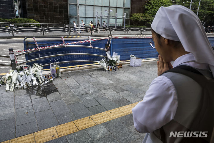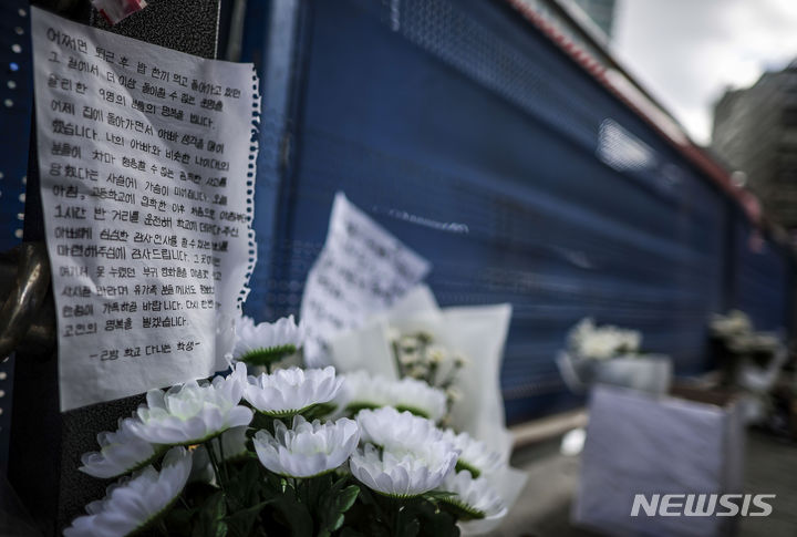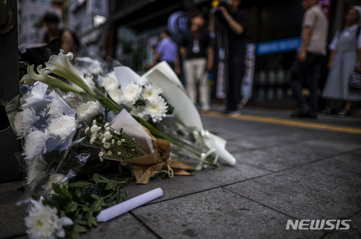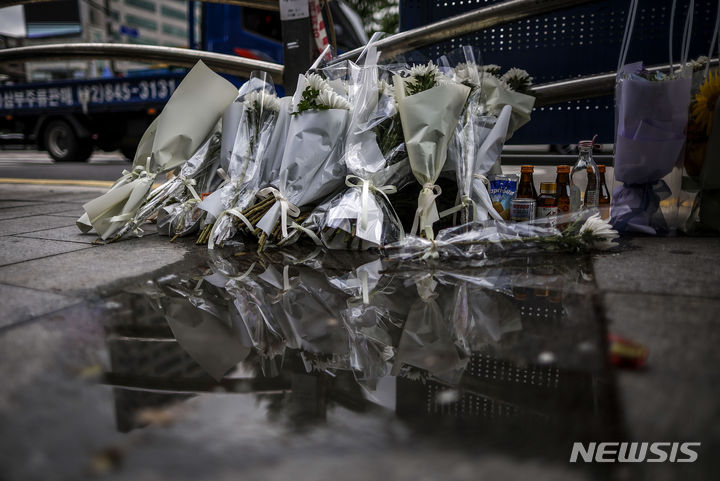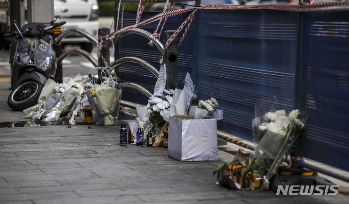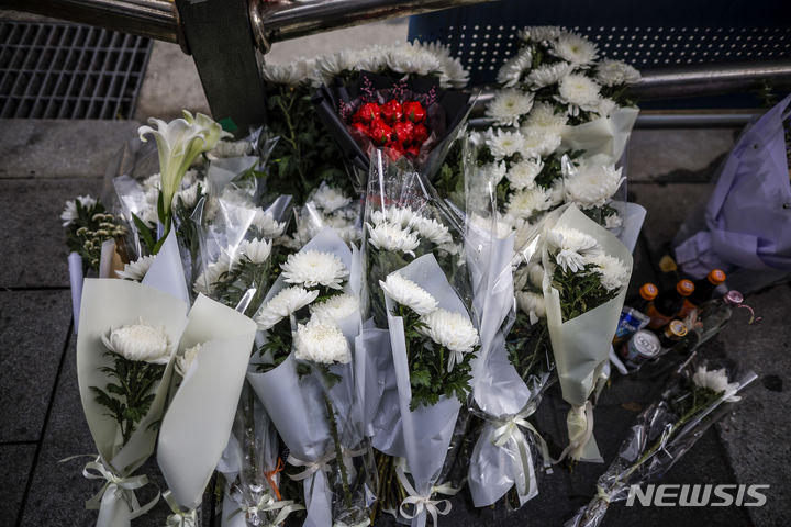 【NEWSIS】ソウル市中区の市庁駅交差点付近で1日に発生した逆走車の突進による交通事故。写真は3日、事故現場には犠牲者のために追悼の菊の花やメッセージなどが供えられていた。