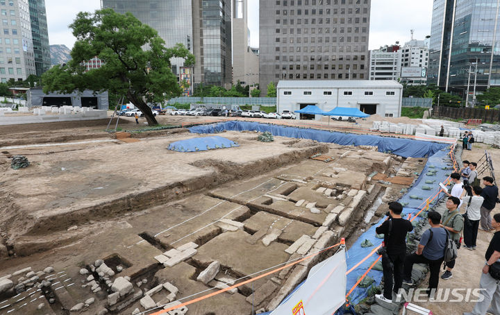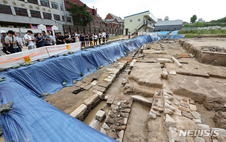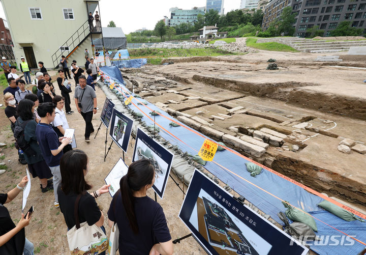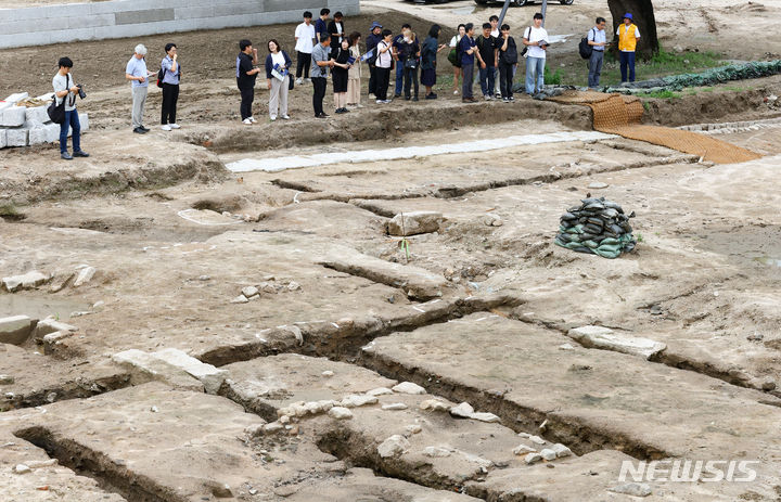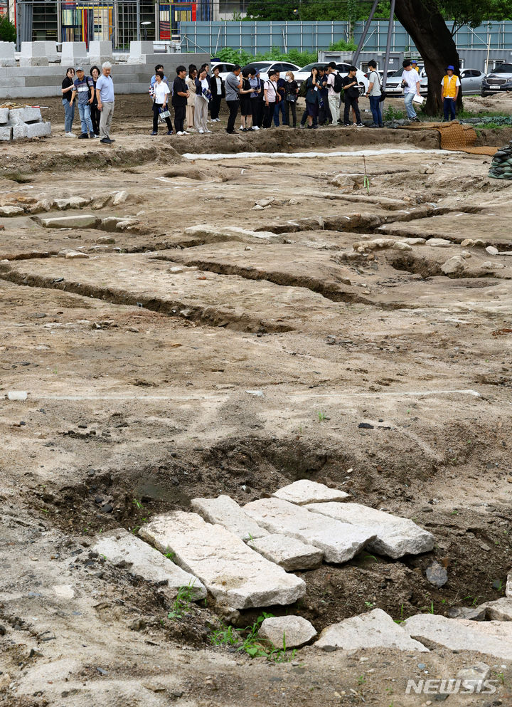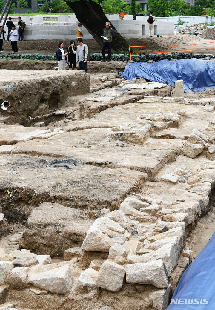 【NEWSIS】ソウル市中区の徳寿宮興徳殿で3日に開かれた「徳寿宮興徳殿圏域発掘現場公開行事」で、参加者らが現場を見て回っている様子。