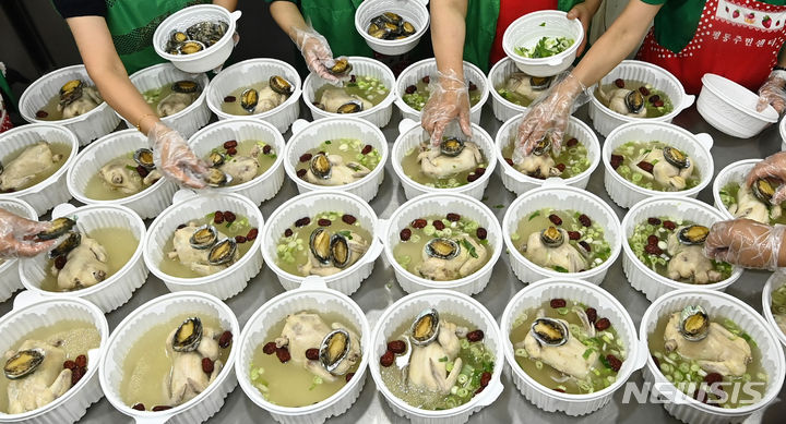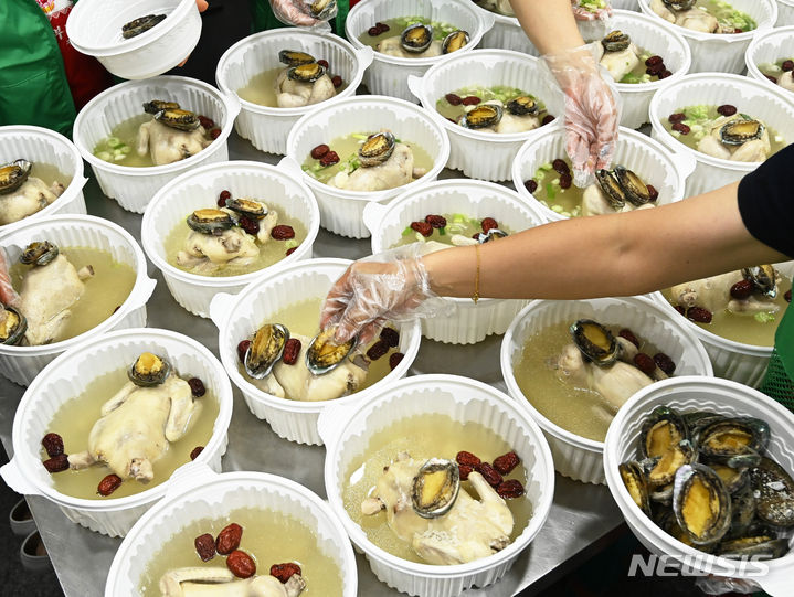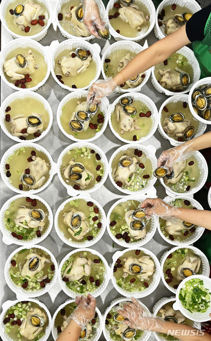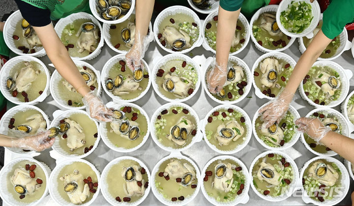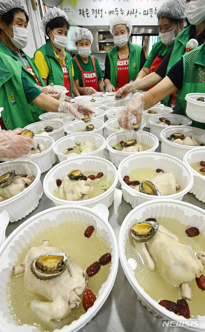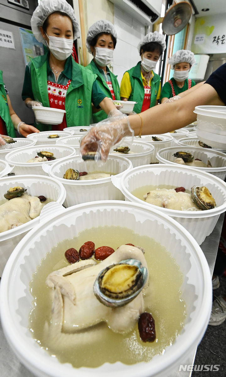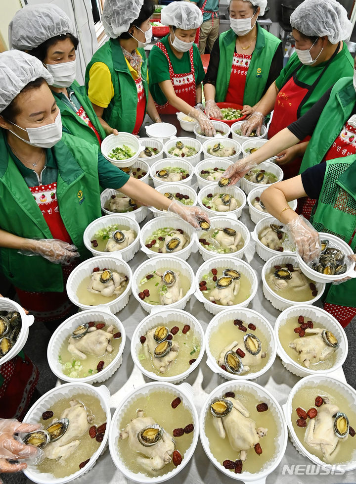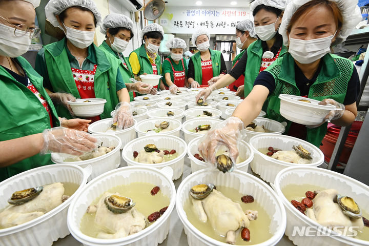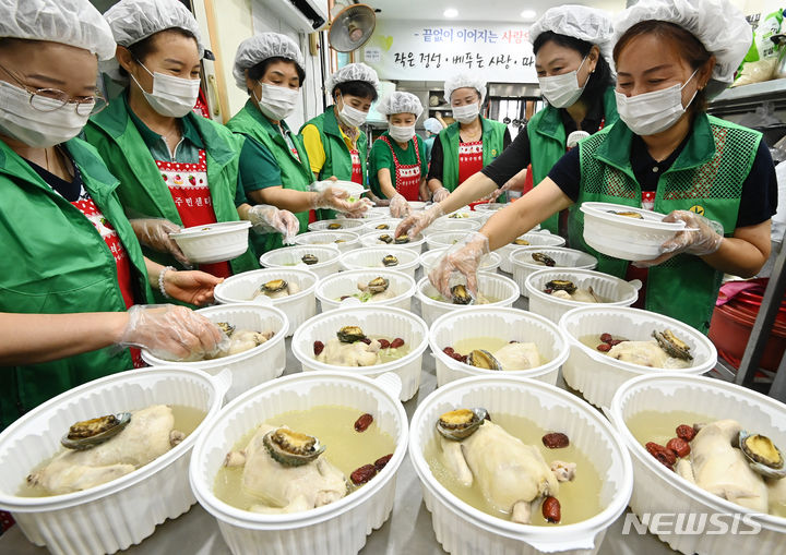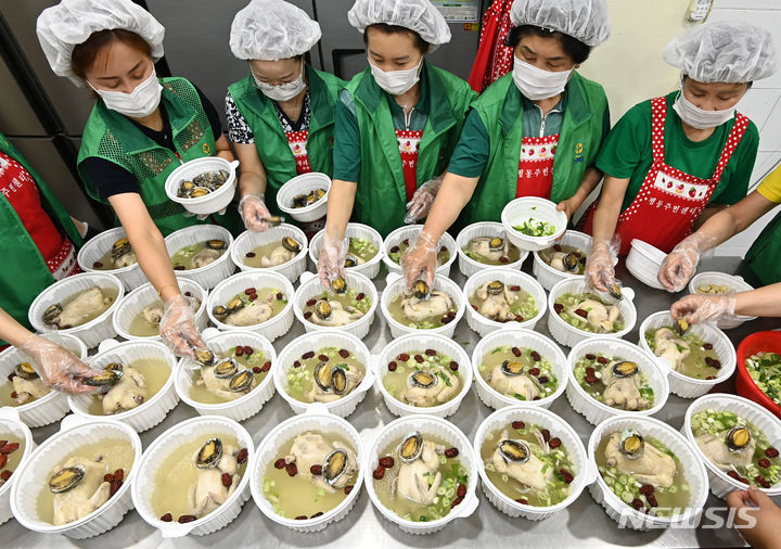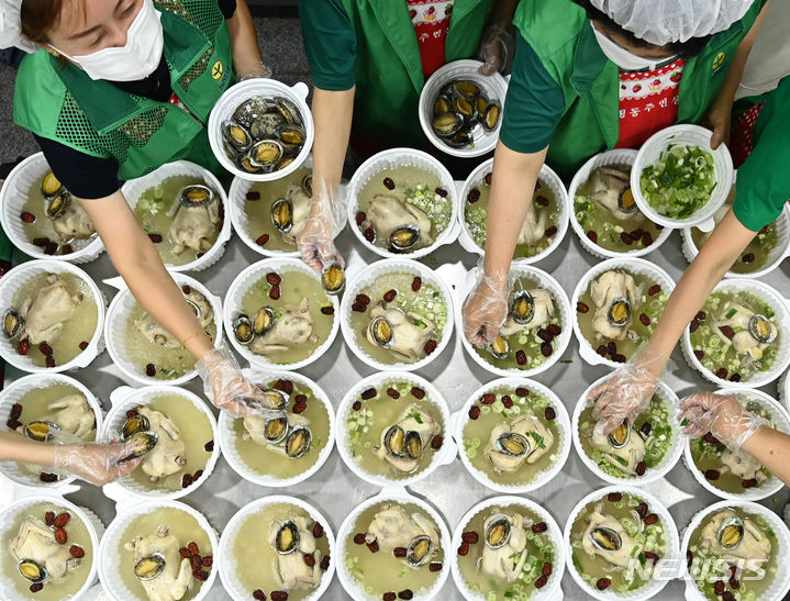 初伏(三伏の一つ、夏至後の3回目の庚〈かのえ〉の日)を六日後に控えた9日、京畿道水原市勧善区の坪洞行政福祉センターでセマウル婦女会のメンバーたちが、管轄するエリア内の一人暮らしの高齢者など、恵まれない人たちに配る参鶏湯(サムゲタン=丸鶏の中に韓方薬の材料やもち米を詰めたスープ)をつくり、容器につめていた。