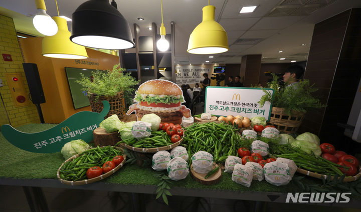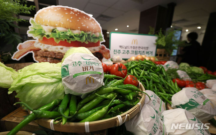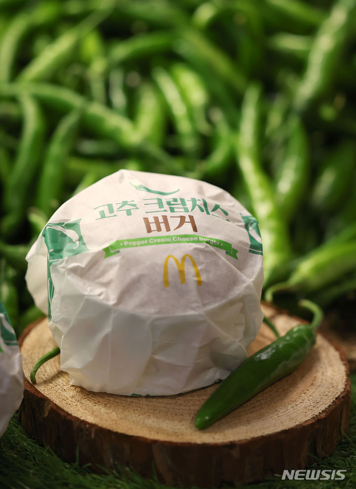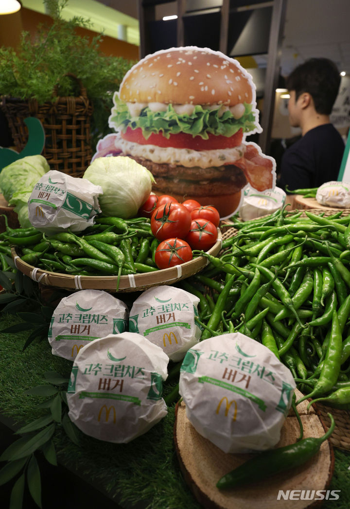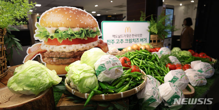 【NEWSIS】10日、ソウル市江南区のマクドナルド新沙駅店で、「2024韓国マクドナルド 韓国の味 新メニュー試食会」が行われた。写真は11日に発売される「マクドナルド 韓国の味プロジェクト」の晋州唐辛子クリームチーズバーガーやマフィンなどの新メニュー。唐辛子の産地として有名な慶尚南道晋州市の唐辛子が使われている。