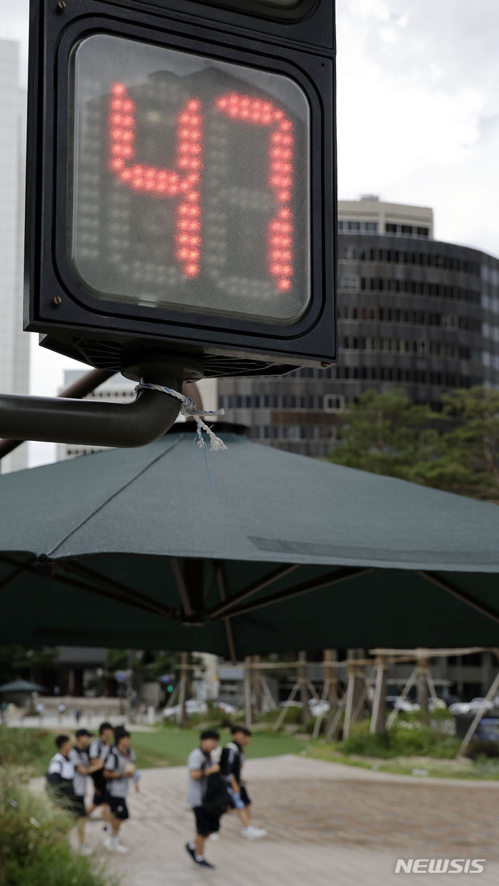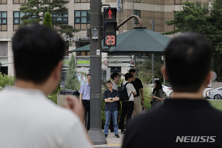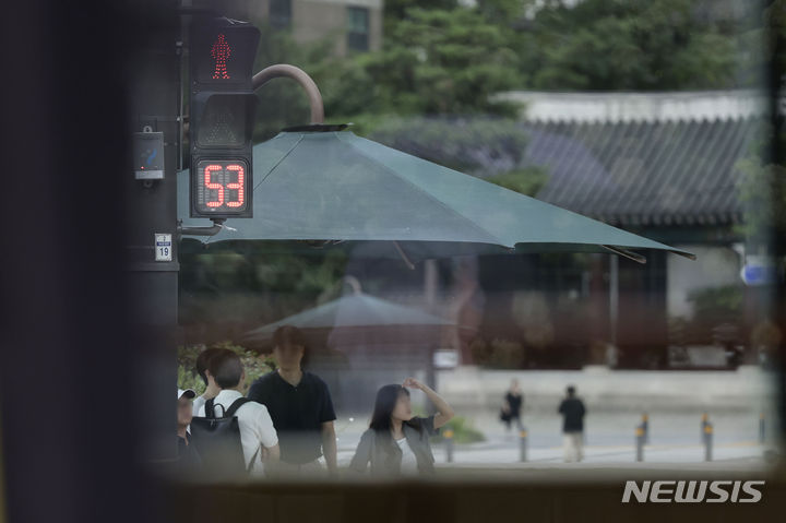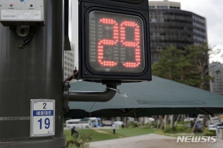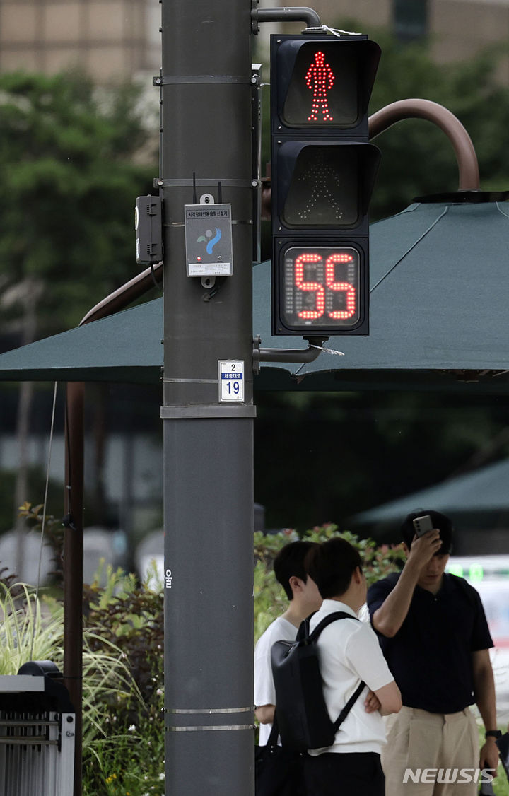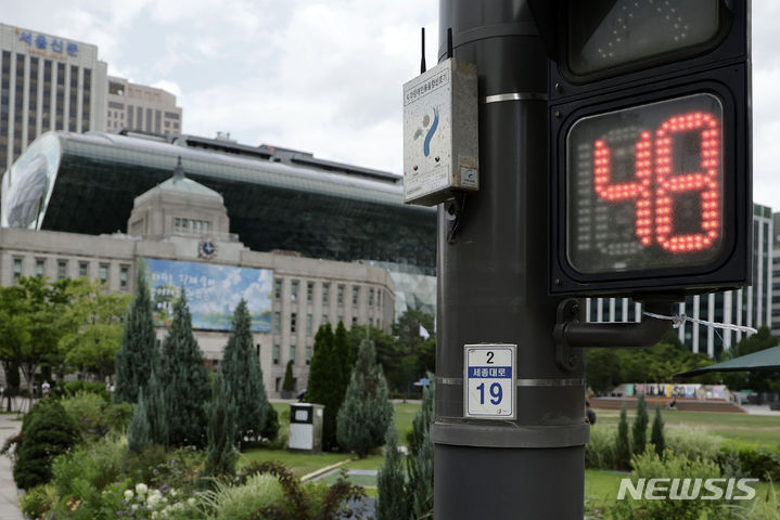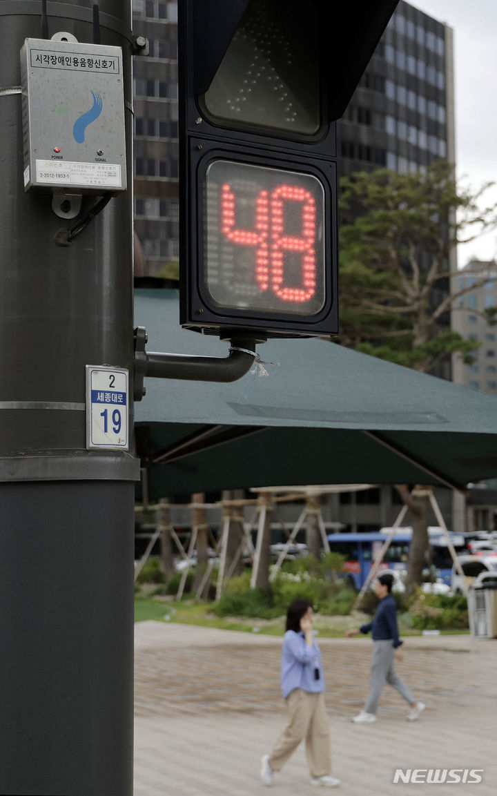 【NEWSIS】15日、ソウル市中区のソウル市庁前の横断歩道に取り付けられた、赤信号の残り時間を表示する試験運営用の信号機。ソウル市では現在、ソウル市庁や光化門近くなど8カ所で試験運営している赤信号残り時間表示信号機を、今年末までに明洞、弘大入口、江南駅など350カ所に設置する計画だ。