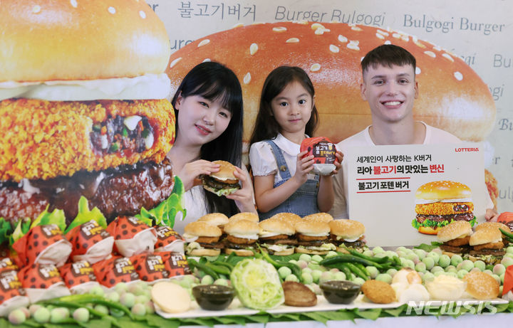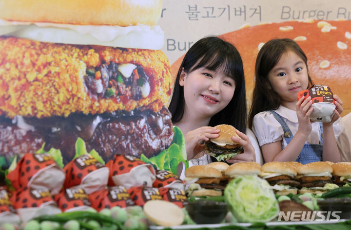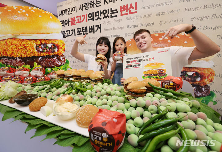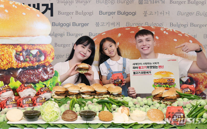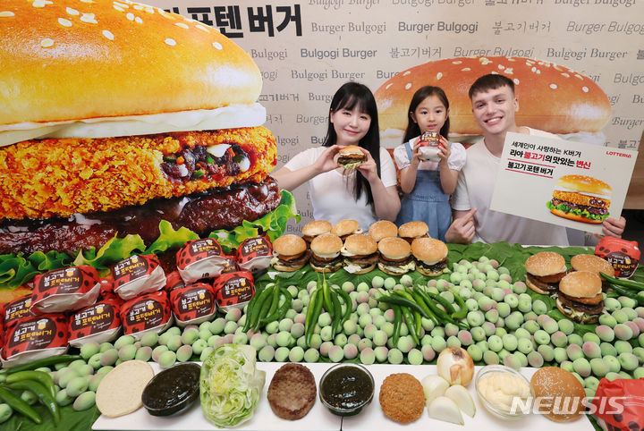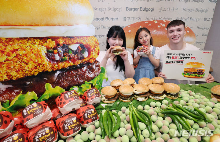 【NEWSIS】ソウル市竜山区のロッテリア淑大入口駅店で17日、コンパニオンがロッテリアの新製品「プルゴギポテンバーガー」のPRを行っているところ。