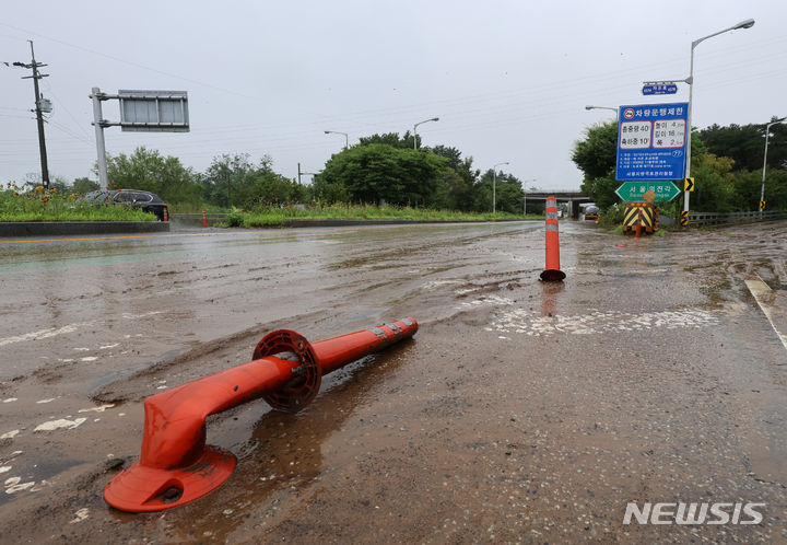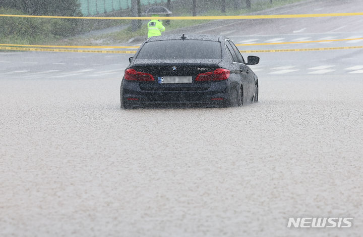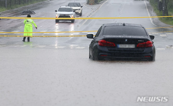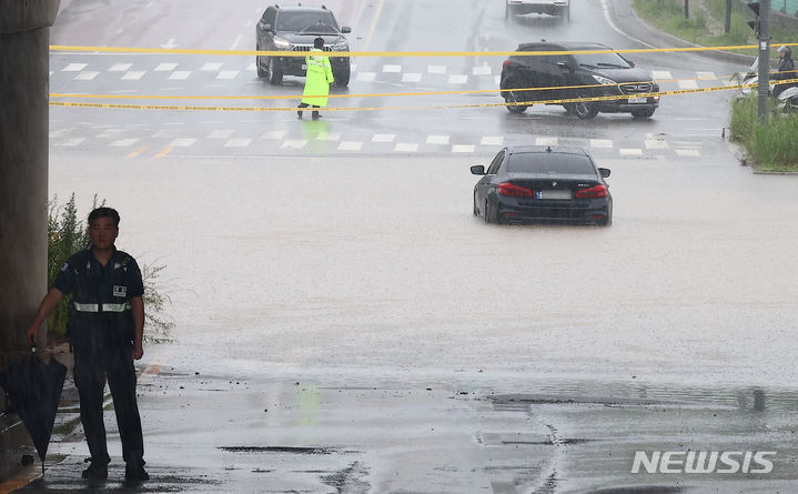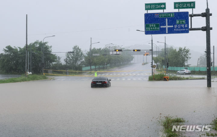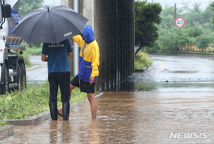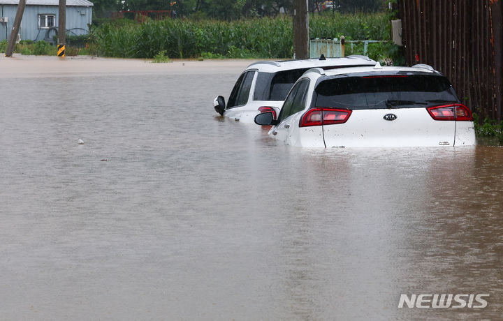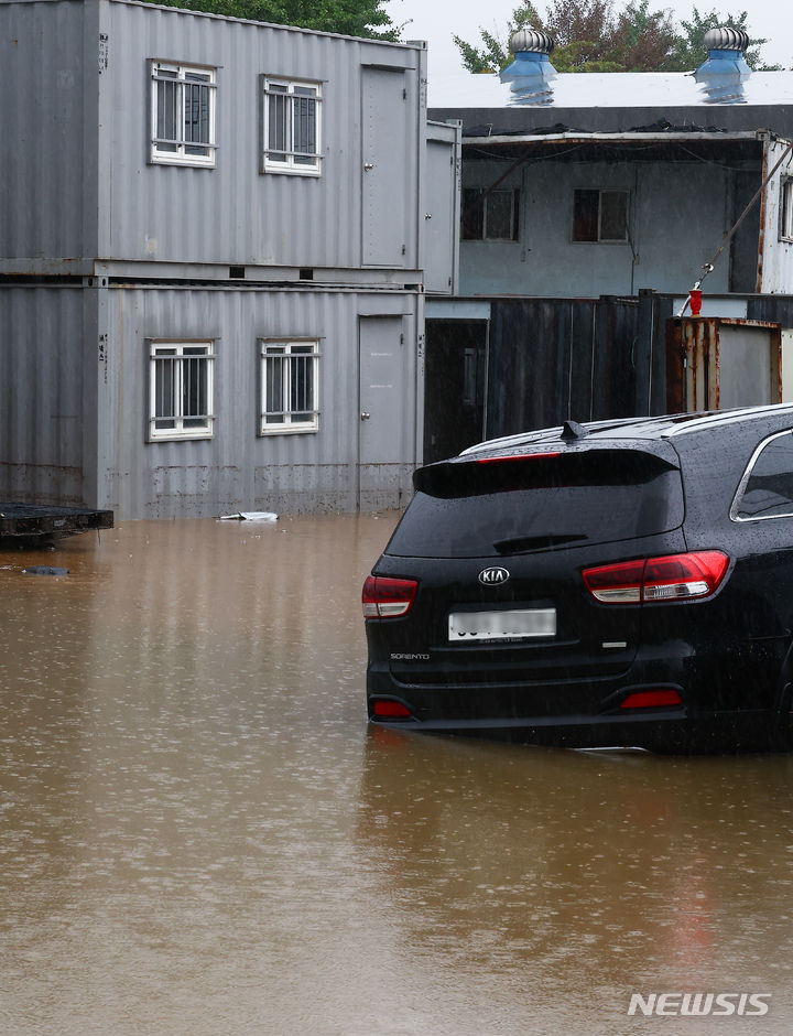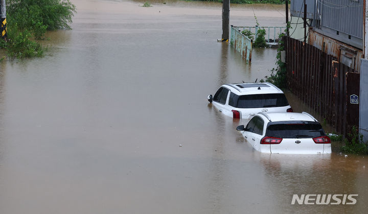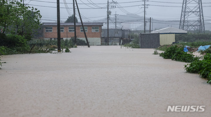 坡州地域に激しい雨が降った18日、京畿道坡州市月竜面付近の村が浸水している。