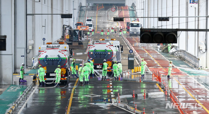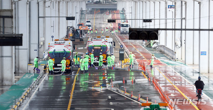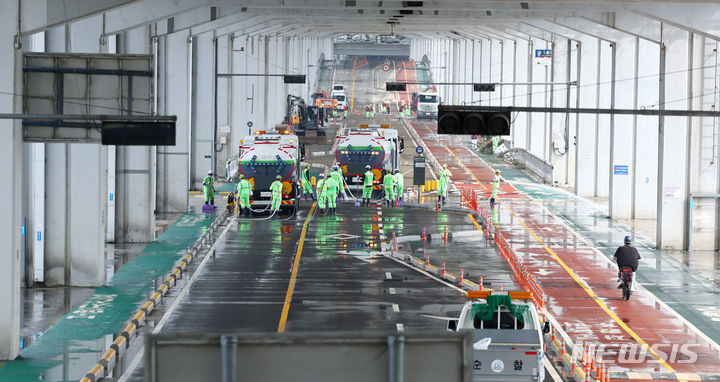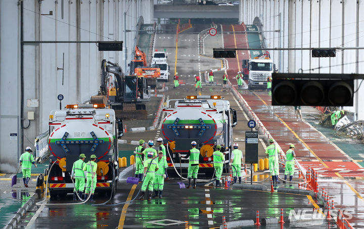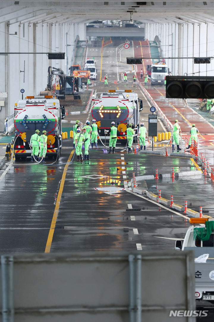【NEWSIS】大雨により漢江の水位が上がり、通行が規制されていたソウル市内の潜水橋で19日、通行再開のための清掃作業が行われた。