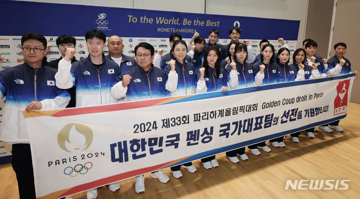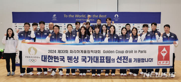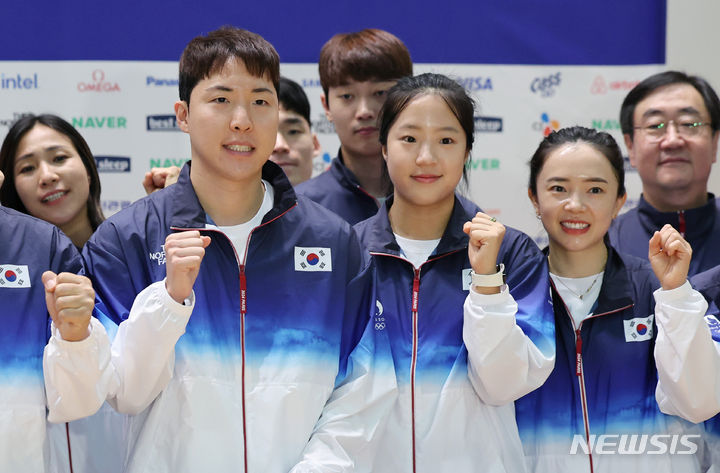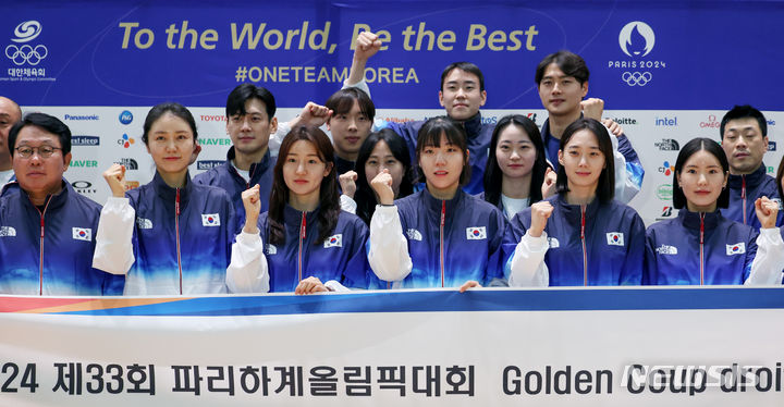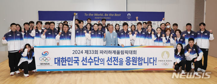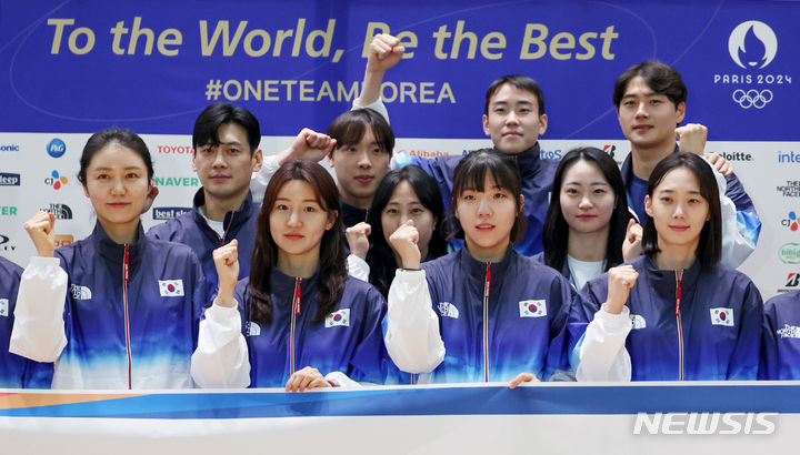韓国選手団、渡仏前に記念撮影 「パリ・オリンピック、ファイト」