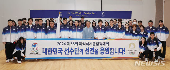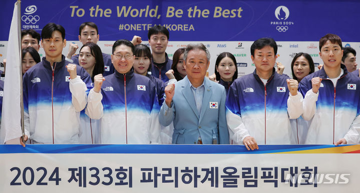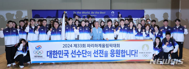 2024年パリ・オリンピックに出場する韓国選手団の本陣が20日、仁川国際空港第2旅客ターミナルで、出国を前に記念撮影に臨んだ。