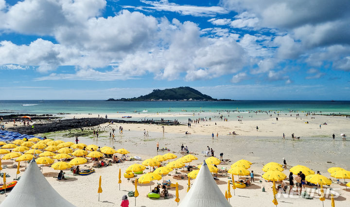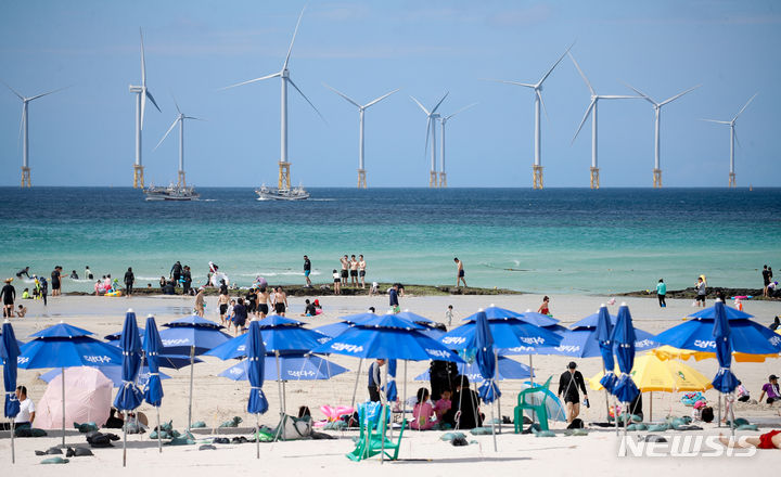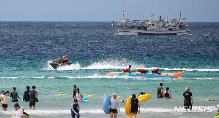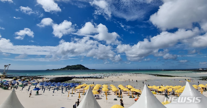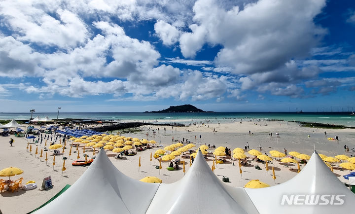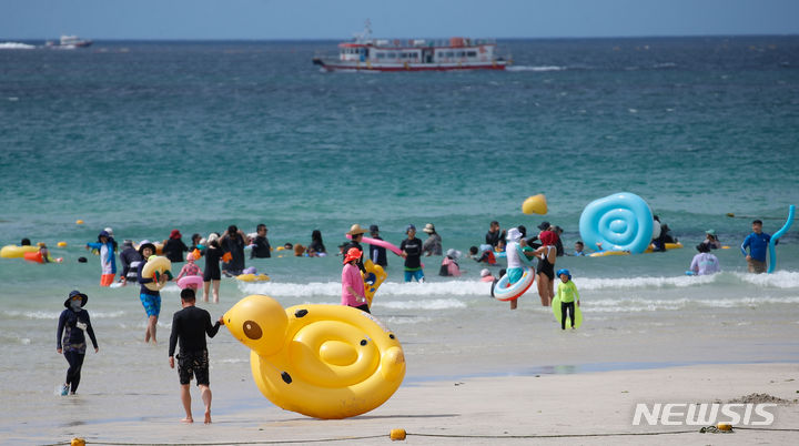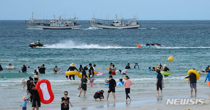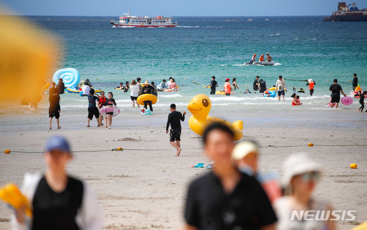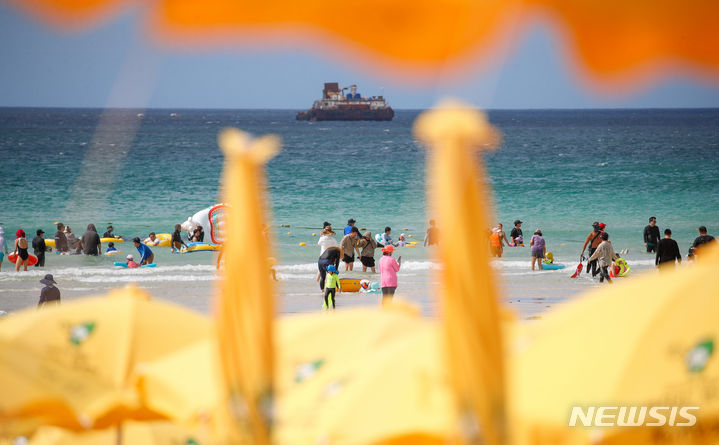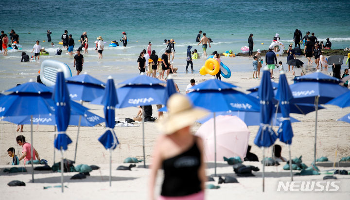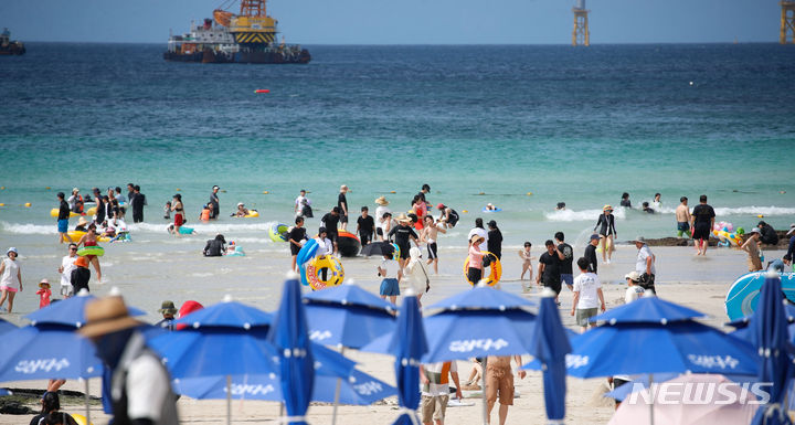【NEWSIS】猛暑特別警報が発令された21日午後、済州特別自治道済州市内の挟才海水浴場を訪れた海水浴客たちが夏の楽しいひとときを過ごしていた。