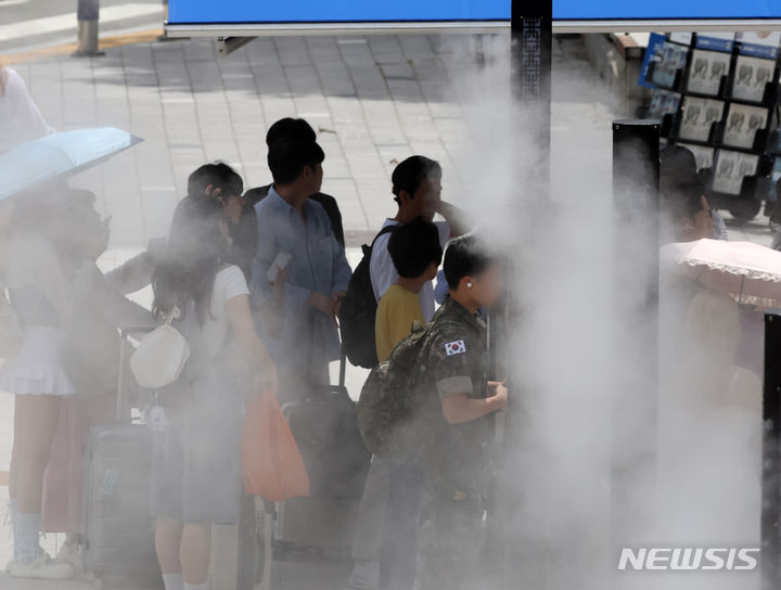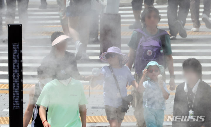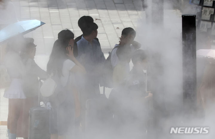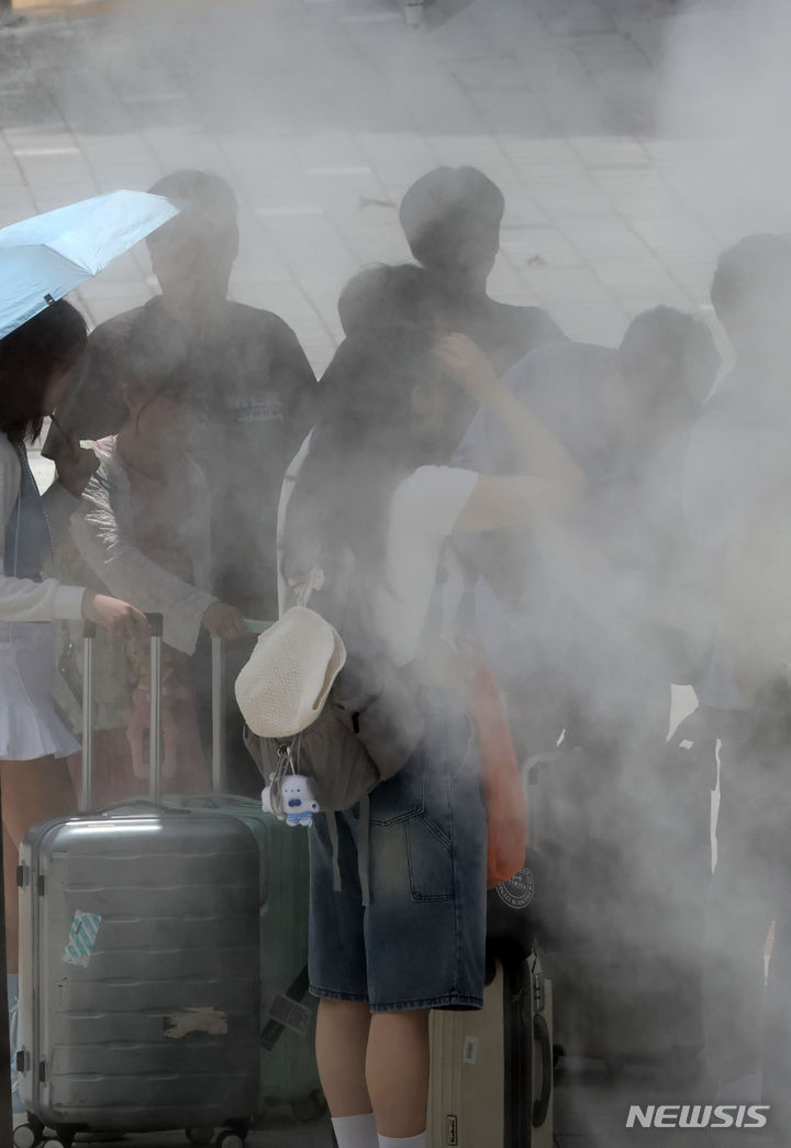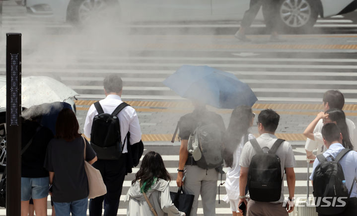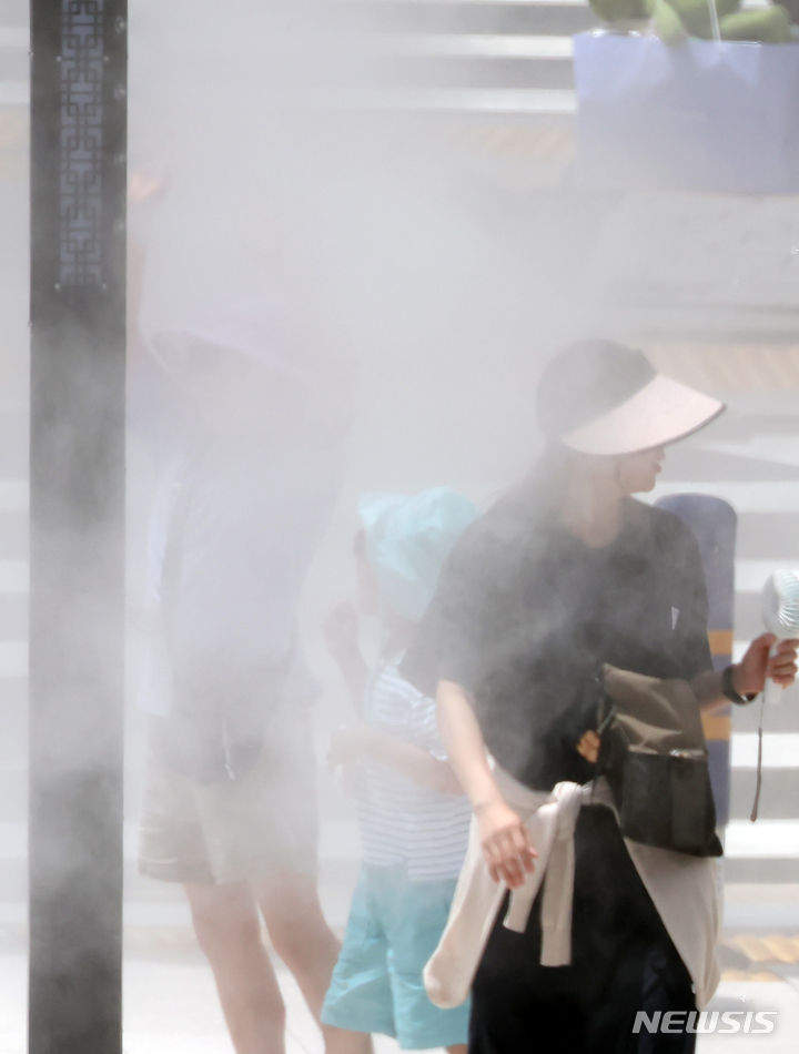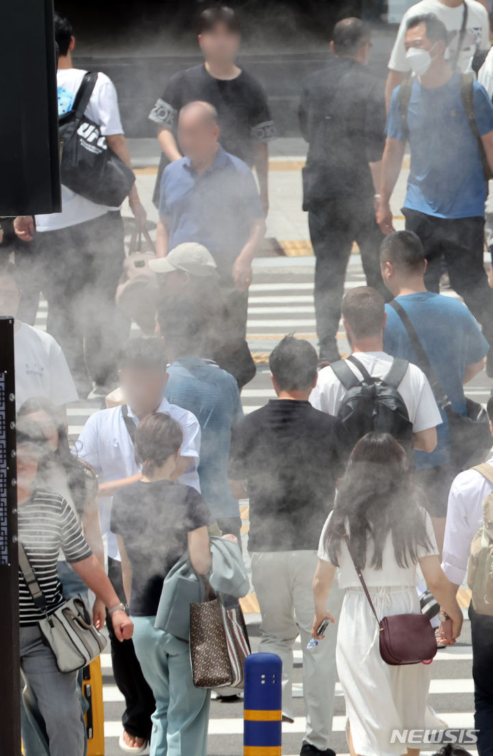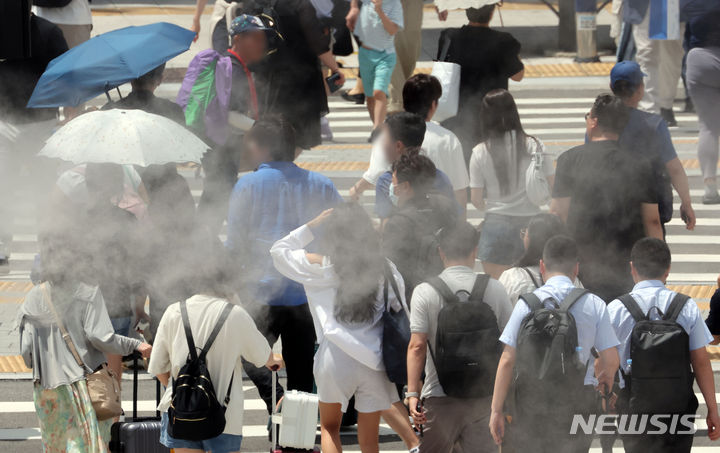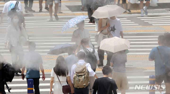 【NEWSIS】釜山地域に猛暑注意報が発令された22日、東区の釜山駅前で、クーリングフォグが作動する横断歩道を渡っている市民の様子。