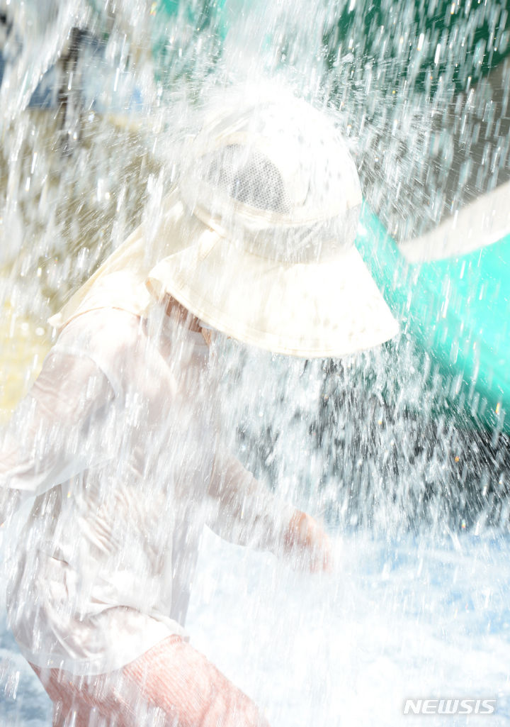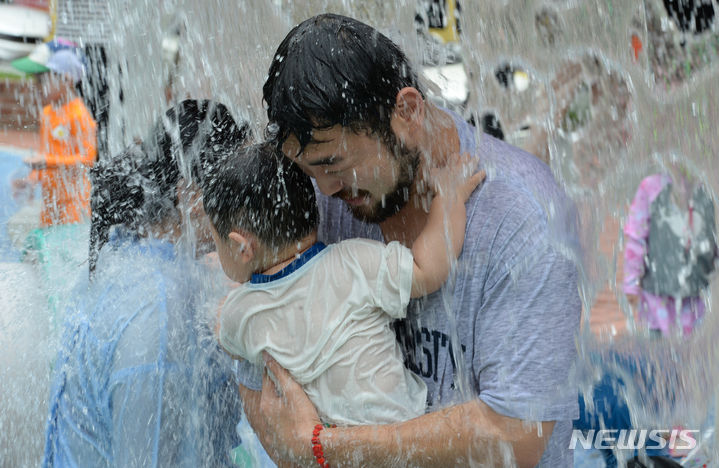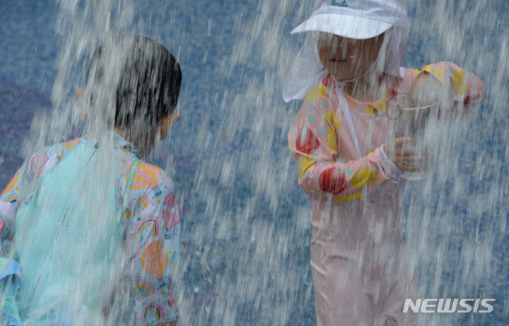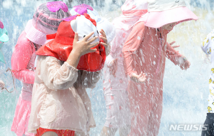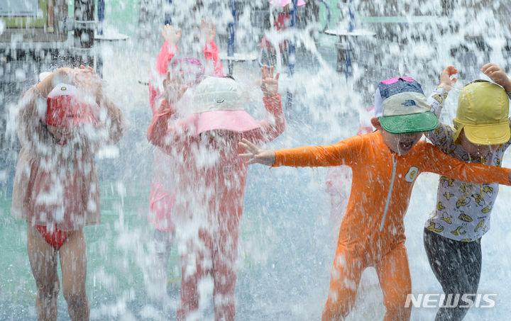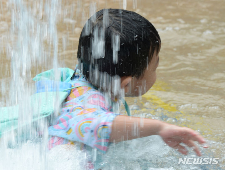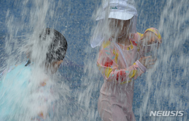 【NEWSIS】蔚山全域に猛暑注意報が発令された23日、蔚山市東区パドゥレ公園の水遊び場では、親子連れが水遊びをして暑さを紛らわせていた。
