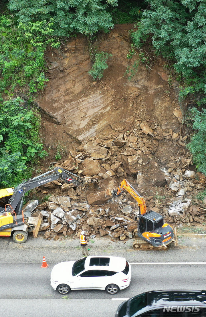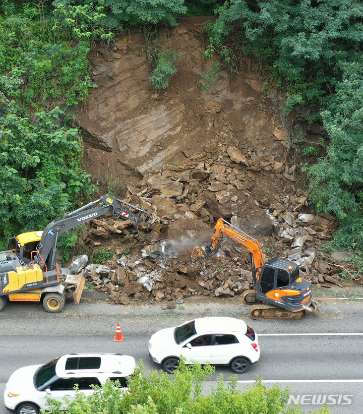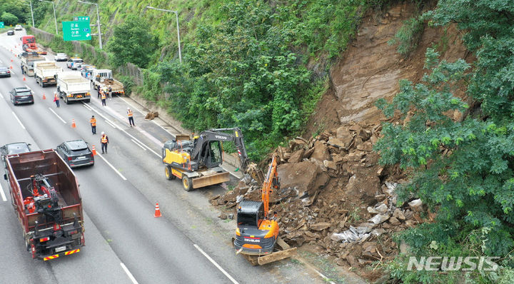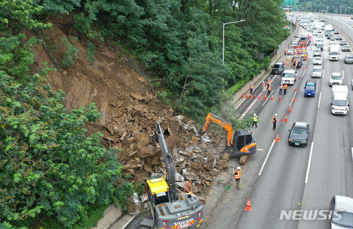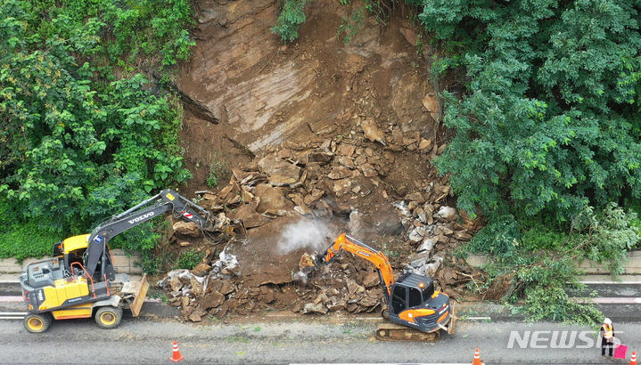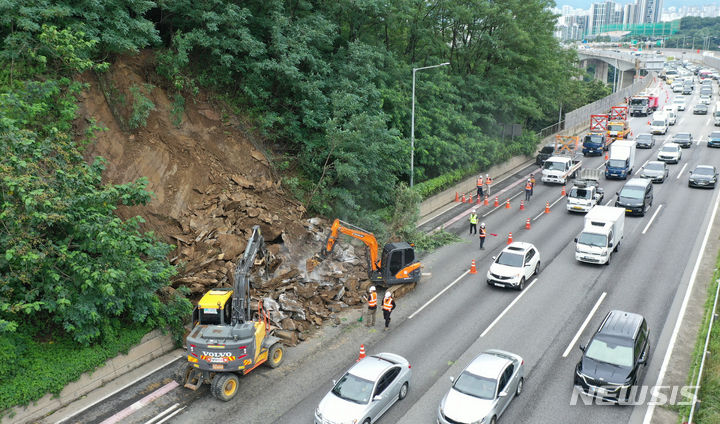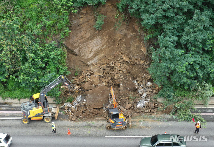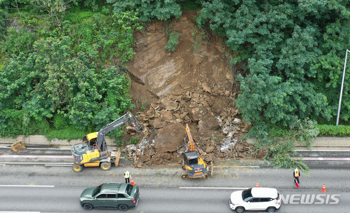 【NEWSIS】首都圏第1循環高速道路・一山方面の山本インターチェンジ付近(京畿道軍浦市山本洞)で23日、土砂が崩れ落ち、関係者がショベルカーを動員して復旧作業を行っている様子。