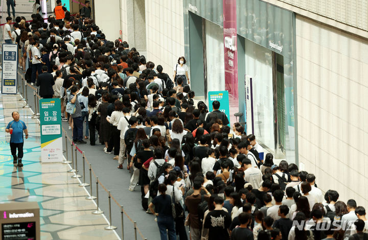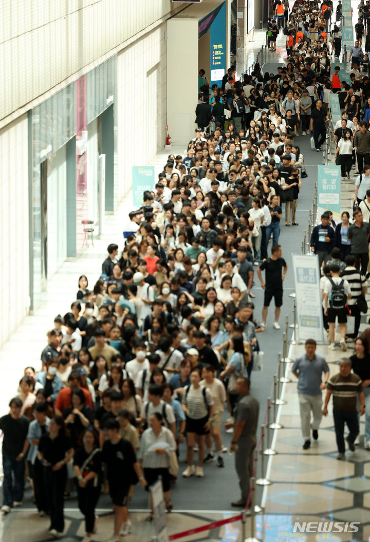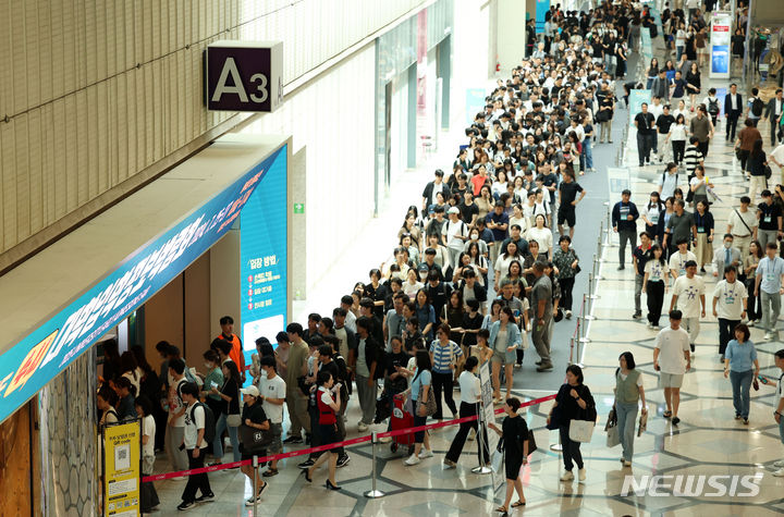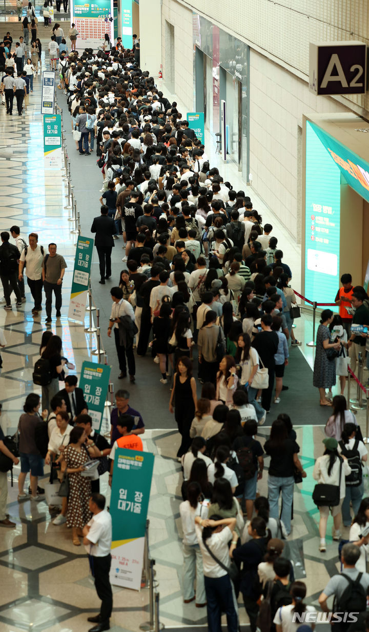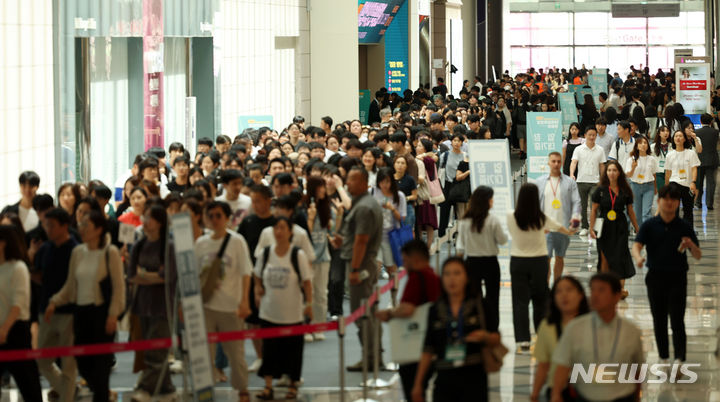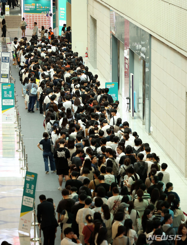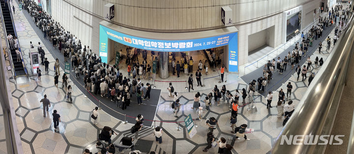 【NEWSIS】25日、ソウル市江南区のCOEXで開かれた2025年度随時募集(推薦入試に相当)大学入学情報博覧会を訪れた保護者や受験生らが、入場を待っている様子。