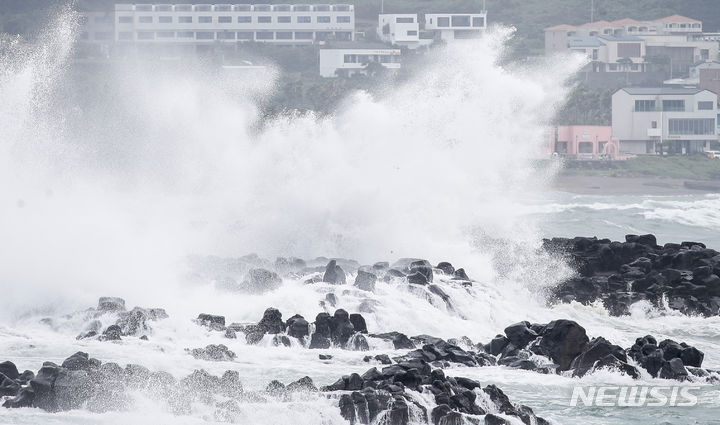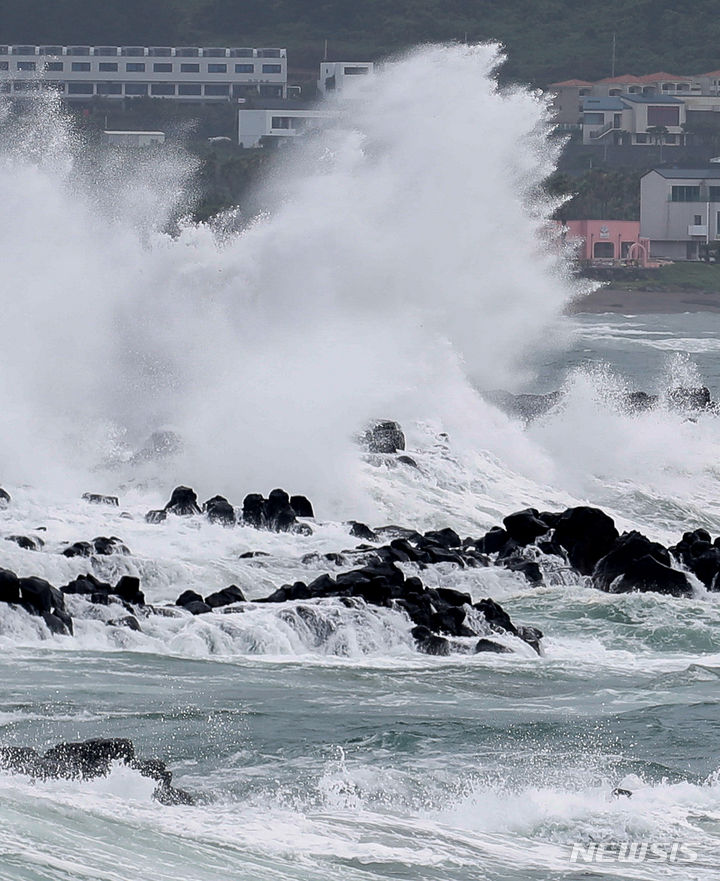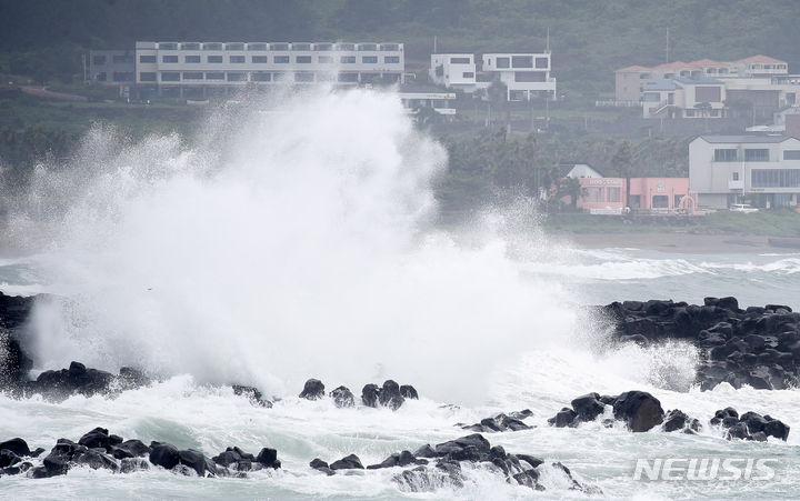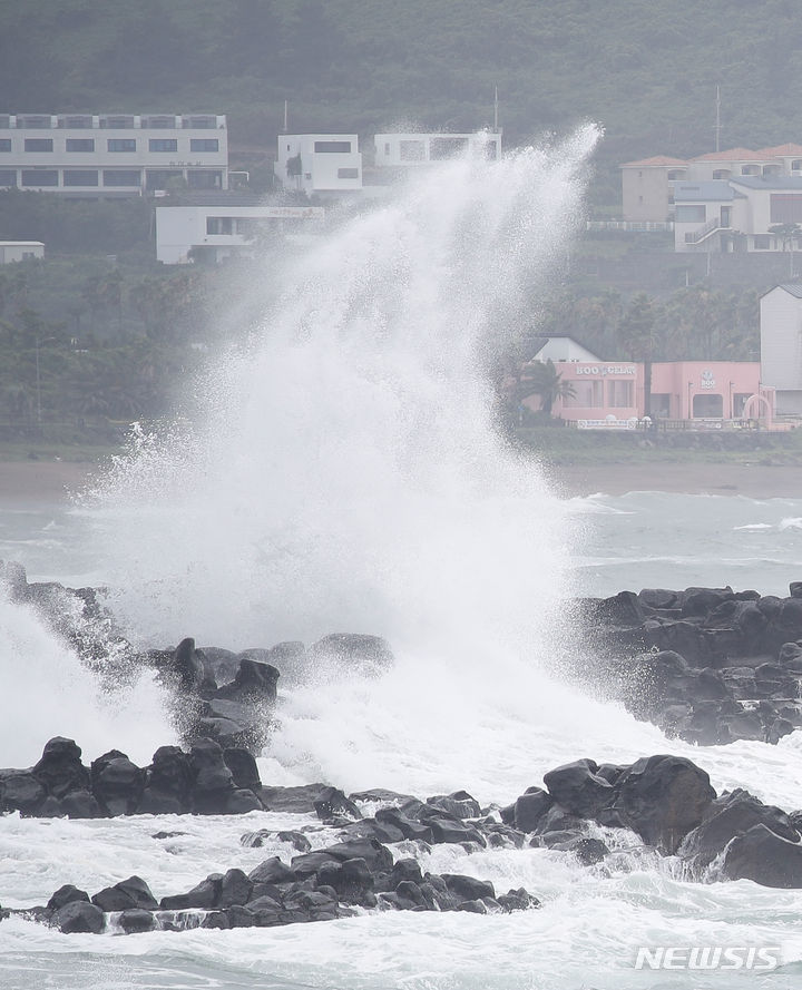 台風3号の影響で済州・西帰浦の海岸に押し寄せる高波