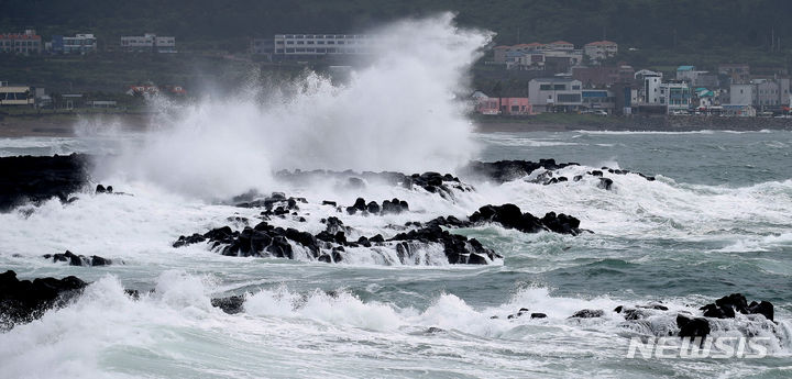 台風3号の影響でうねった高波が押し寄せている26日午前、済州道西帰浦市大静邑上摹里の海岸に打ち付ける波の様子。