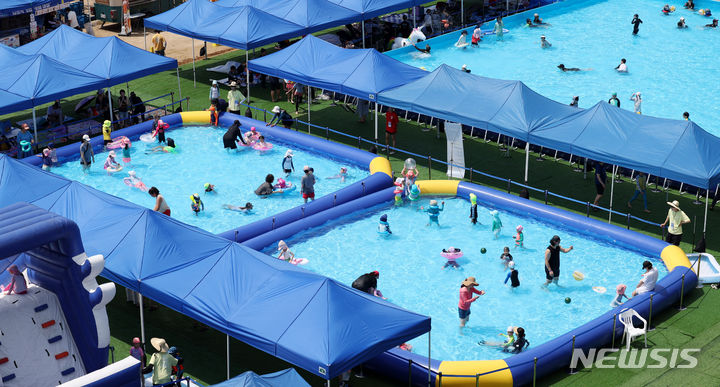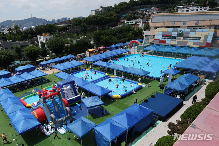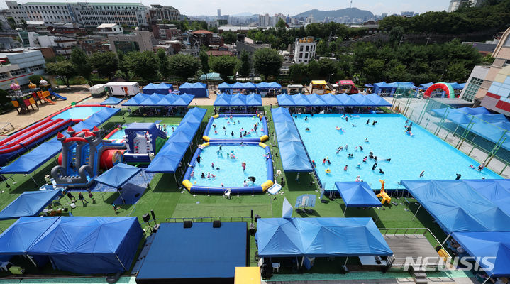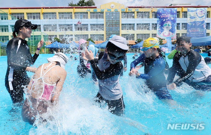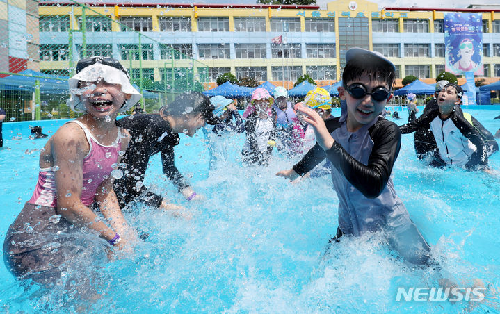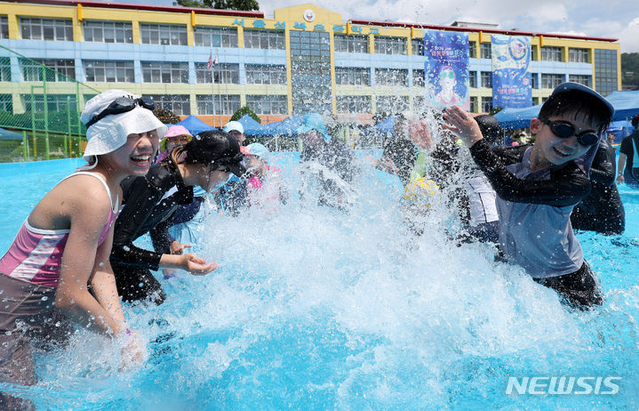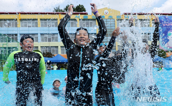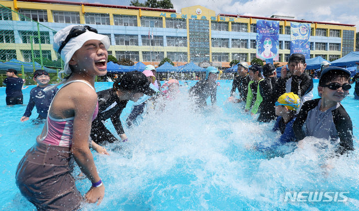 26日午前、夏休み中の城北小学校(ソウル市城北区)運動場に整備されたウォーターパークで「2024 第8回城北文化バカンス」が開催され、子どもたちが水遊びを楽しんでいる様子。