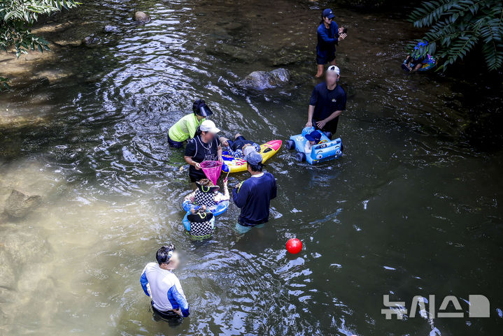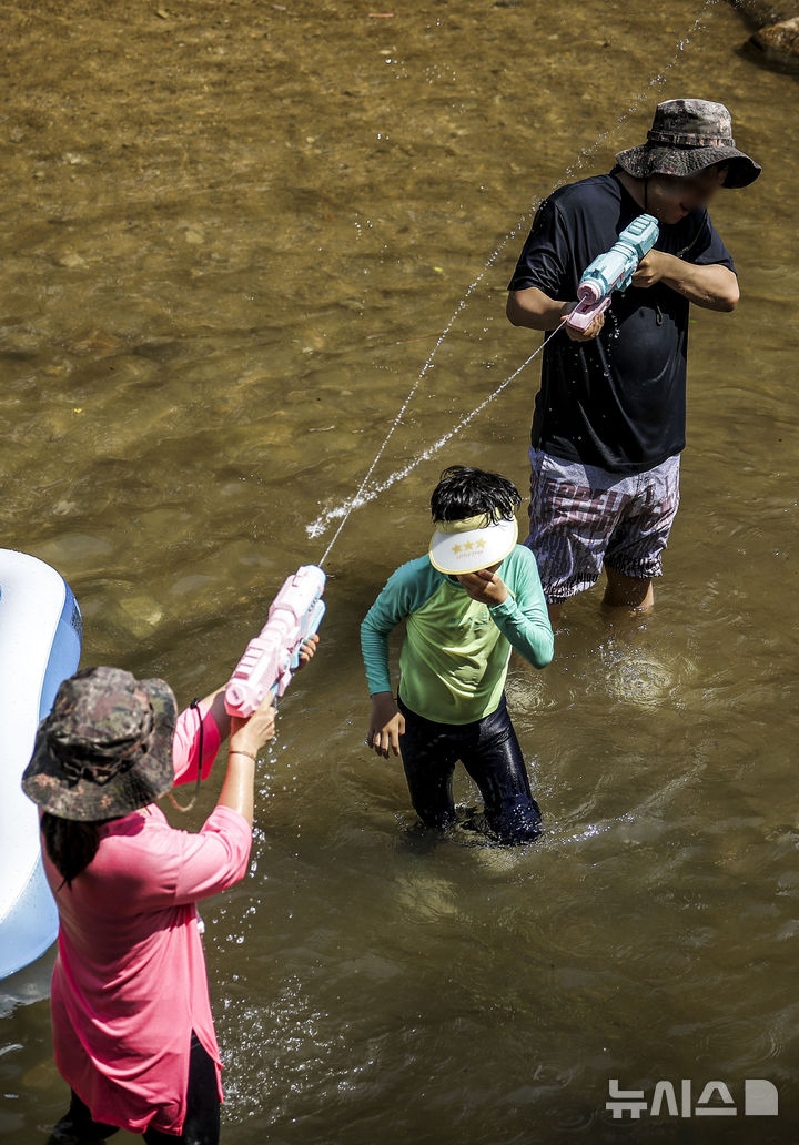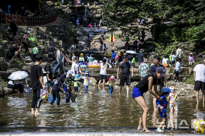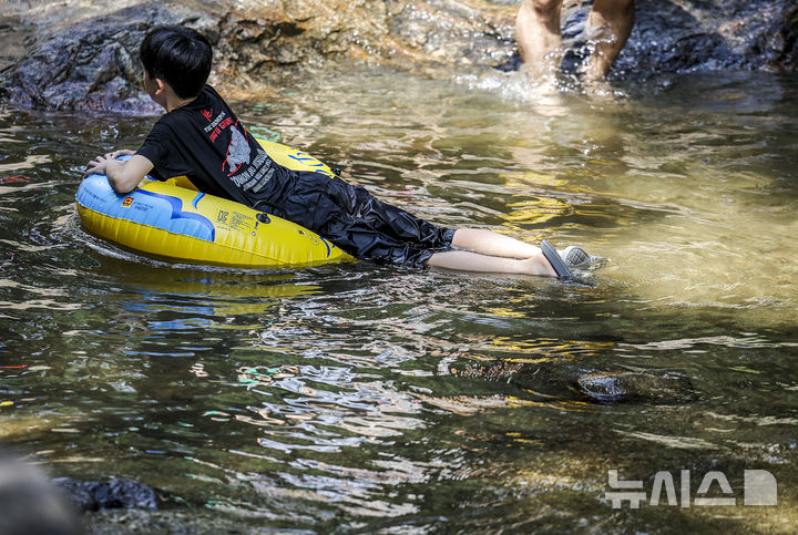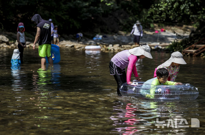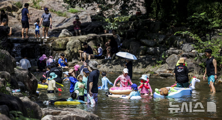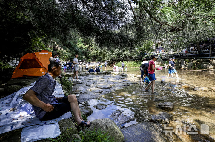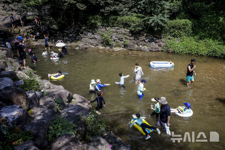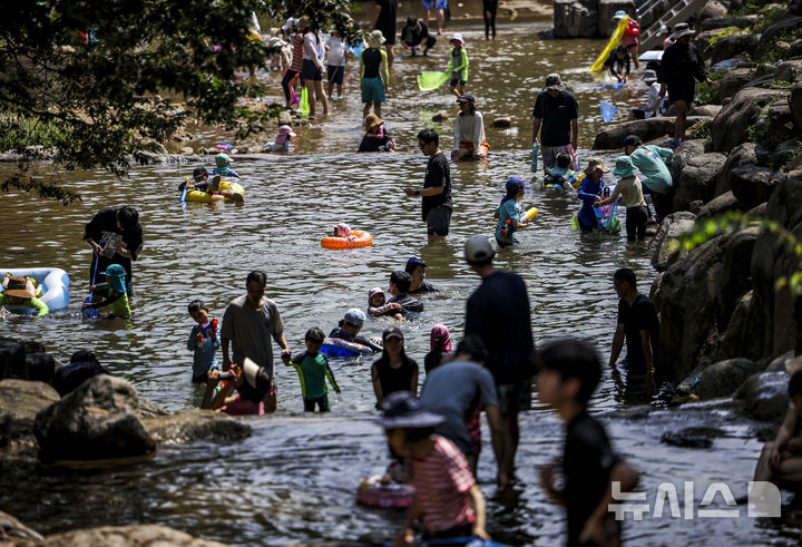 【NEWSIS】韓国全国に猛暑特別警報が発令された4日、京畿道果川市内の果川郷校に近い渓谷を訪れた人々。川遊びで暑さをしのいだ。