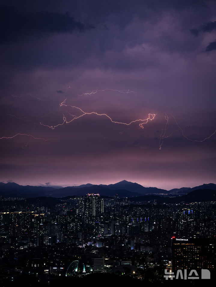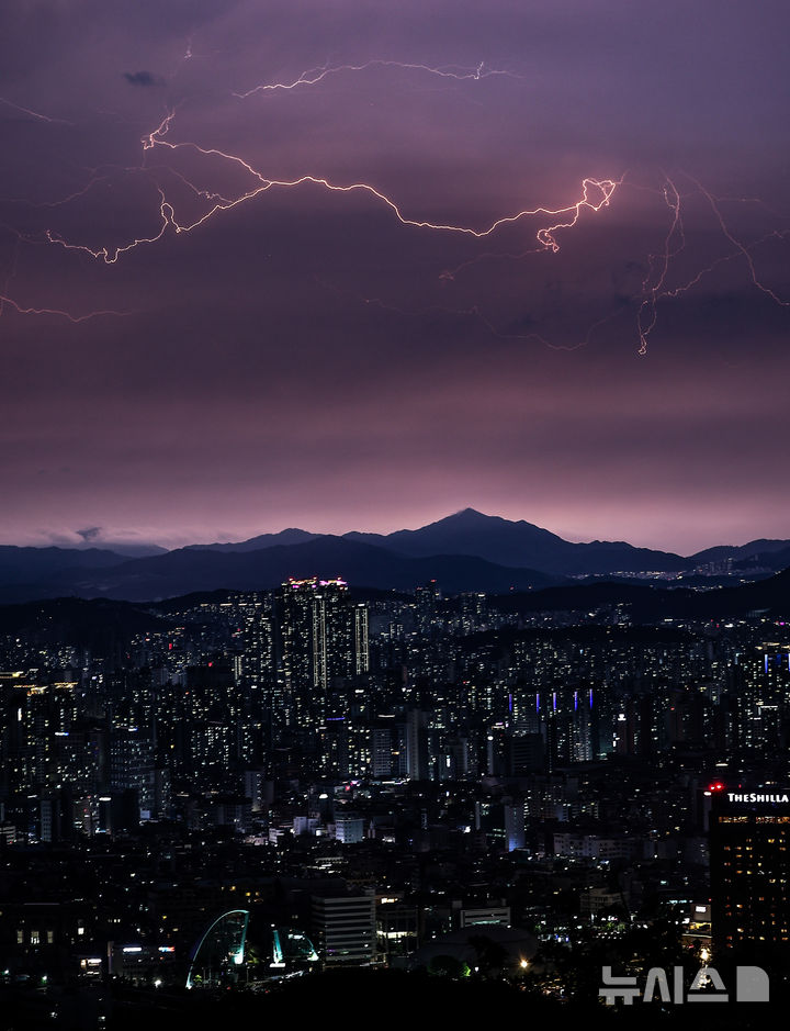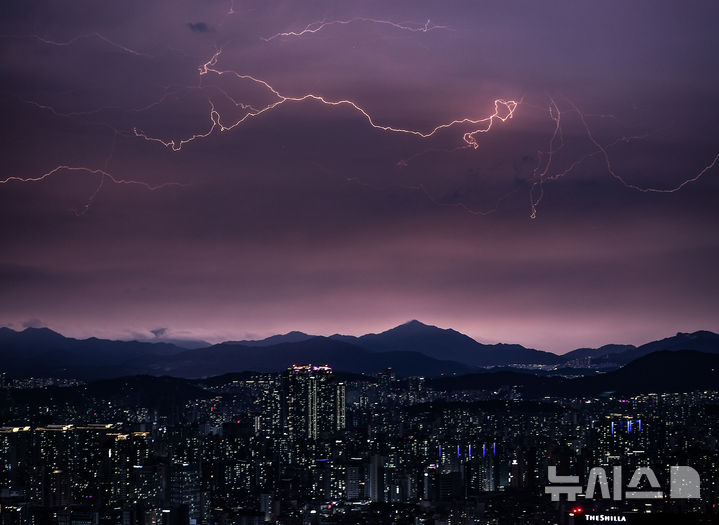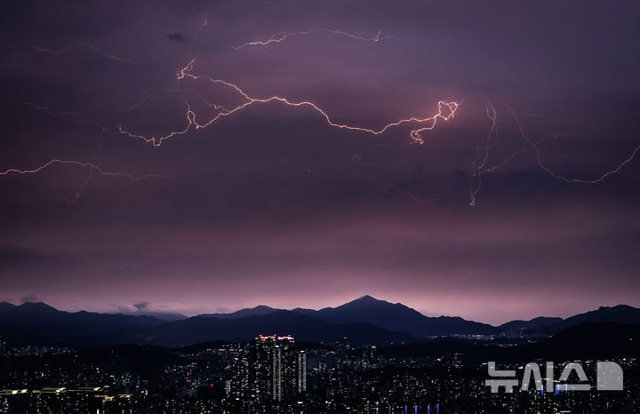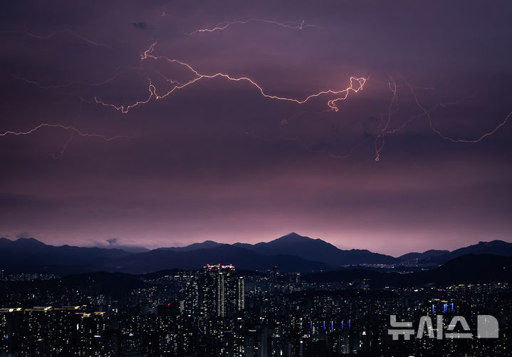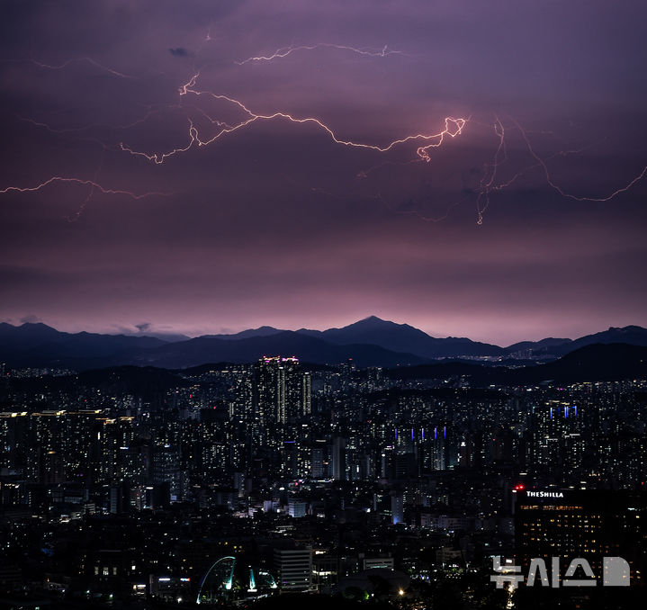 【NEWSIS】大気が不安定だった5日夜、ソウル市中区南山から見たソウルの夜空に走る稲妻。