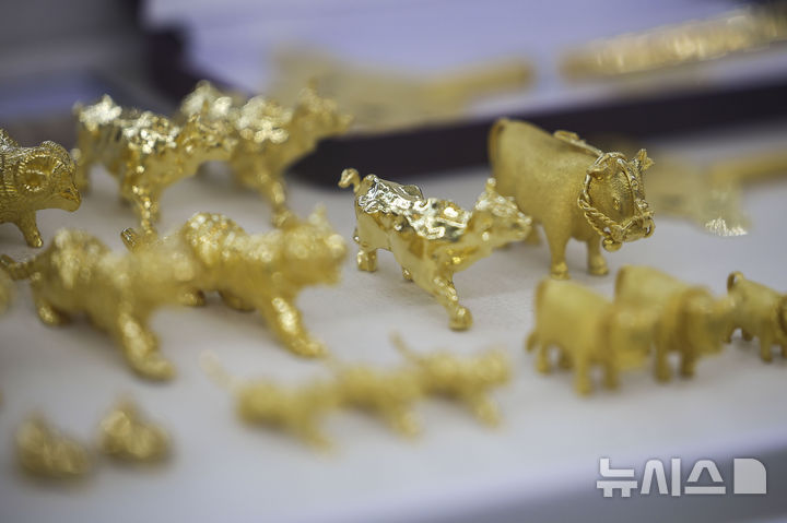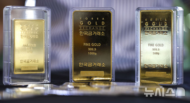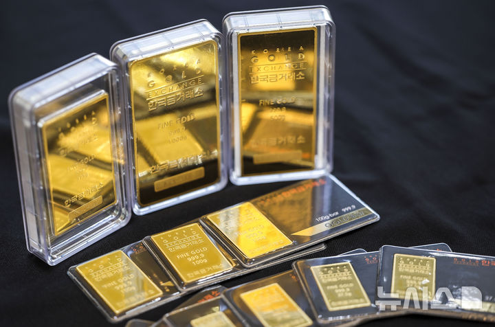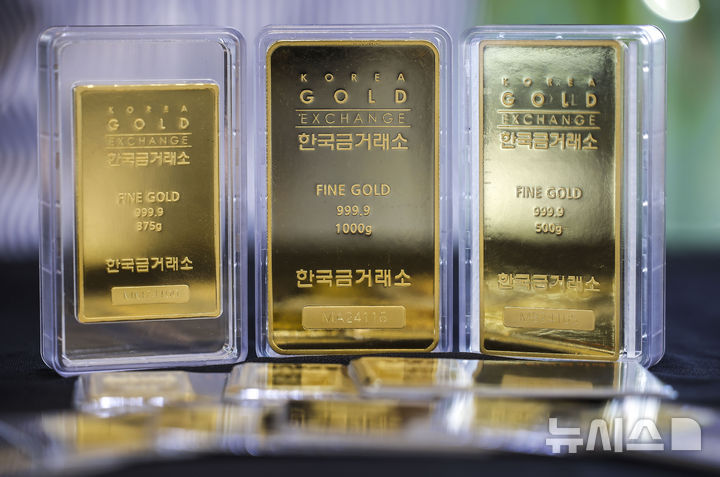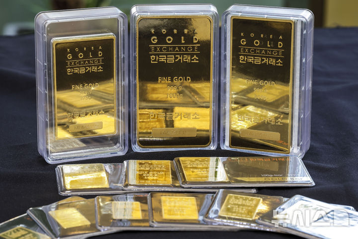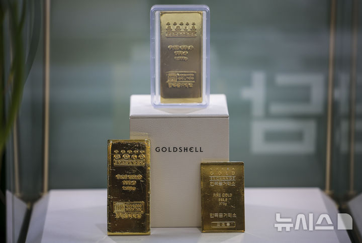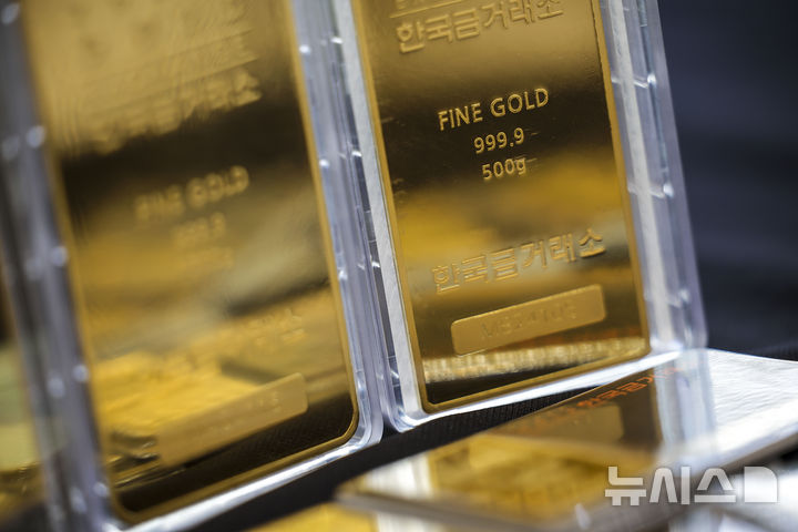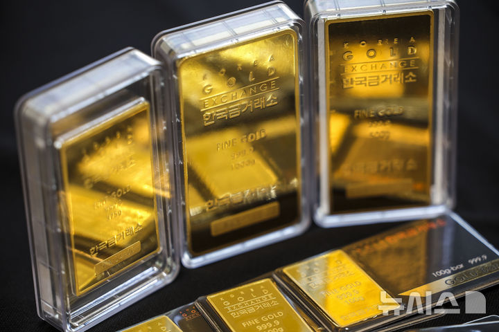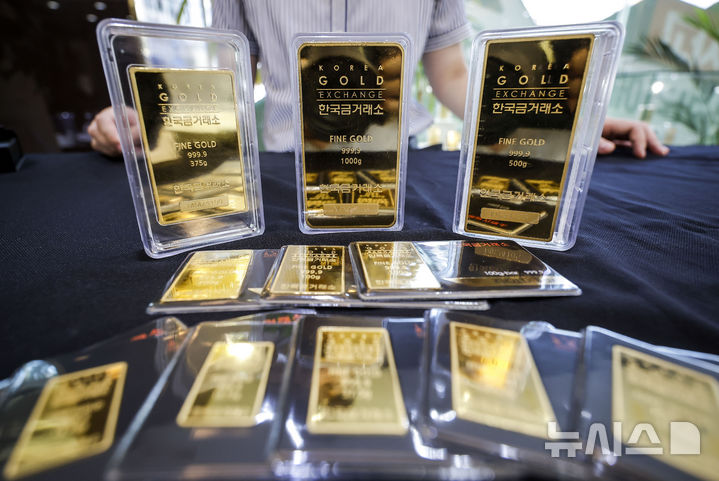 【NEWSIS】6日、ソウル市鍾路区の韓国金取引所鍾路本店に陳列されているゴールドバーの様子。米国発の景気沈滞の恐怖が世界の金融市場に拡散し、金や債券など伝統的な安全資産の価格が上昇傾向を示している。韓国の金現物ETF(上場投資信託)の投資規模は、上場以来最高水準を記録した。