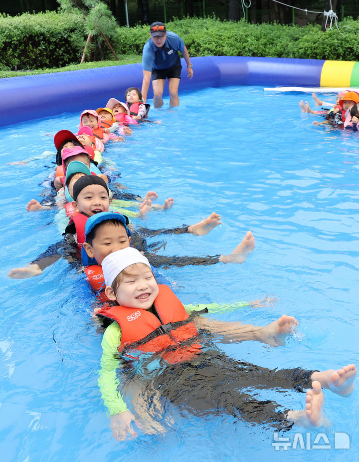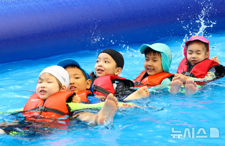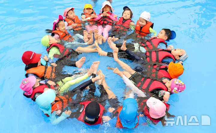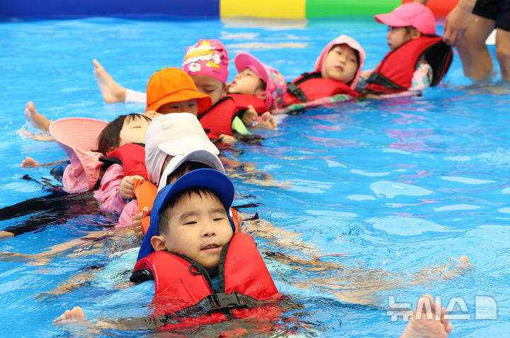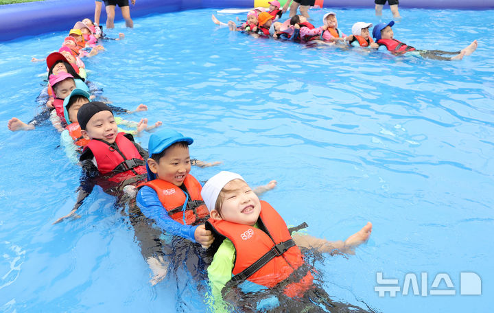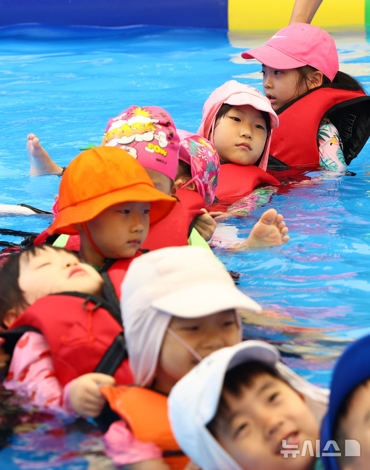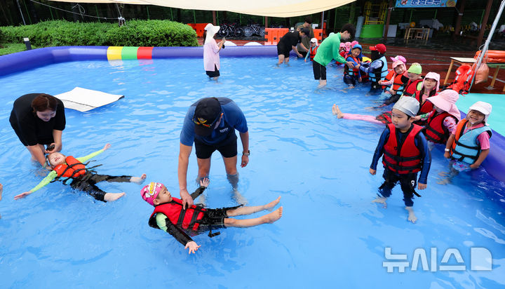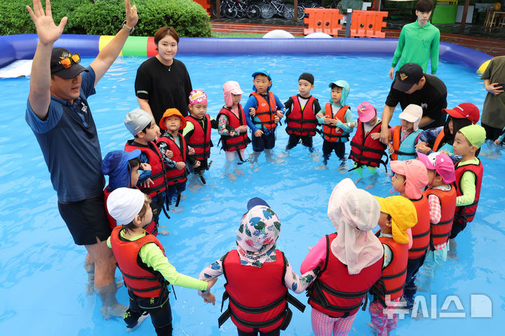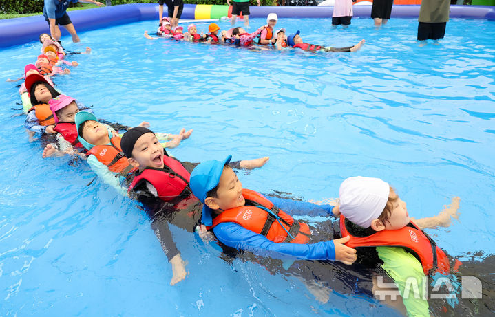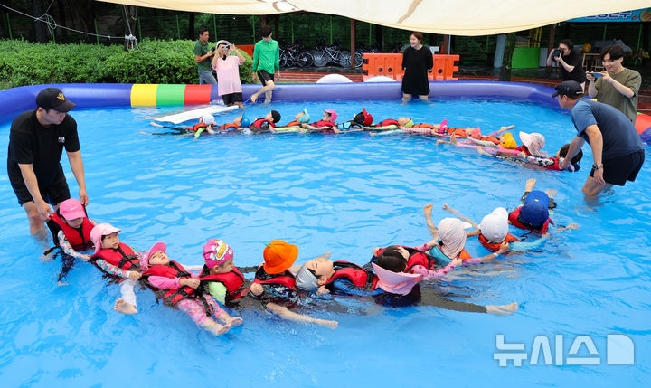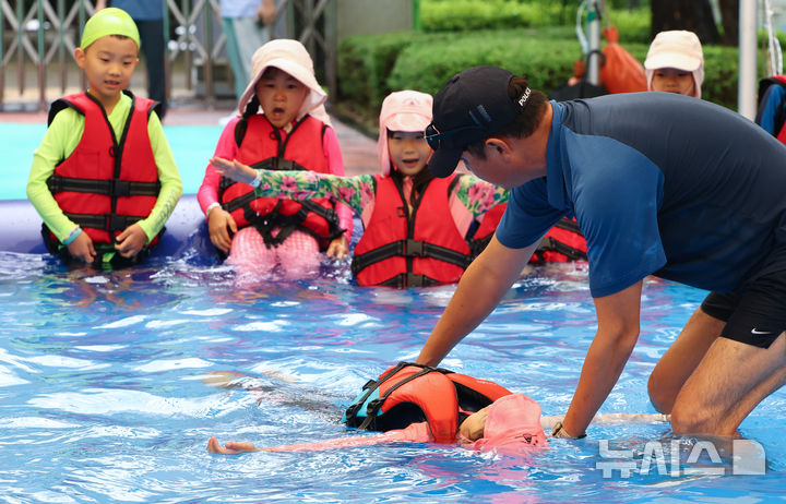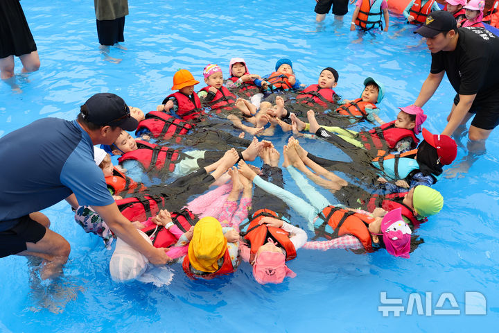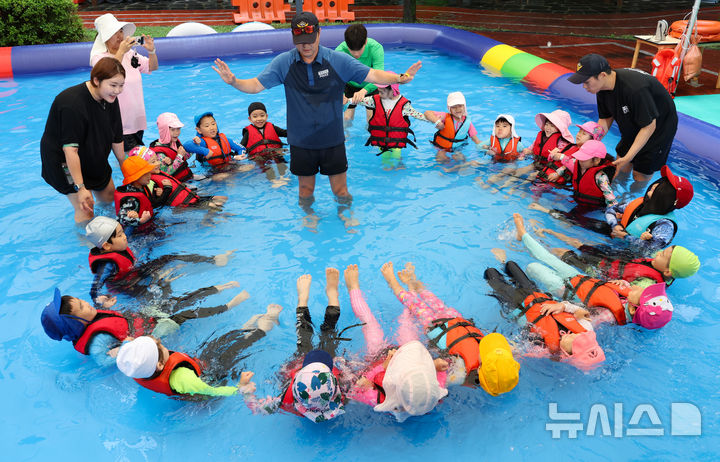 【NEWSIS】6日、ソウル市松坡区の松坡安全体験教育館を訪れた子どもたちが、海洋警察隊員から生存水泳を習っているところ。