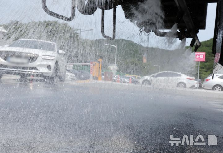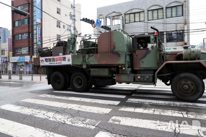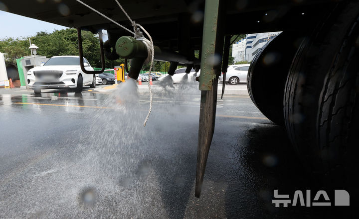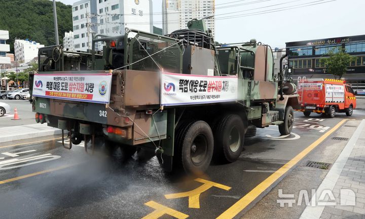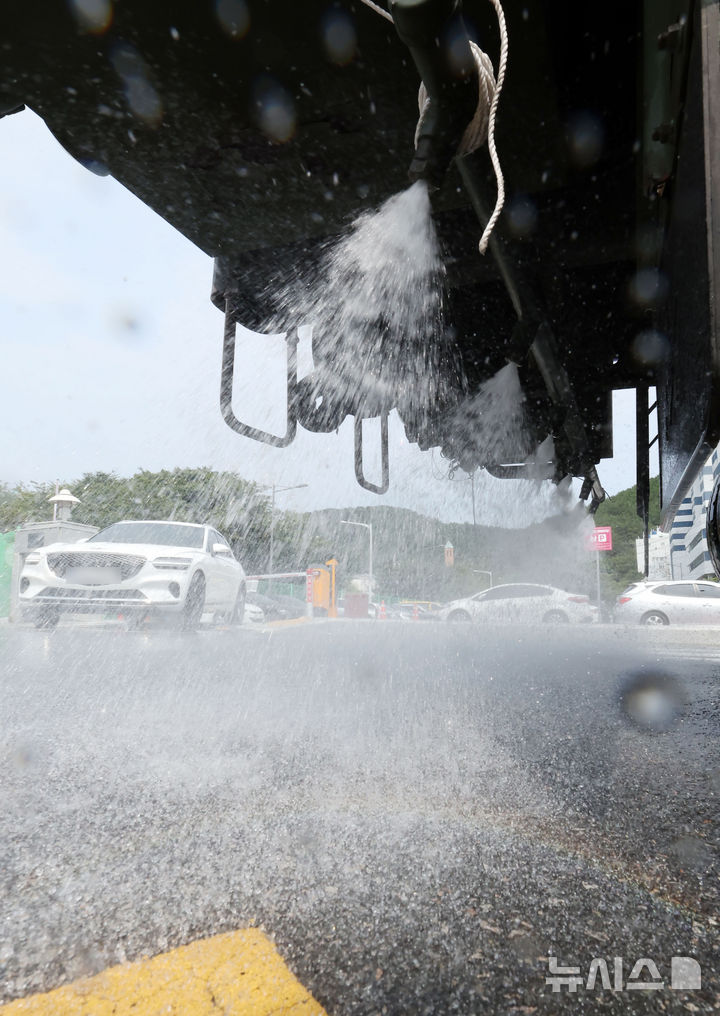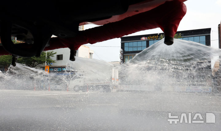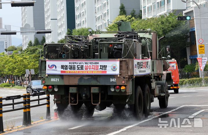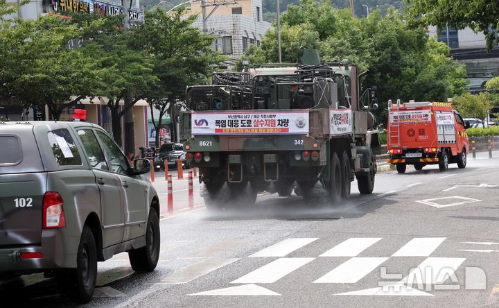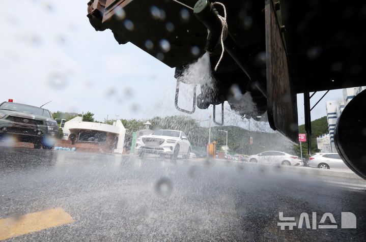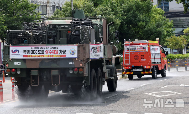 【NEWSIS】釜山全域に猛暑警報が発令された6日午後、釜山市南区竜湖洞の車道で、海軍作戦司令部所属のK10除毒車(除染車)などが路面を冷やすために水をまいている様子。