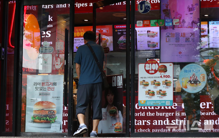 【NEWSIS】ロッテGRSが運営するハンバーガーフランチャイズ「ロッテリア」が、今月8日からバーガー類20種を2.2%値上げする等、一部商品の販売価格を調整する。代表的なものとして、リア・プルゴギとリア・エビは単品メニュー基準で100ウォン(約11円)、セットメニューでは200ウォン(約21円)の価格調整が行われる。写真は7日、ソウル市内のロッテリアの店舗の様子。