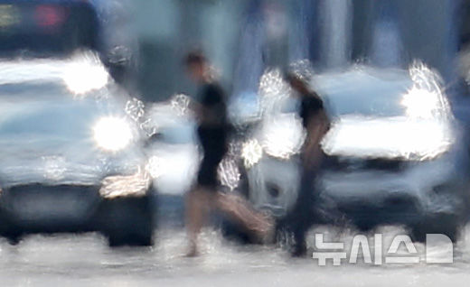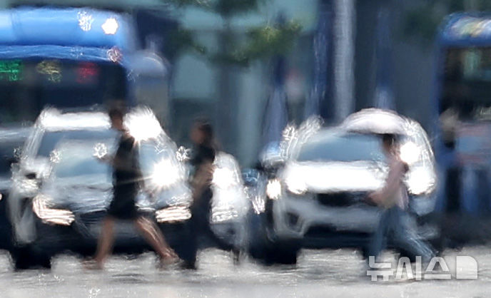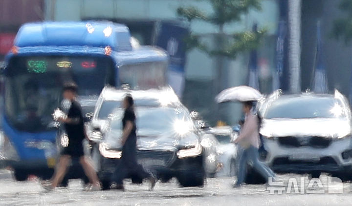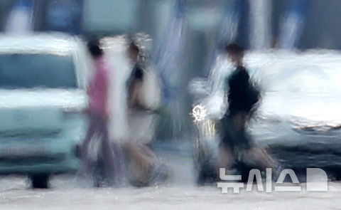 【NEWSIS】暦の上では立秋を迎えたが猛暑が続いている7日、大邱市中区の半月堂交差点に近い達句伐大路で、熱せられた横断歩道を渡る市民の様子。
