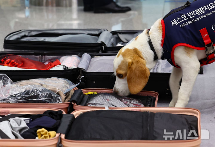 仁川市中区の仁川国際空港第2旅客ターミナルで8日、トコジラミ探知犬韓国第1号の「CECO」が、旅行客らのキャリーバッグをチェックしていた。