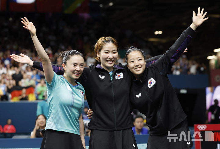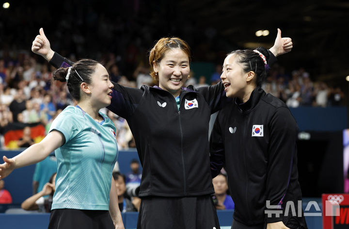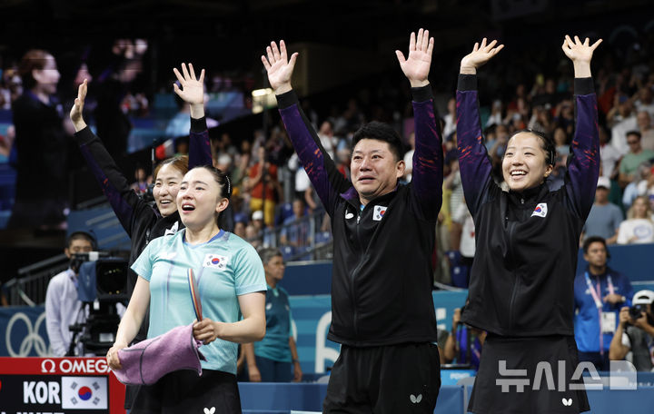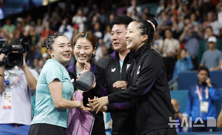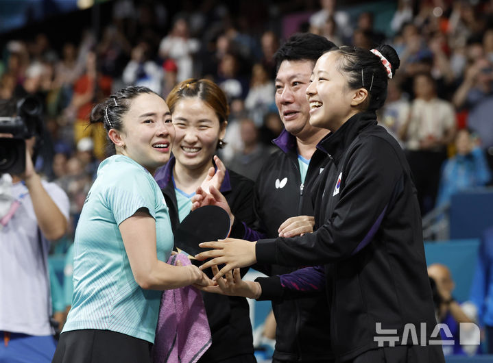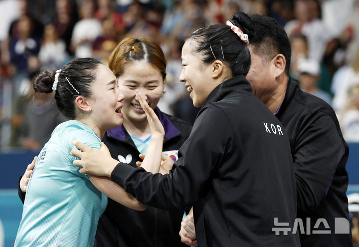 【NEWSIS】10日(現地時間)フランス・パリのサウス・パリ・アリーナ4で開かれた2024年パリ五輪卓球女子団体の銅メダル決定戦、ドイツとの試合を制した申裕斌(シン・ユビン)、田志希(チョン・ジヒ)、李恩恵(イ・ウンヘ)と呉光憲(オ・グァンホン)監督が喜んでいる様子。
