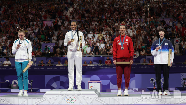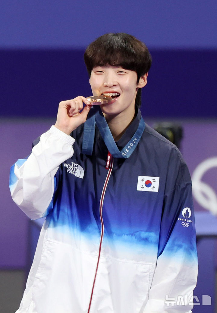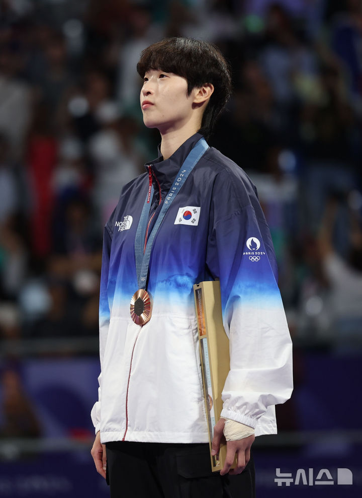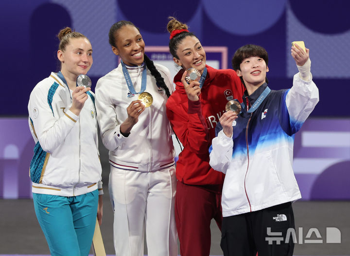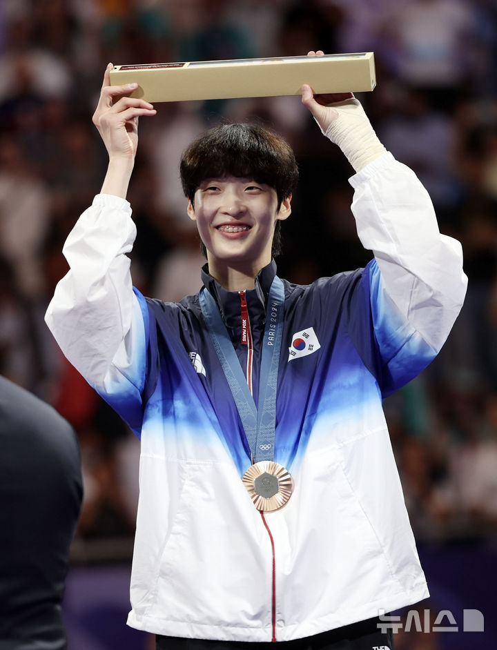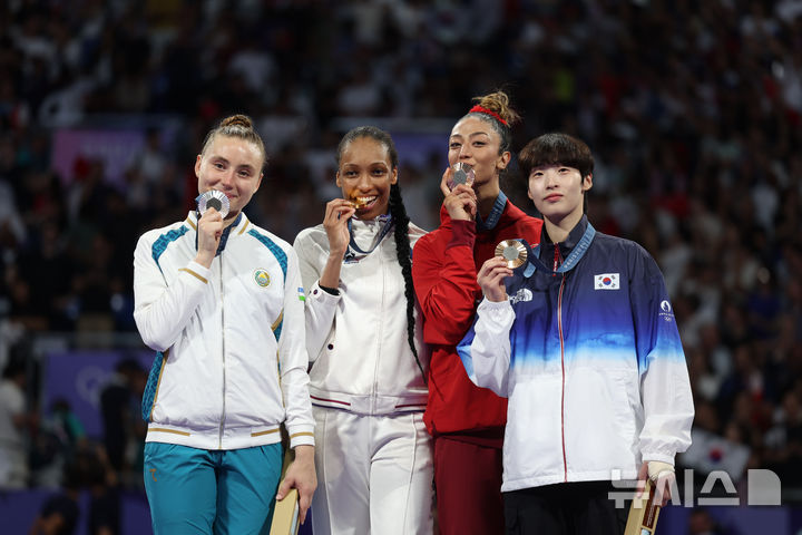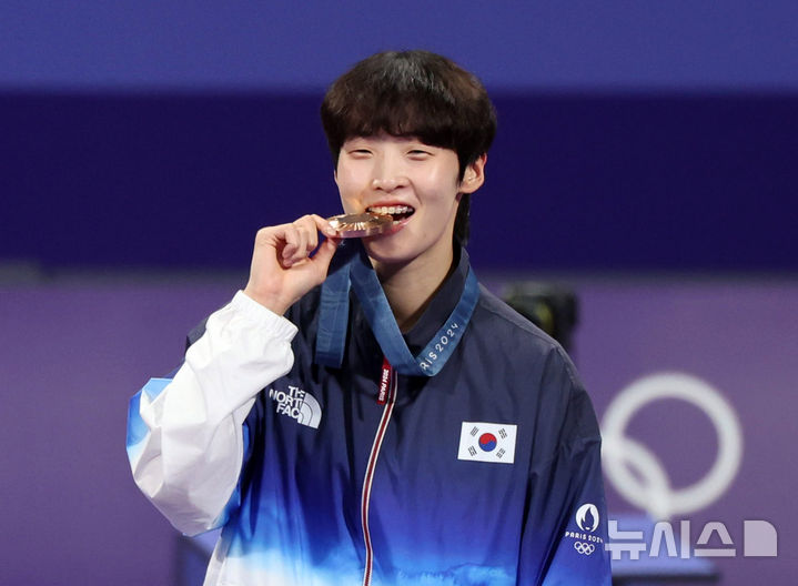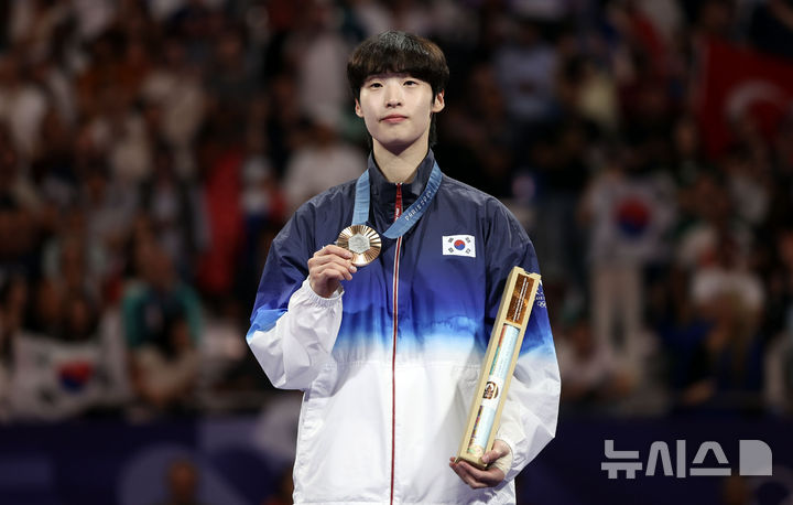 【NEWSIS】10日(現地時間)、フランス・パリのグラン・パレで行われた2024年パリ五輪テコンドー女子67キロ超級の授賞式で、銅メダルを首にかけ記念撮影をする李多嬪(イ・ダビン)。