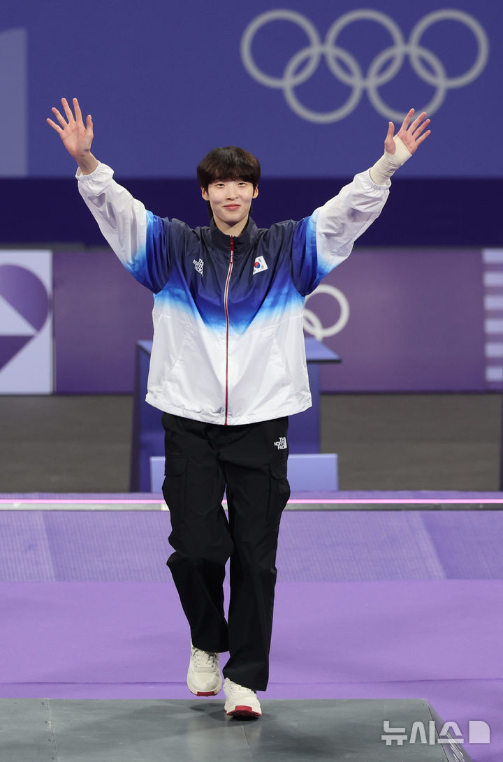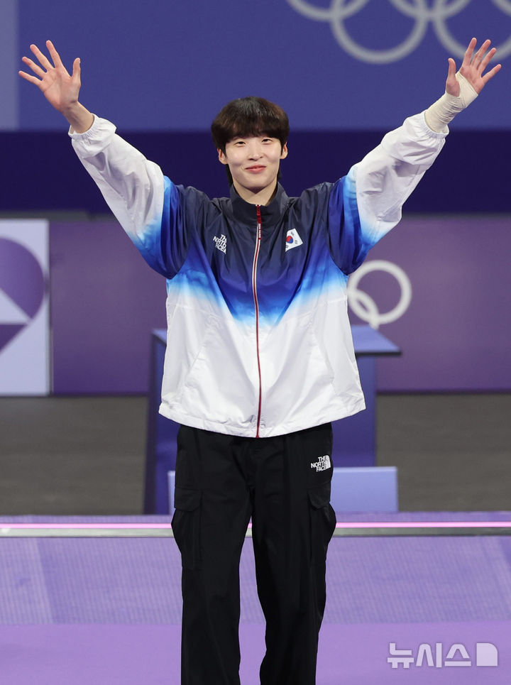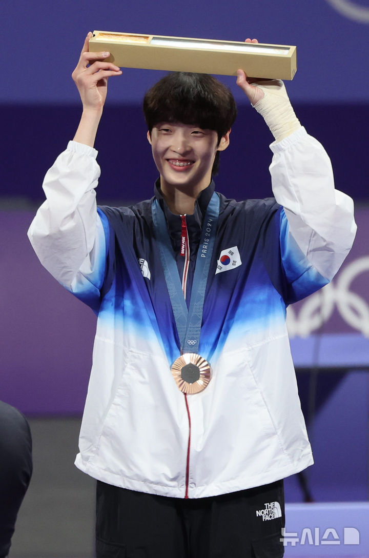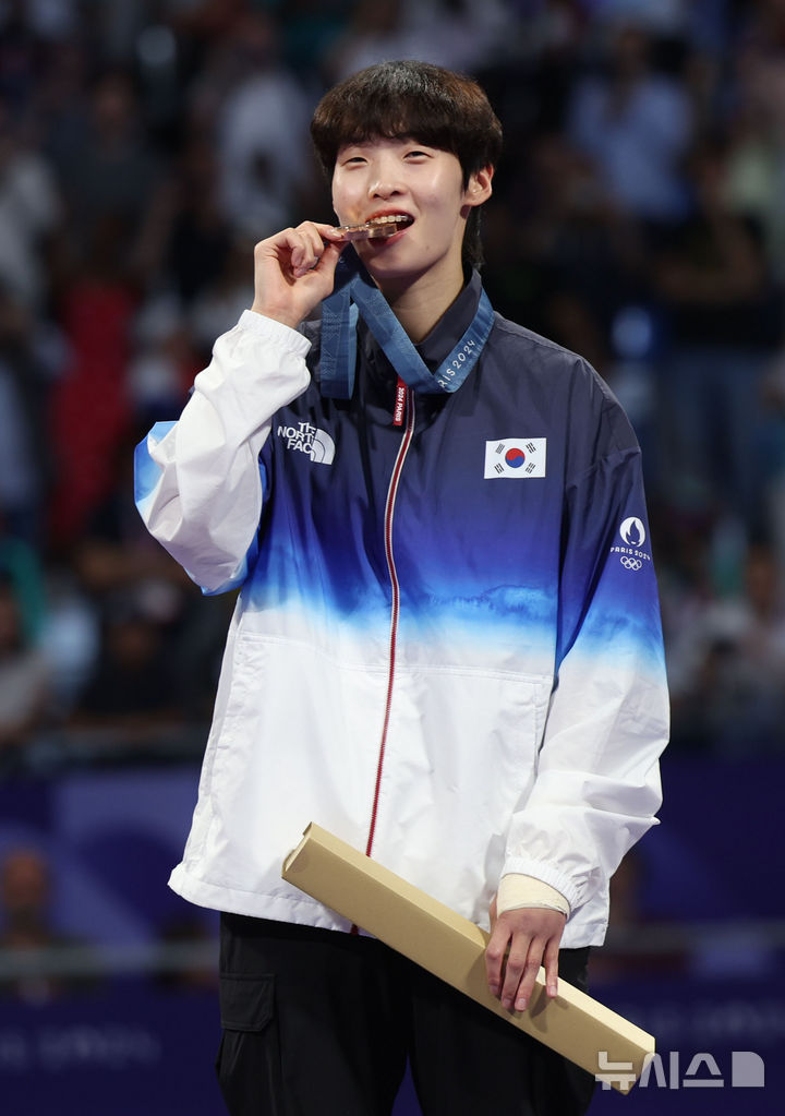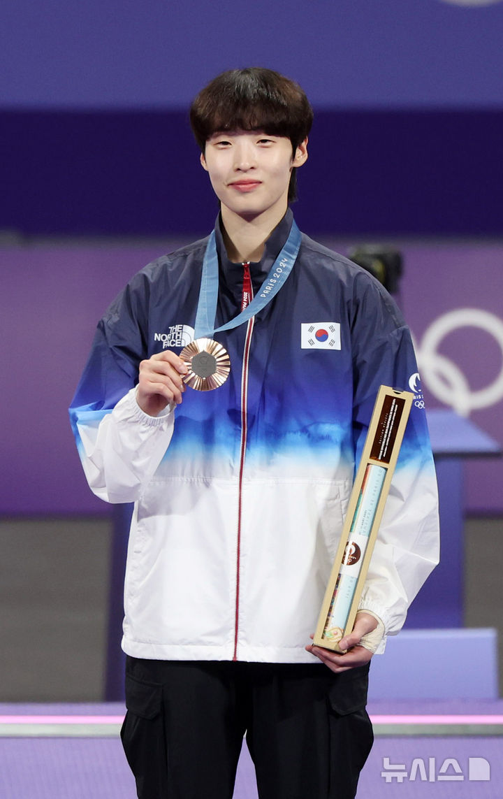 【NEWSIS】10日(現地時間)、フランス・パリのグラン・パレで行われた2024年パリ五輪テコンドー女子67キロ超級の授賞式で、銅メダルを首にかけ記念撮影をする李多嬪(イ・ダビン)。