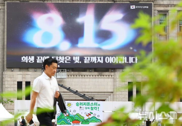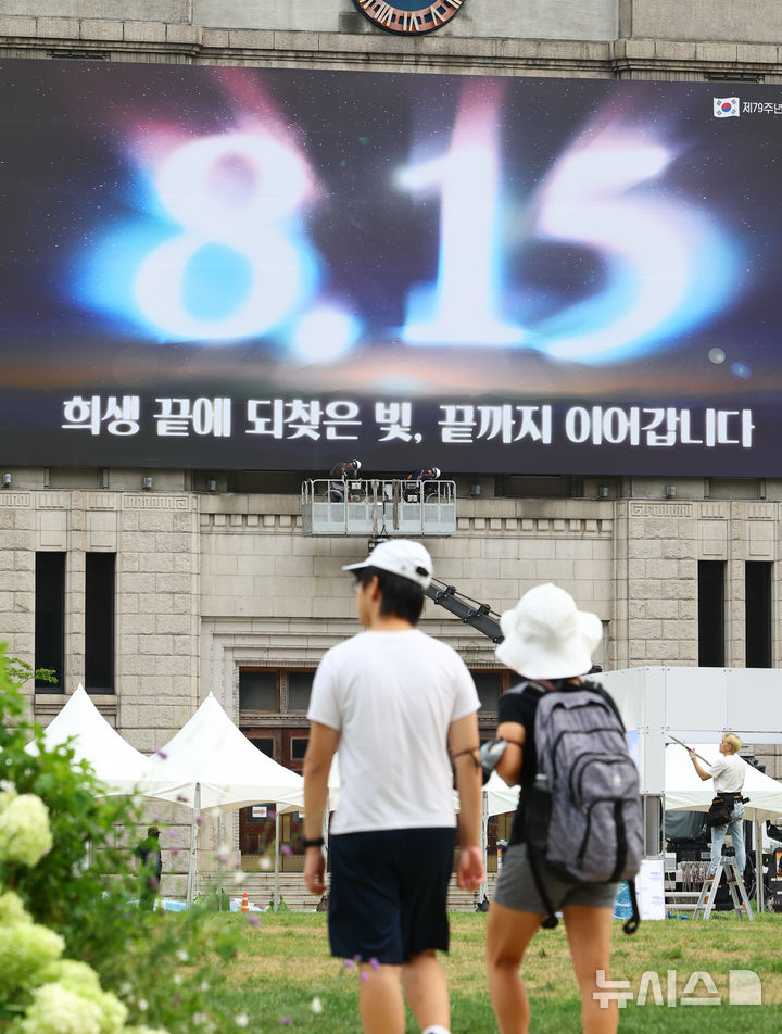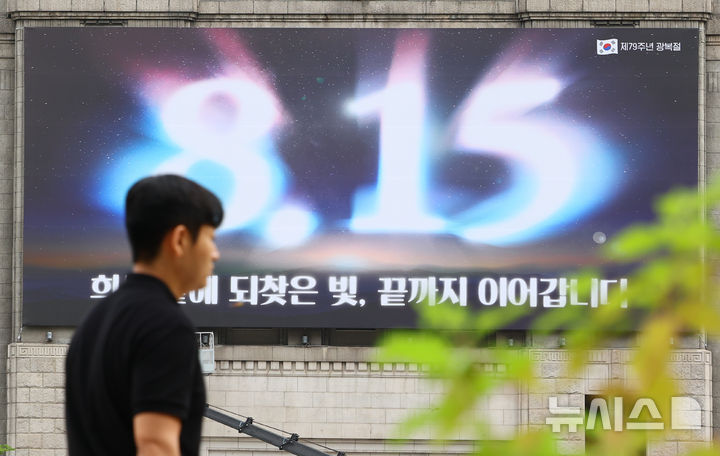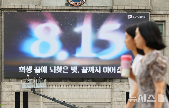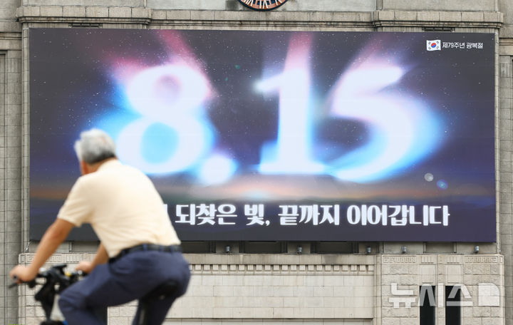 12日午前、ソウル図書館(ソウル市中区)の外壁にある「ソウル・夢を刻むパネル」が、光復節記念のメッセージに切り替えられている様子。