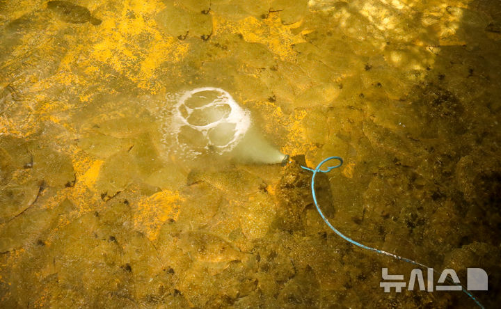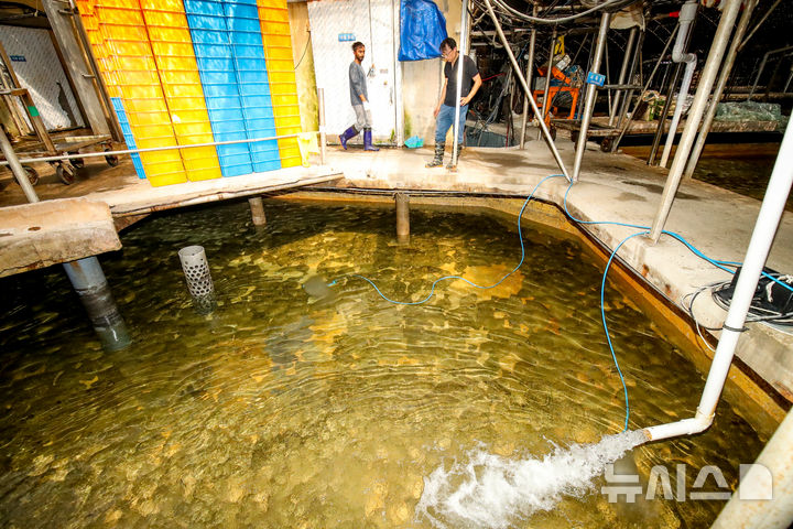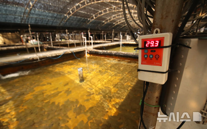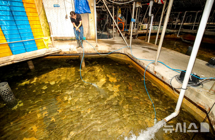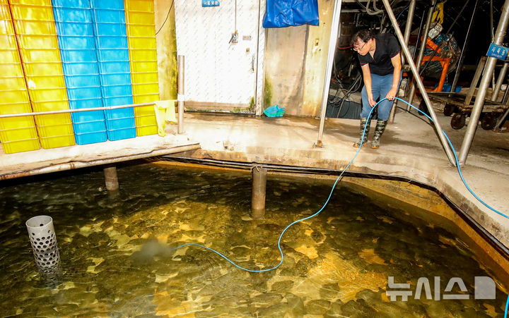 写真は13日午前、済州市翰京面の養殖場で、関係者が水槽に液化酸素を供給している様子。養殖場内の水温は18-22度が適温だが、6月半ば以降続いている済州沿岸の高水温の影響で、陸上養殖場での斃死量も増えている。