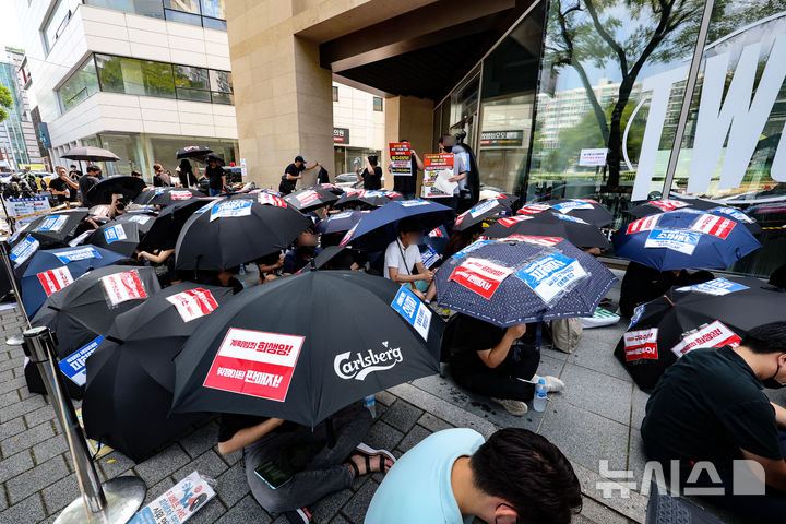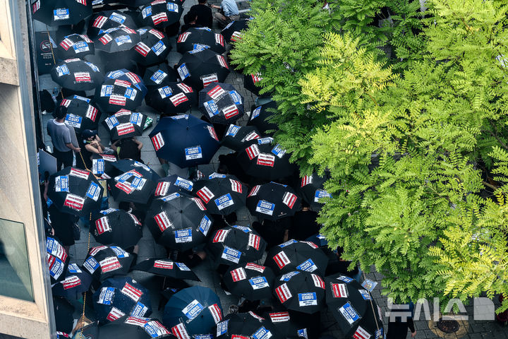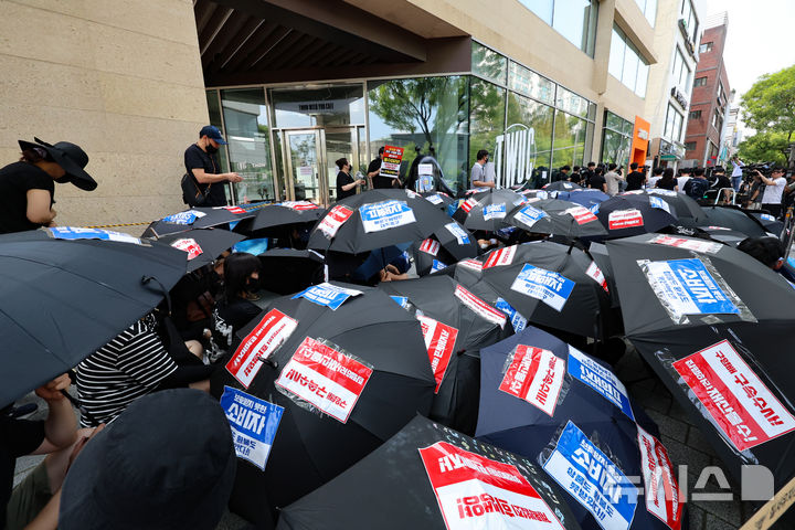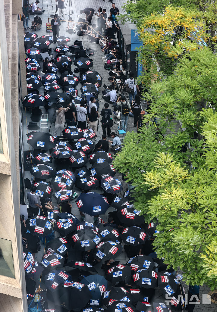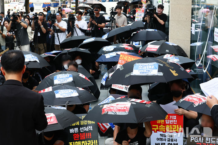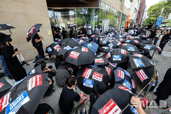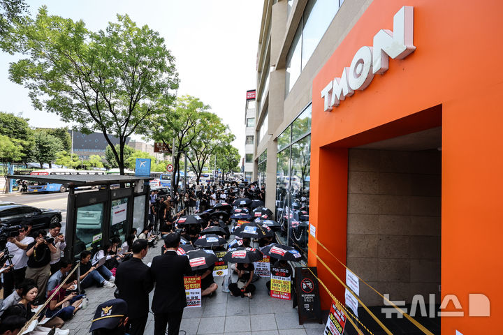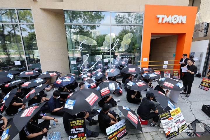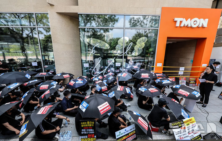 ソウル市江南区のTMON(ティモン)旧社屋で13日、TMONやWEMAKEPRICE(ウィメプ)などの被害者たちが黒い傘を手にデモを繰り広げた。