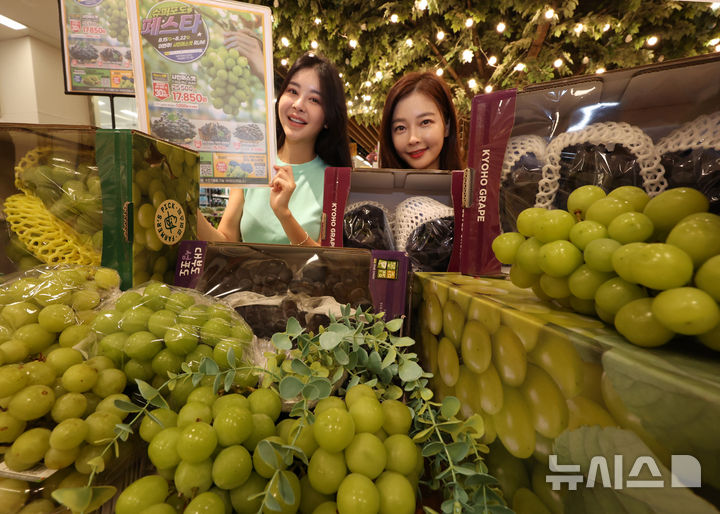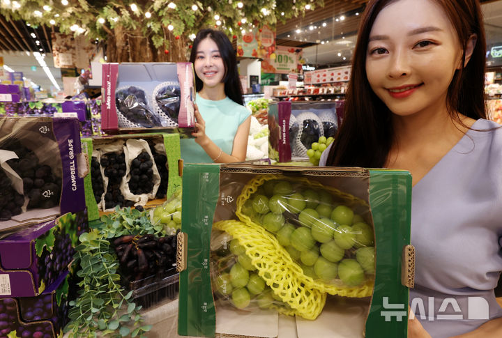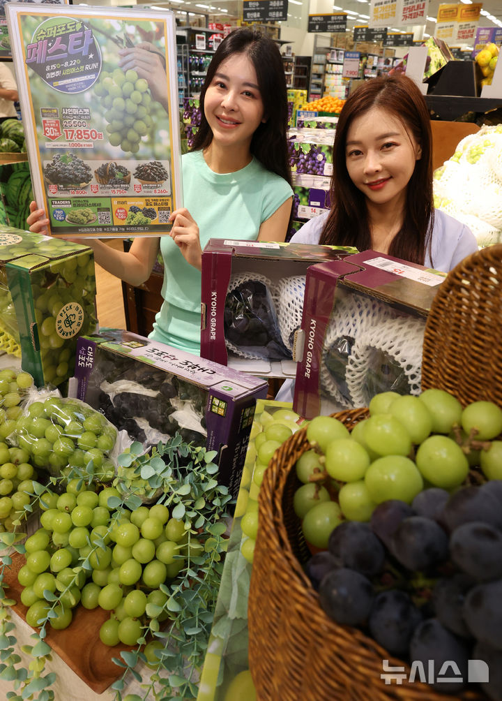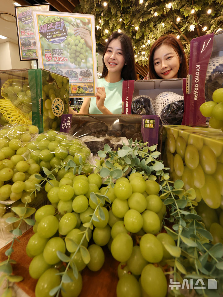 コンパニオンらが14日午前、ソウル市中区の大型スーパー「イーマート」清渓川店で、スーパー・ブドウ・フェスティバルをPRした。