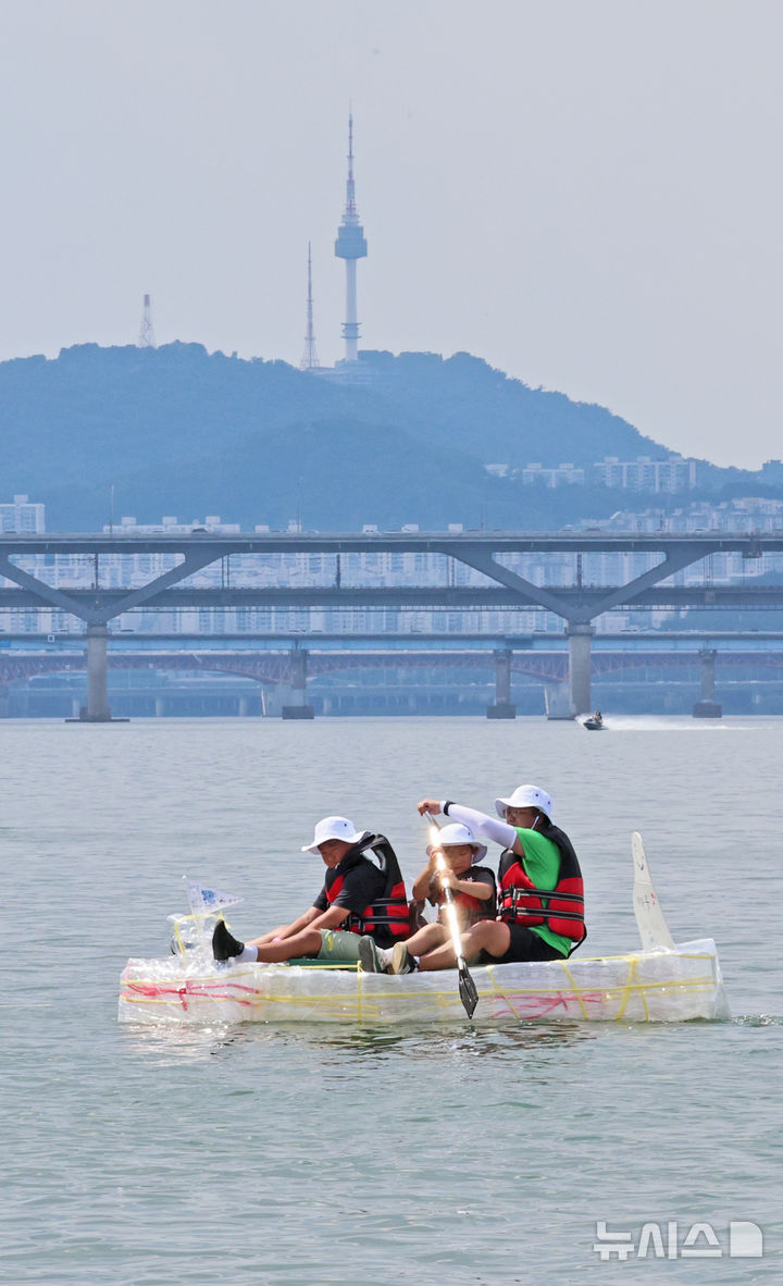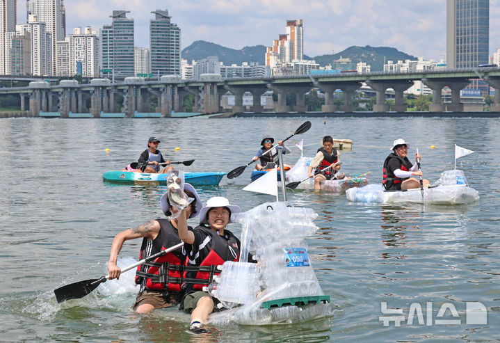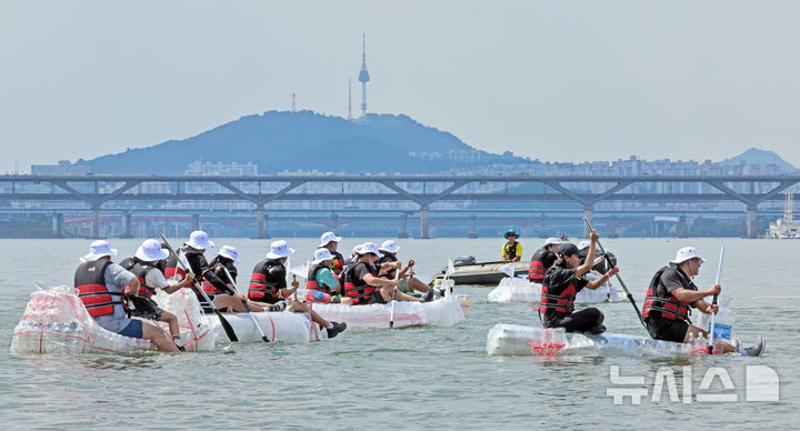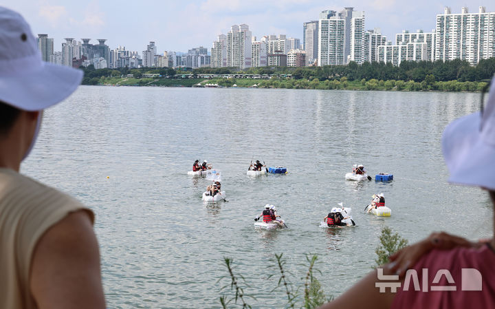 【NEWSIS】18日午後、ソウル市松坡区蚕室の漢江公園で、「わたしだけの漢江号競争大会」が行われた。写真はペットボトルで手作りした船に乗ってレースをする参加者たち。