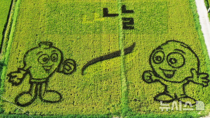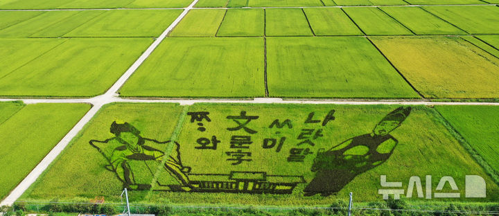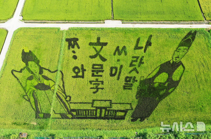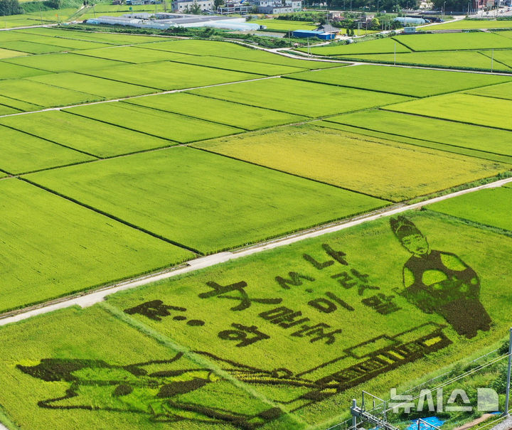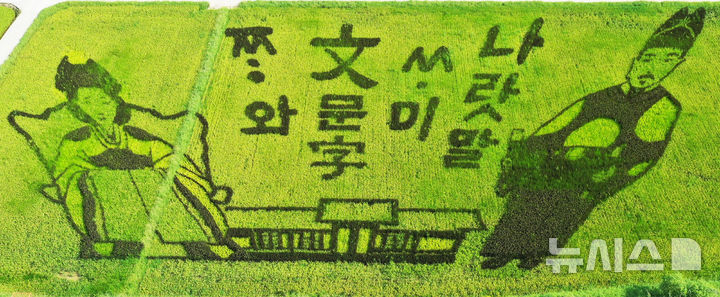 【NEWSIS】韓国の「米の日」の8月18日、京畿道驪州市内の世宗大王陵駅近くで、色の異なる稲を使って世宗大王と明成皇后(閔妃)の絵が描かれた「田んぼアート」が注目を集めている。