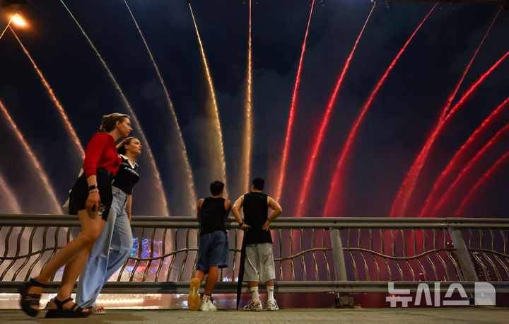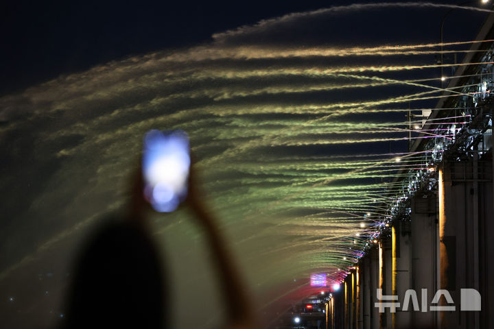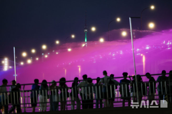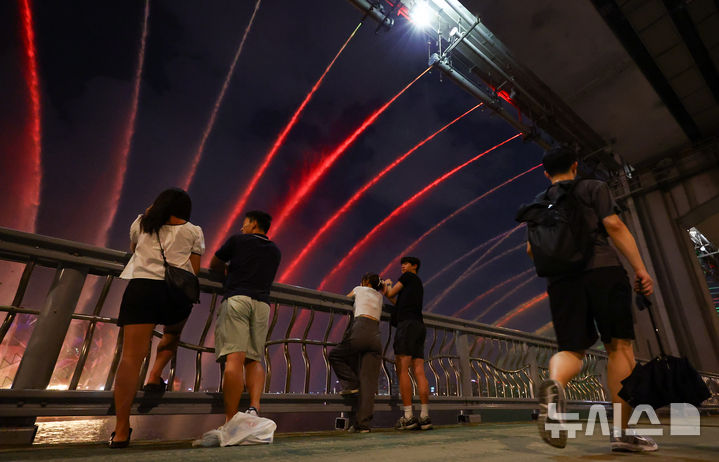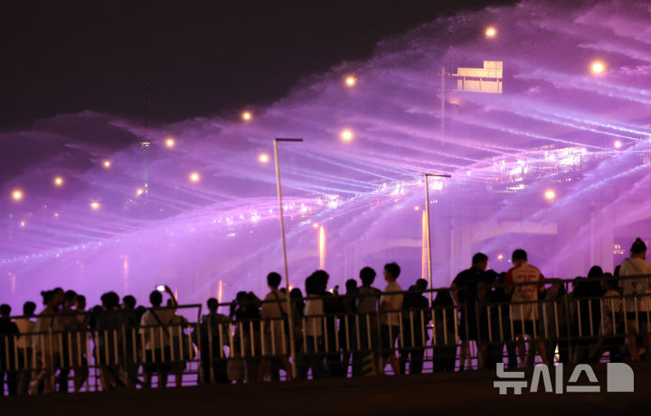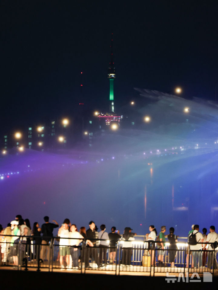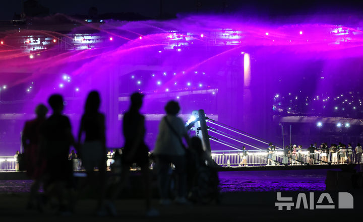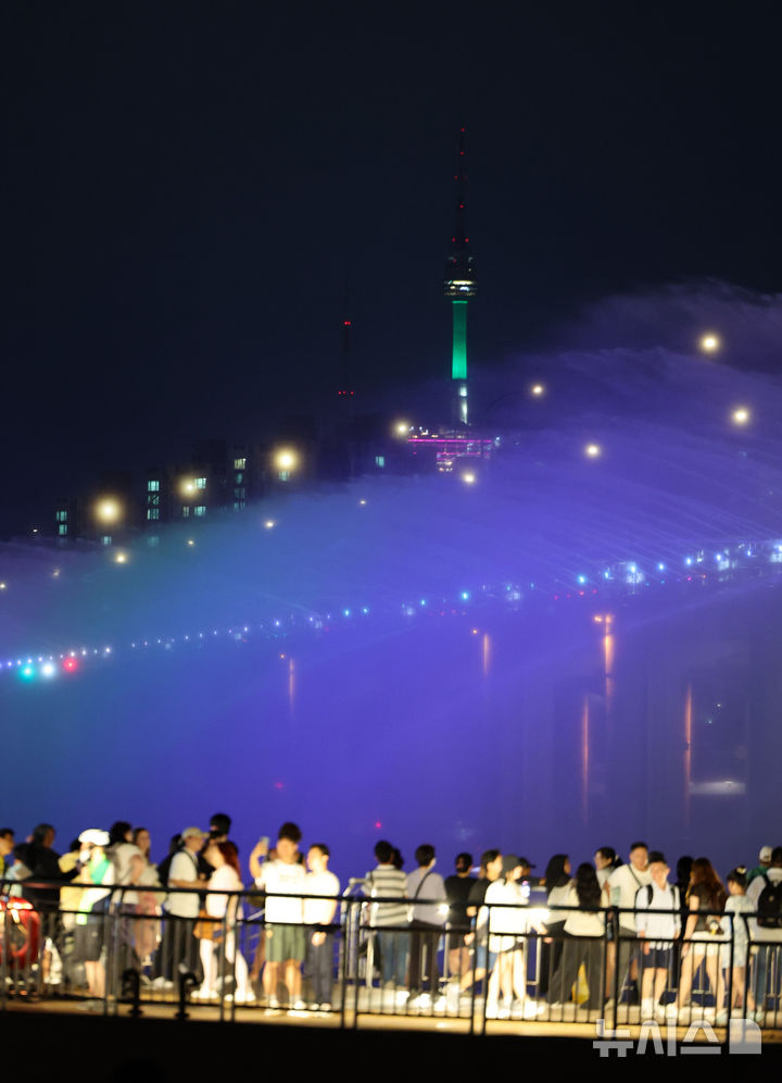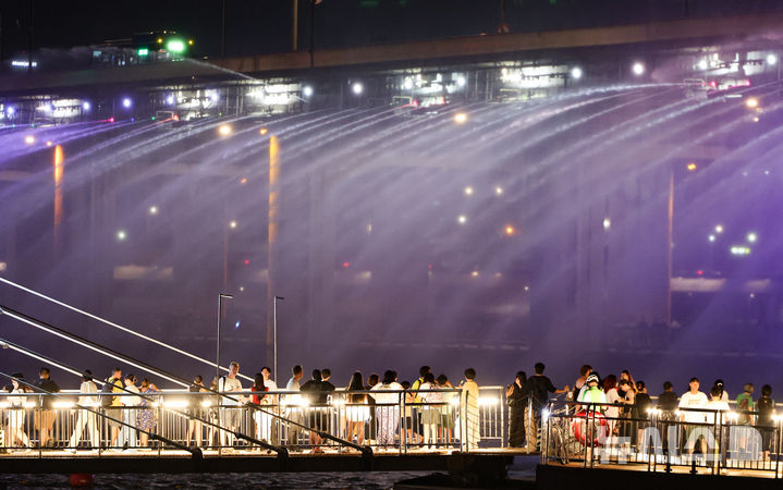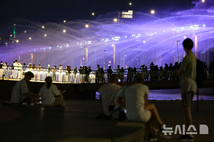 【NEWSIS】ソウルで熱帯夜が観測史上最長記録を更新中の18日午後、ソウル市瑞草区の盤浦漢江公園を訪れた人々。盤浦大橋の「月光虹噴水ショー」を楽しんだ。
