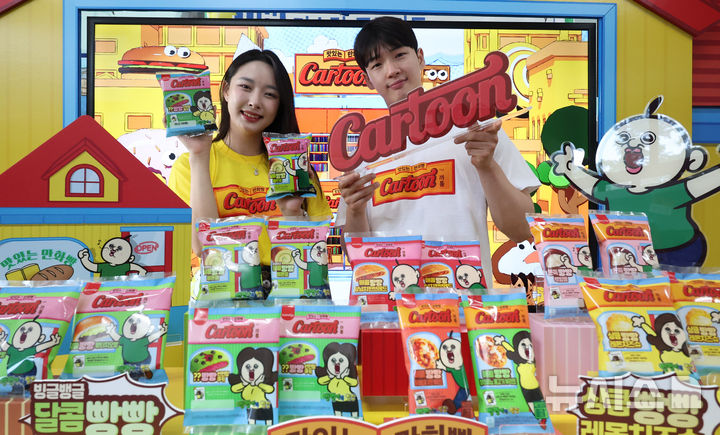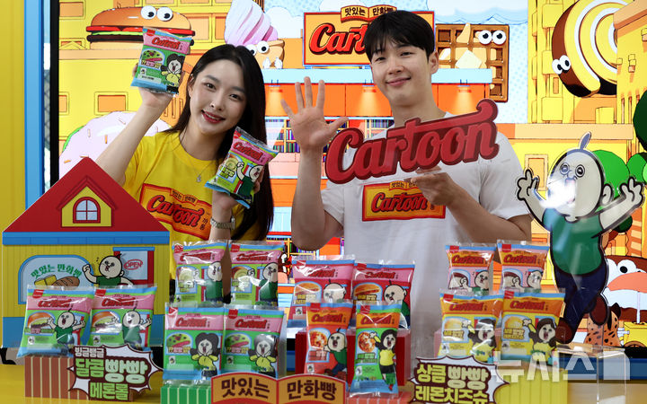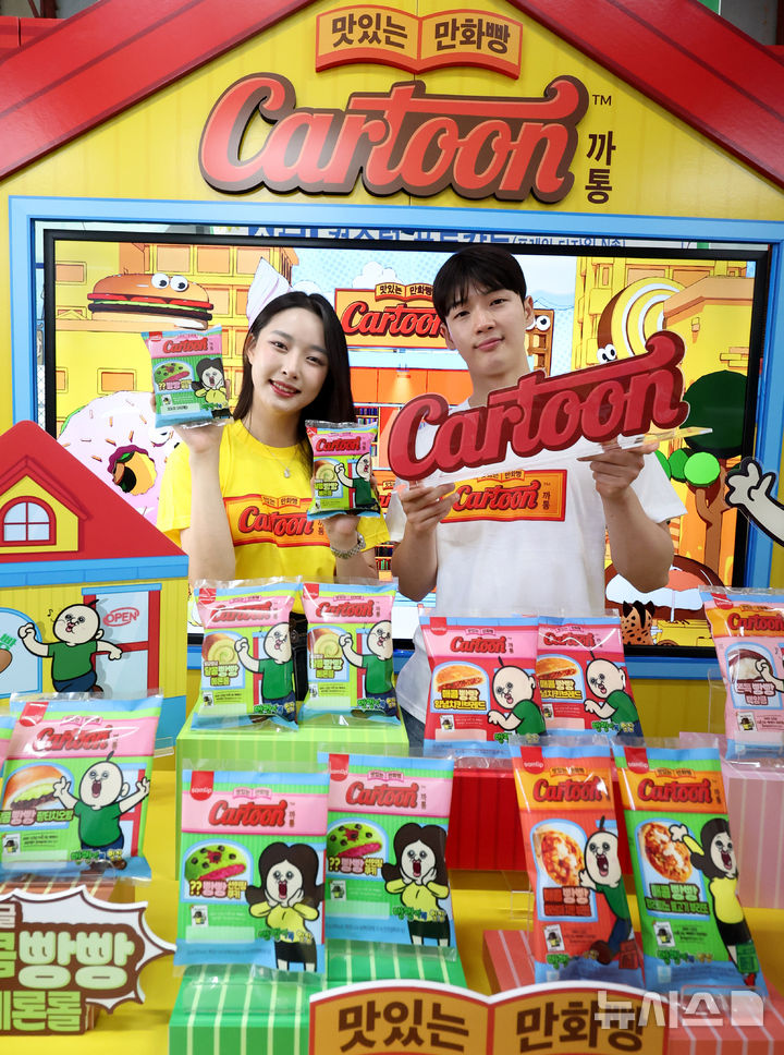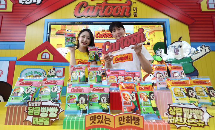 19日午前、ソウル市江南区の「パンパンとオクジの萬物相」ポップアップストアで、「SPC三立×パンパンくんの日常」の新製品8種類をPRするコンパニオンの様子。