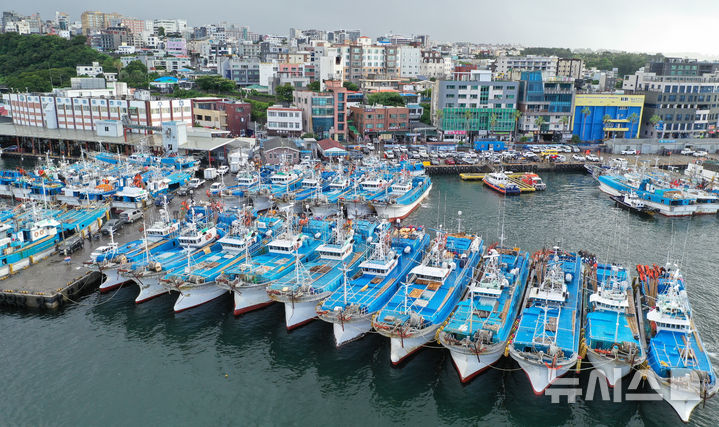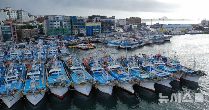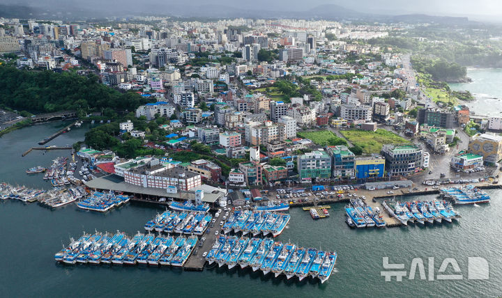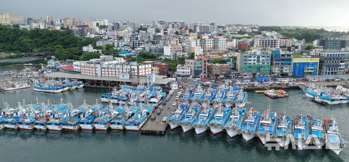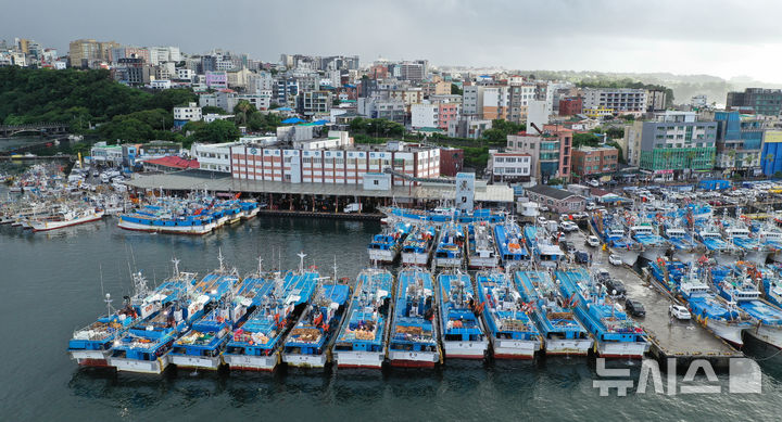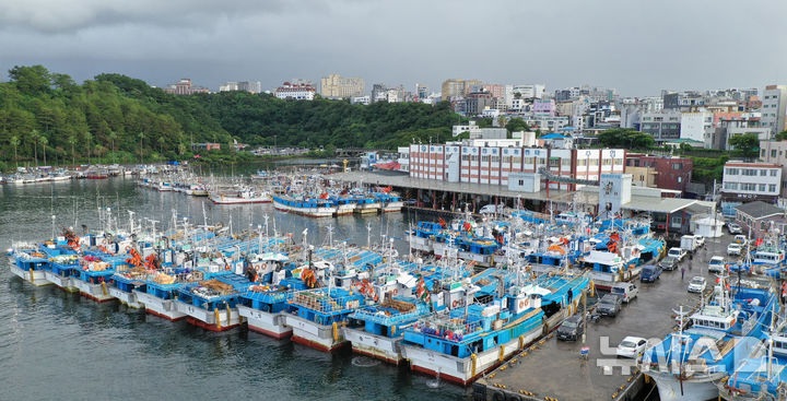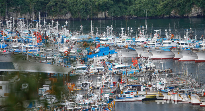 【NEWSIS】台風9号「JONGDARI(ジョンダリ、ひばりの意)」が北上中の20日午前、済州特別自治道西帰浦市内の西帰浦港で、台風に備えて避難している漁船の様子。