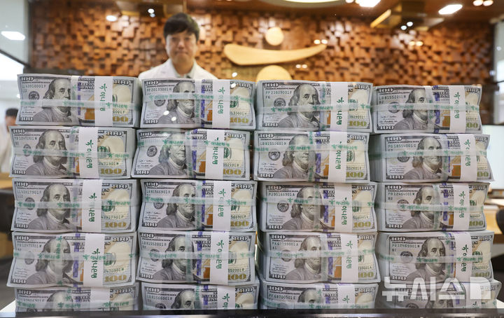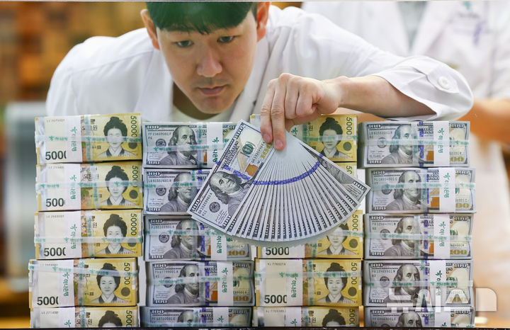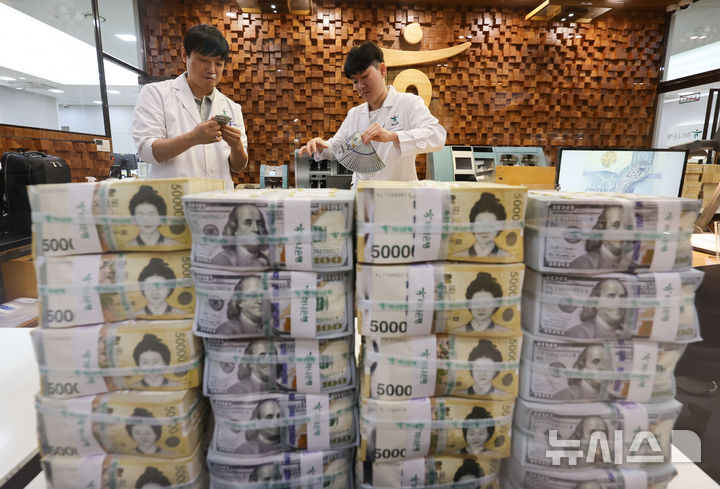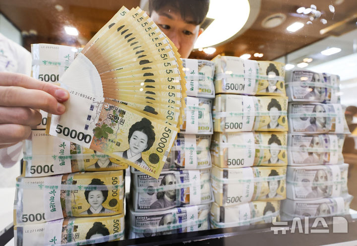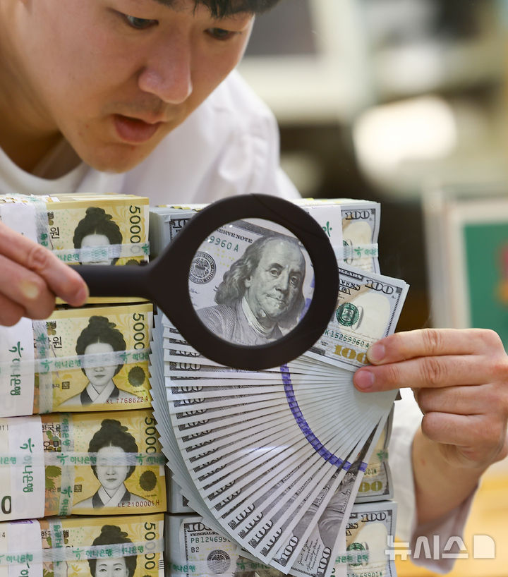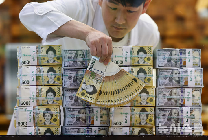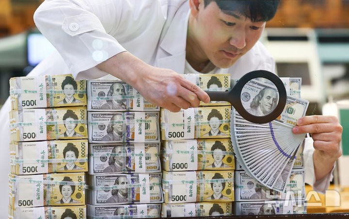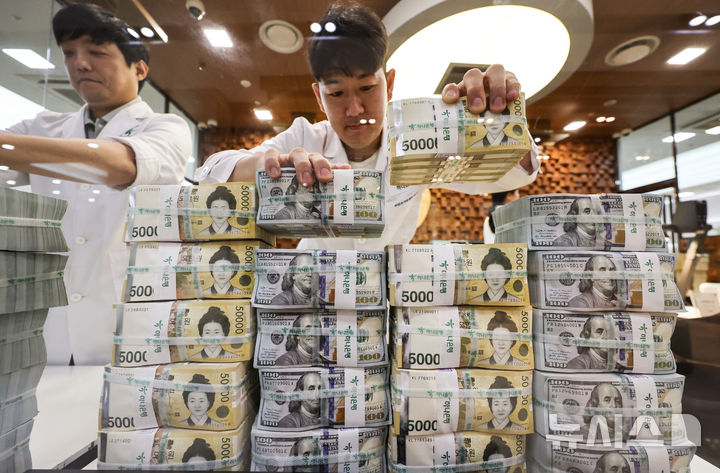 ソウル市中区のハナ銀行偽変造対応センターで20日、行員がウォン紙幣を手にしている様子。