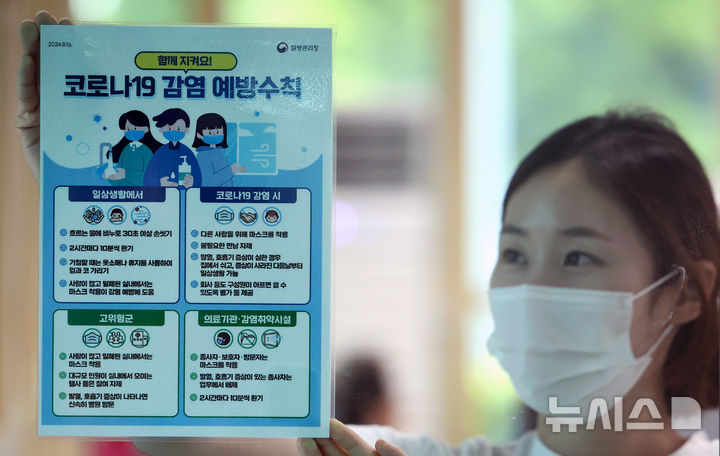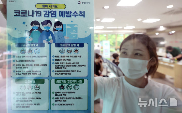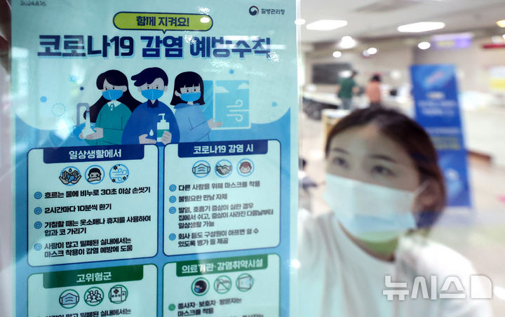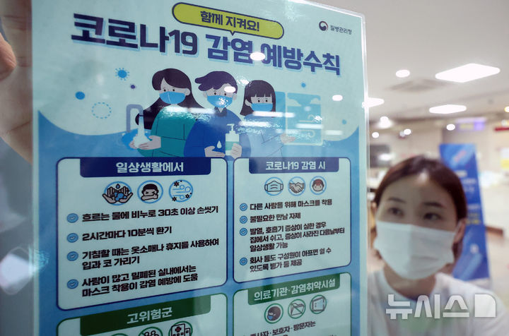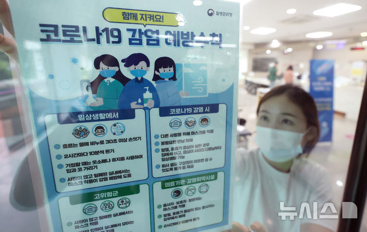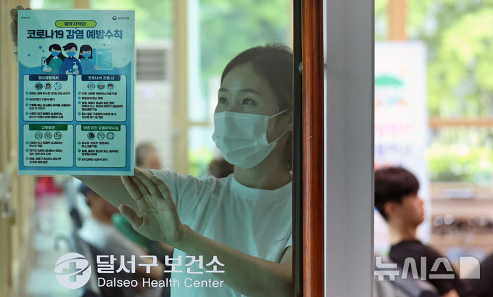 【NEWSIS】新型コロナ患者が増える中、20日に大邱市達西区保健所では、感染病対応チームの職員が新型コロナ感染予防守則に関する広報物を張り出していた。