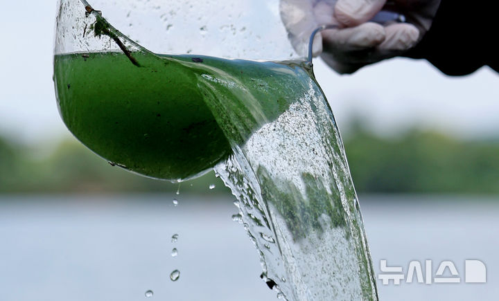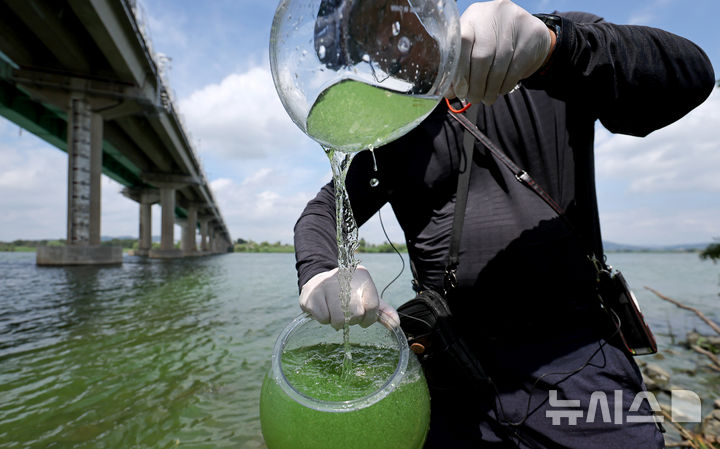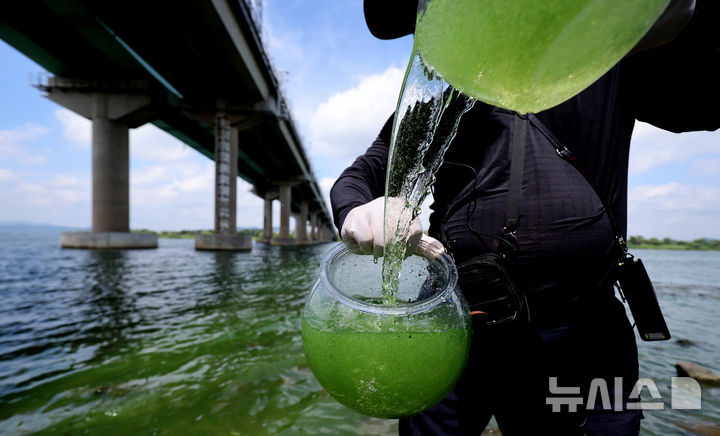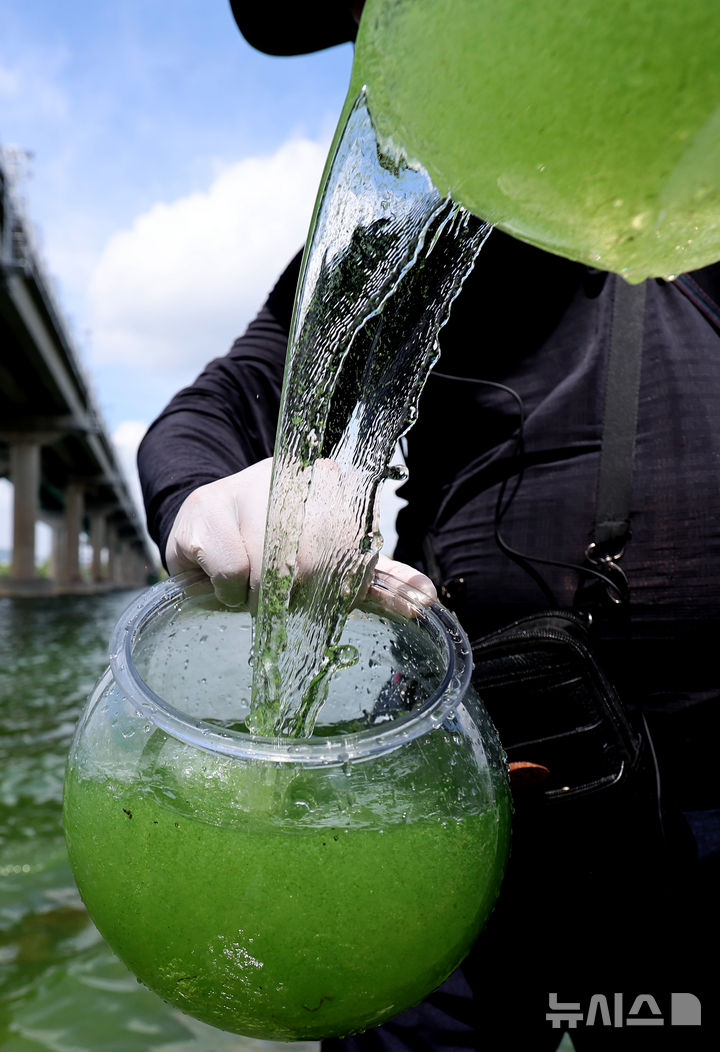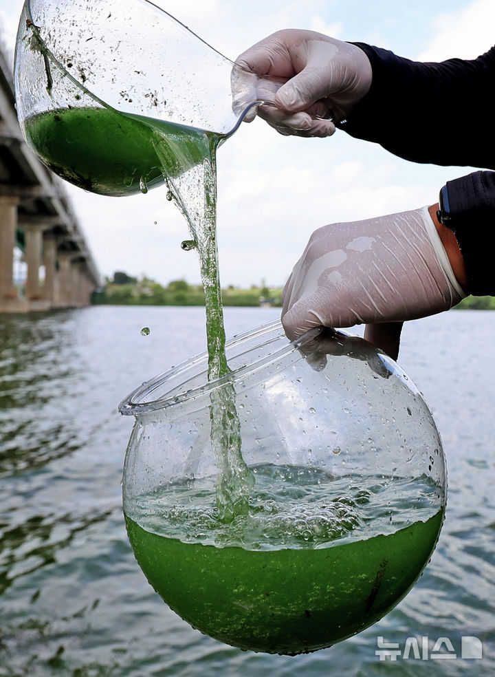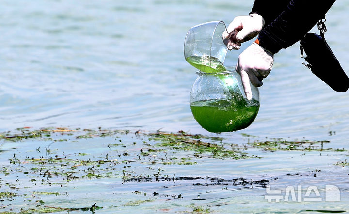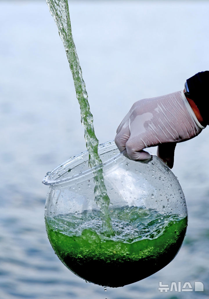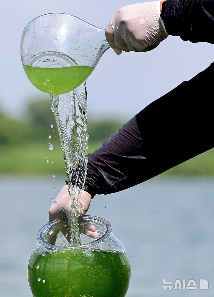 大邱市達城郡の花園遊園地で20日、大邱環境運動連合の関係者が洛東江のアオコ発生現場を調査するため、川で採水作業を行った。