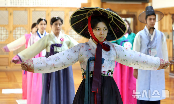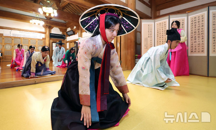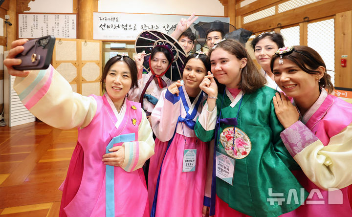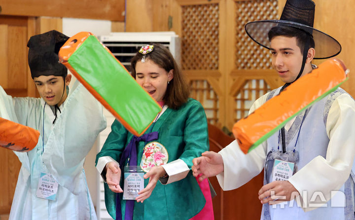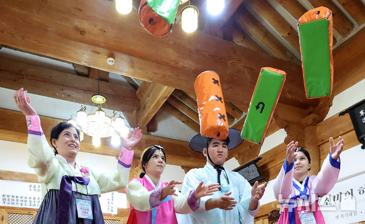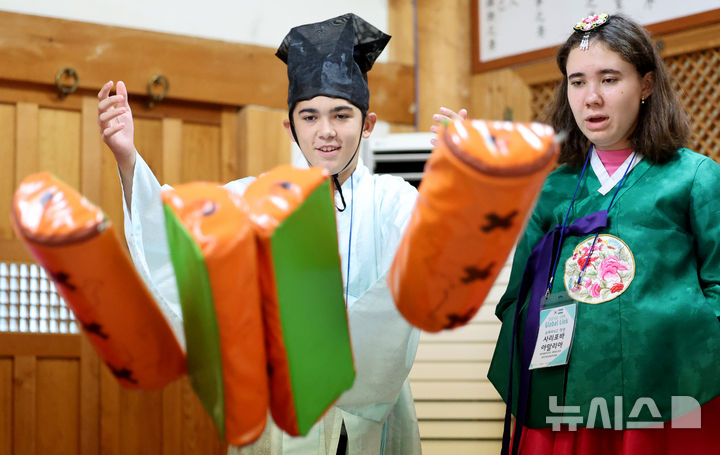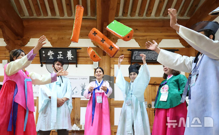 大邱市達西区の屏岩書院で22日、グローバル青少年韓国伝統文化体験が行われ、参加したウズベキスタン出身の学生たちが韓服(韓国の伝統衣装)を着飾ってユンノリ(韓国のすごろく)を楽しんだ。