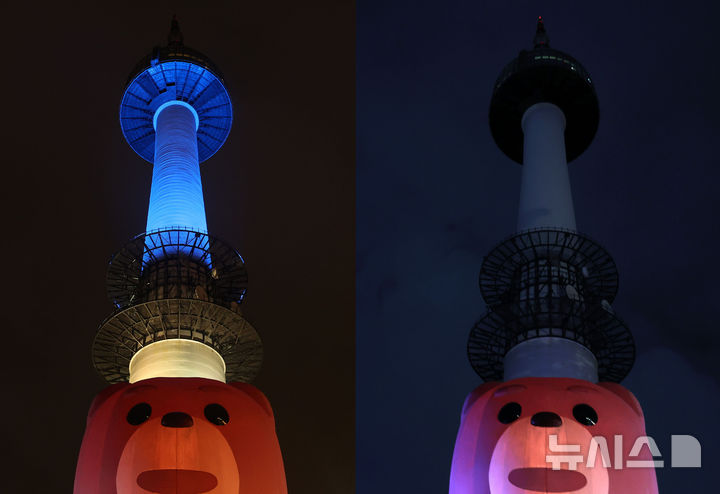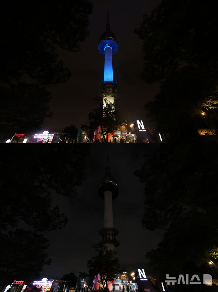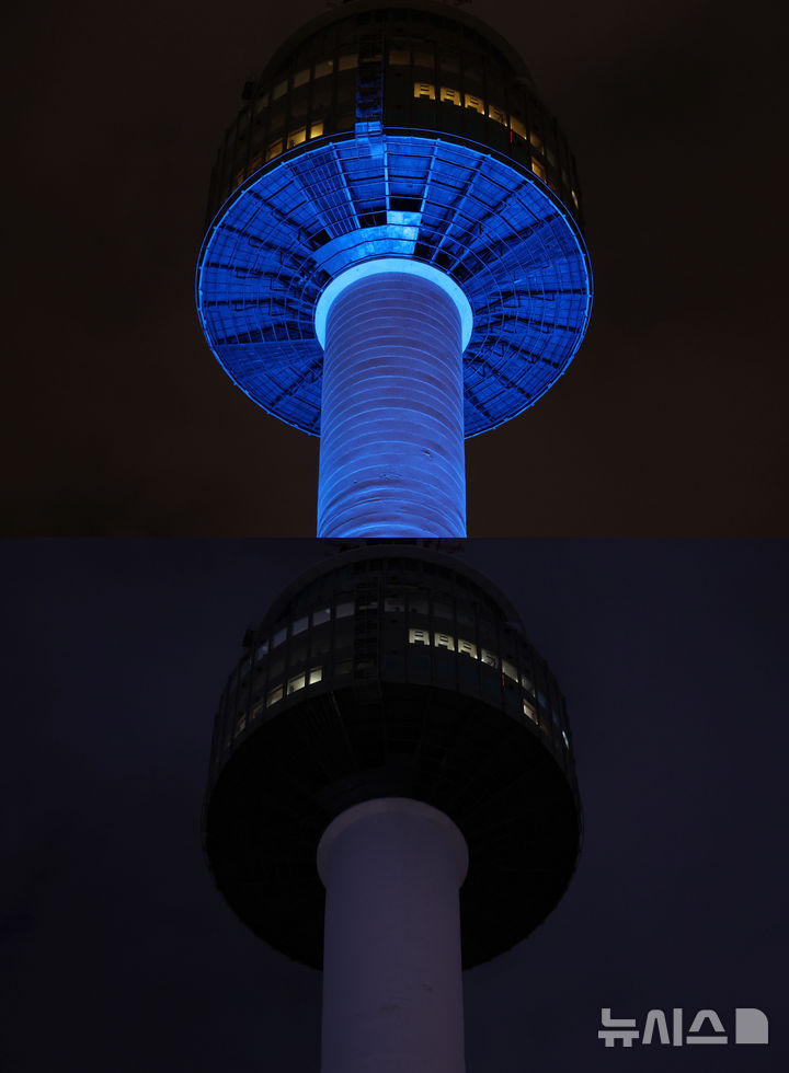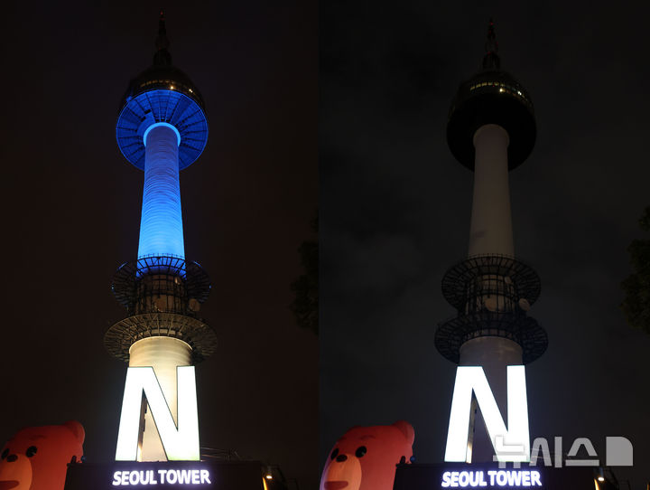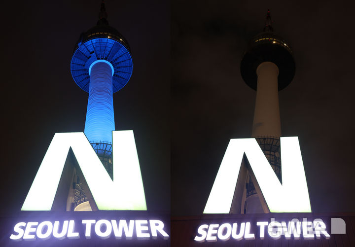 【NEWSIS】「第21回エネルギーの日」だった22日、ソウル市竜山区のNソウルタワーの照明が夜9時から5分間消された。写真は消灯前と消灯後のNソウルタワーの様子。