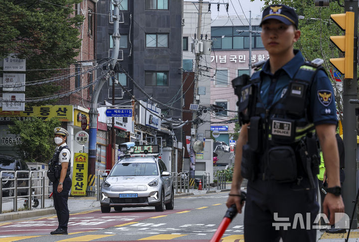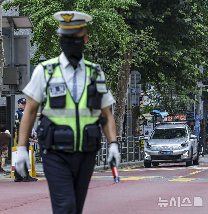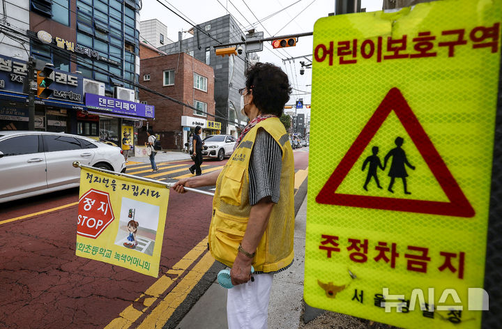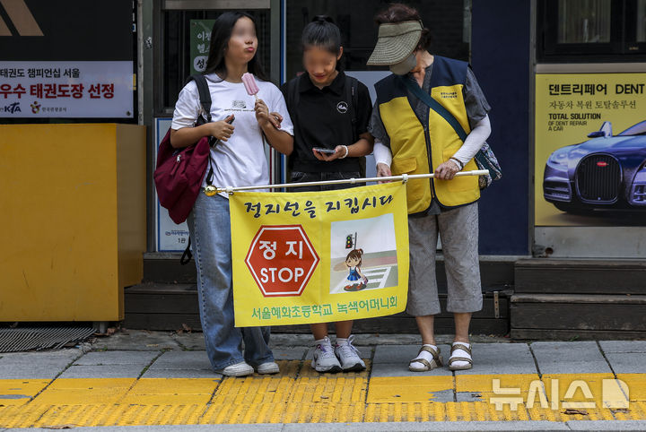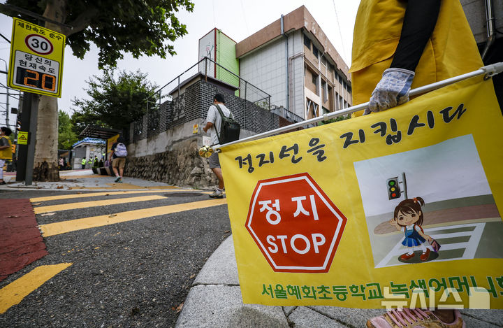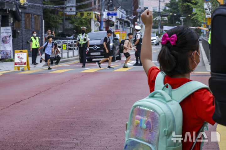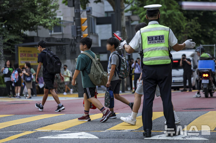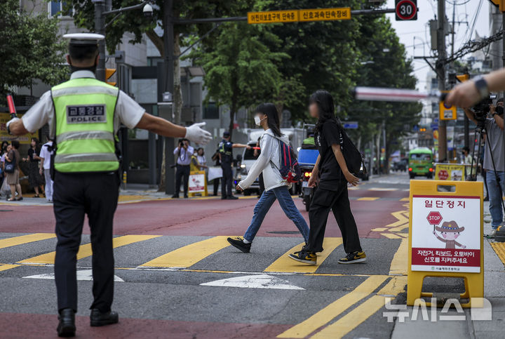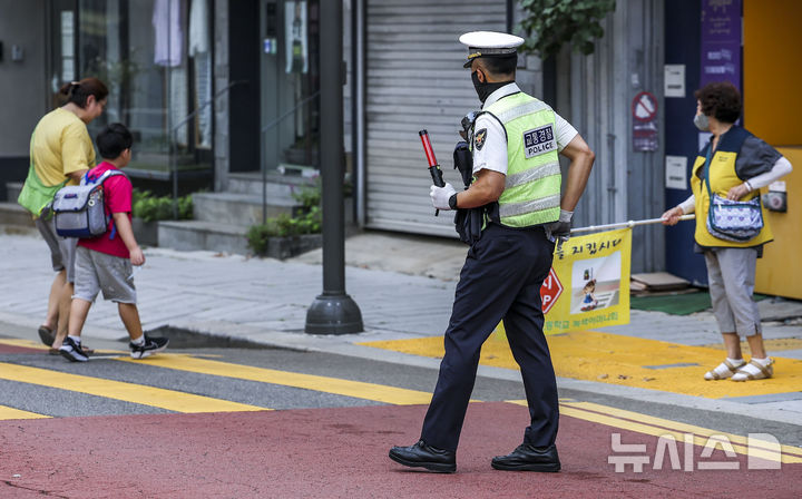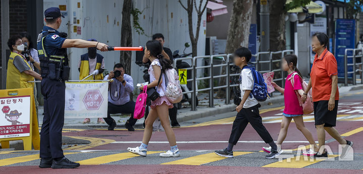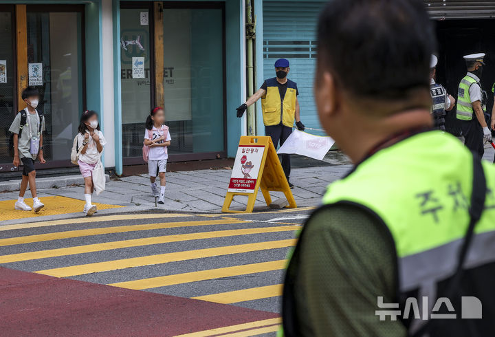 【NEWSIS】26日、ソウル市鍾路区の恵化小学校前で2学期の始業式を迎えるにあたり、子ども保護区域交通法規違反集中取り締まりを実施する警察官、ソウル市庁職員、恵化小学校「緑の母」のメンバーたち。